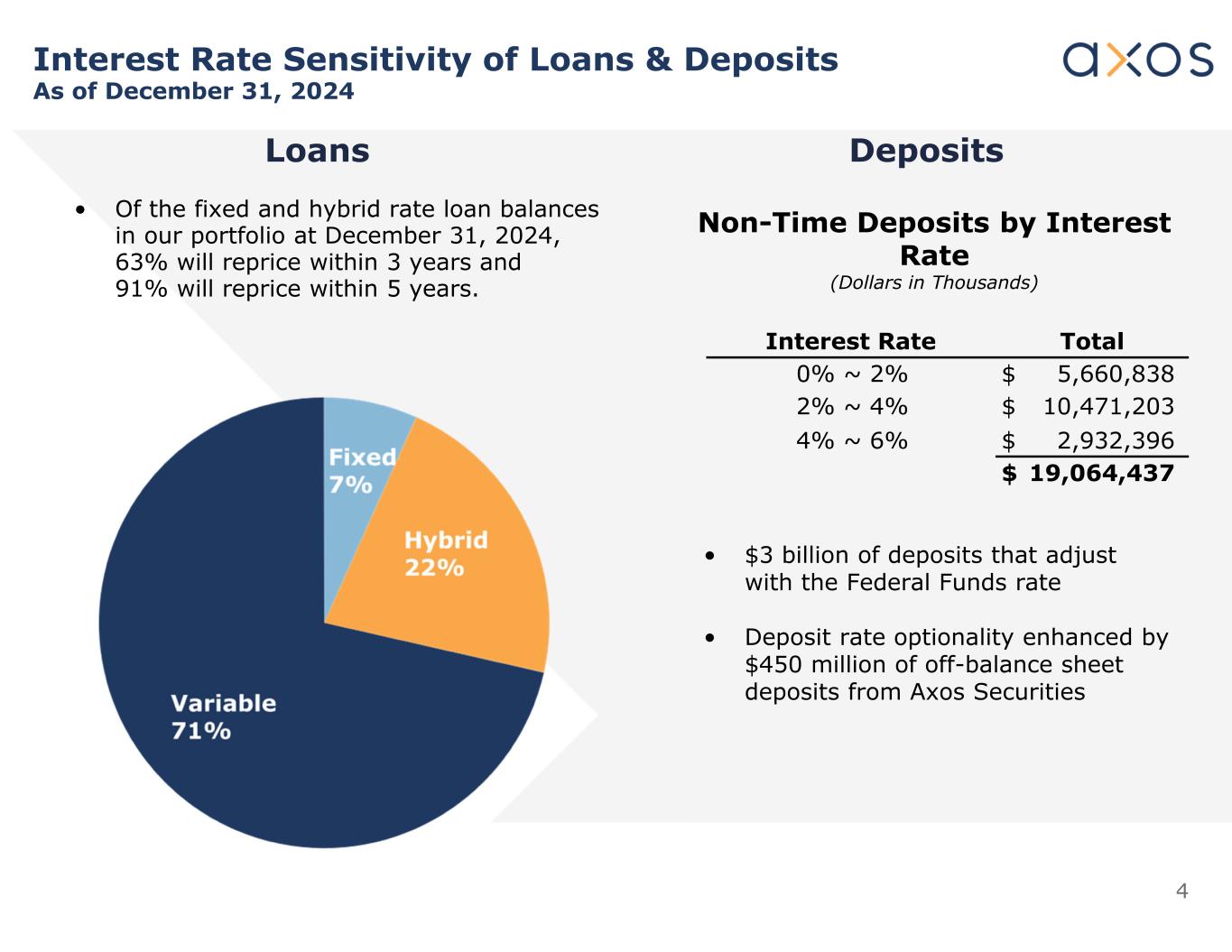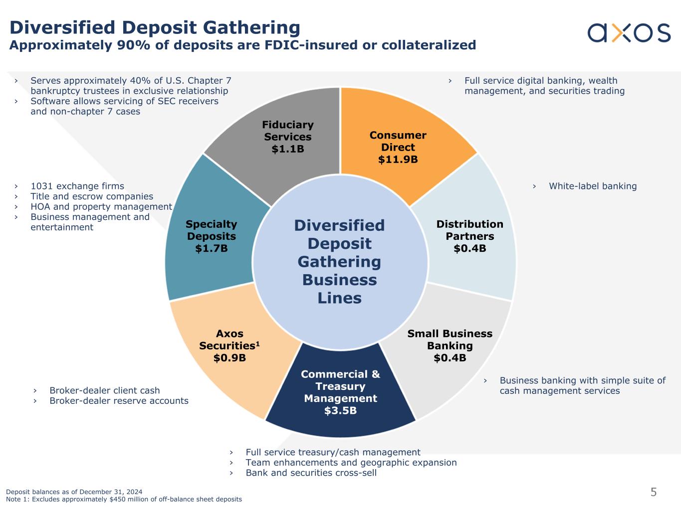 4 DepositsLoans Interest Rate Sensitivity of Loans & Deposits As of December 31, 2024 TotalInterest Rate $ 5,660,8380% ~ 2% $ 10,471,2032% ~ 4% $ 2,932,3964% ~ 6% $ 19,064,437 Non-Time Deposits by Interest Rate (Dollars in Thousands) • $3 billion of deposits that adjust with the Federal Funds rate • Deposit rate optionality enhanced by $450 million of off-balance sheet deposits from Axos Securities • Of the fixed and hybrid rate loan balances in our portfolio at December 31, 2024, 63% will reprice within 3 years and 91% will reprice within 5 years.