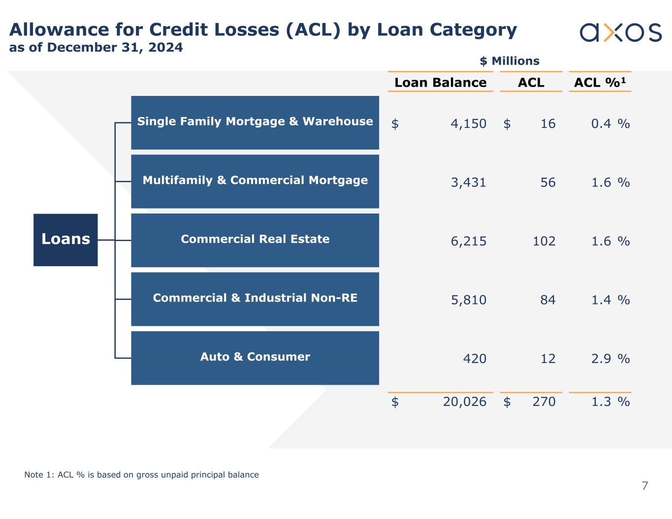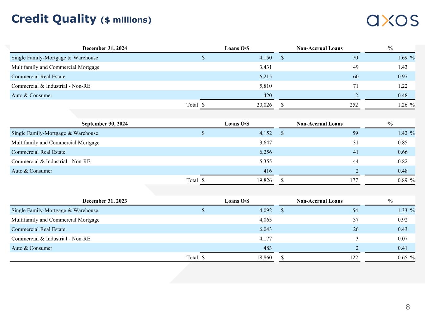 7 Allowance for Credit Losses (ACL) by Loan Category as of December 31, 2024 $ Millions ACL %1ACLLoan Balance 0.4 %$ 16$ 4,150 1.6 %563,431 1.6 %1026,215 1.4 %845,810 2.9 %12420 1.3 %$ 270$ 20,026 Single Family Mortgage & Warehouse Multifamily & Commercial Mortgage Commercial Real Estate Commercial & Industrial Non-RE Auto & Consumer Loans Note 1: ACL % is based on gross unpaid principal balance