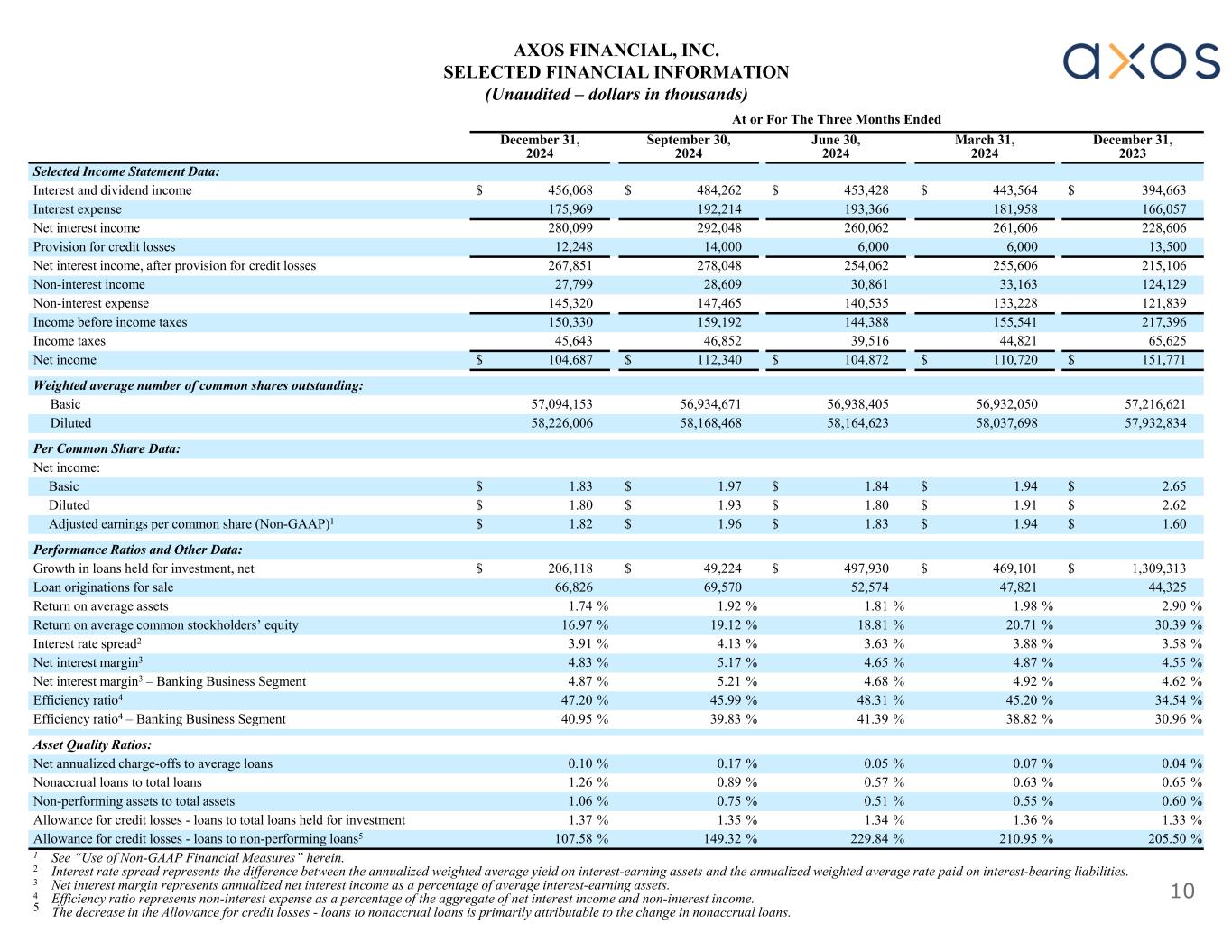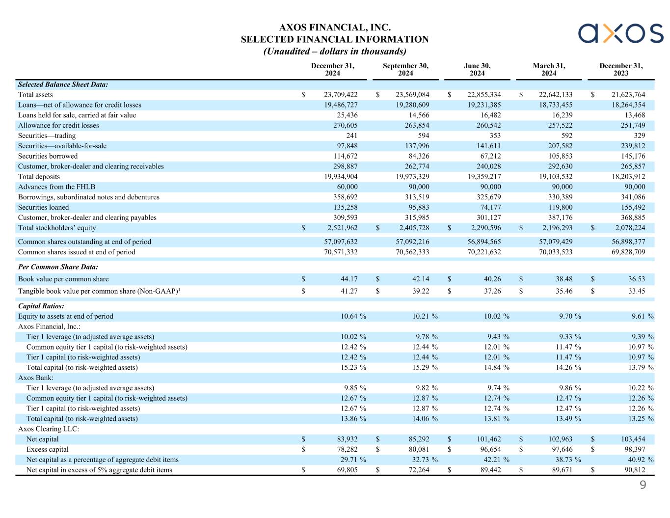 9 December 31, 2023 March 31, 2024 June 30, 2024 September 30, 2024 December 31, 2024 Selected Balance Sheet Data: $ 21,623,764$ 22,642,133$ 22,855,334$ 23,569,084$ 23,709,422Total assets 18,264,35418,733,45519,231,38519,280,60919,486,727Loans—net of allowance for credit losses 13,46816,23916,48214,56625,436Loans held for sale, carried at fair value 251,749257,522260,542263,854270,605Allowance for credit losses 329592353594241Securities—trading 239,812207,582141,611137,99697,848Securities—available-for-sale 145,176105,85367,21284,326114,672Securities borrowed 265,857292,630240,028262,774298,887Customer, broker-dealer and clearing receivables 18,203,91219,103,53219,359,21719,973,32919,934,904Total deposits 90,00090,00090,00090,00060,000Advances from the FHLB 341,086330,389325,679313,519358,692Borrowings, subordinated notes and debentures 155,492119,80074,17795,883135,258Securities loaned 368,885387,176301,127315,985309,593Customer, broker-dealer and clearing payables $ 2,078,224$ 2,196,293$ 2,290,596$ 2,405,728$ 2,521,962Total stockholders’ equity 56,898,37757,079,42956,894,56557,092,21657,097,632Common shares outstanding at end of period 69,828,70970,033,52370,221,63270,562,33370,571,332Common shares issued at end of period Per Common Share Data: $ 36.53$ 38.48$ 40.26$ 42.14$ 44.17Book value per common share $ 33.45$ 35.46$ 37.26$ 39.22$ 41.27Tangible book value per common share (Non-GAAP)1 Capital Ratios: 9.61 %9.70 %10.02 %10.21 %10.64 %Equity to assets at end of period Axos Financial, Inc.: 9.39 %9.33 %9.43 %9.78 %10.02 %Tier 1 leverage (to adjusted average assets) 10.97 %11.47 %12.01 %12.44 %12.42 %Common equity tier 1 capital (to risk-weighted assets) 10.97 %11.47 %12.01 %12.44 %12.42 %Tier 1 capital (to risk-weighted assets) 13.79 %14.26 %14.84 %15.29 %15.23 %Total capital (to risk-weighted assets) Axos Bank: 10.22 %9.86 %9.74 %9.82 %9.85 %Tier 1 leverage (to adjusted average assets) 12.26 %12.47 %12.74 %12.87 %12.67 %Common equity tier 1 capital (to risk-weighted assets) 12.26 %12.47 %12.74 %12.87 %12.67 %Tier 1 capital (to risk-weighted assets) 13.25 %13.49 %13.81 %14.06 %13.86 %Total capital (to risk-weighted assets) Axos Clearing LLC: $ 103,454$ 102,963$ 101,462$ 85,292$ 83,932Net capital $ 98,397$ 97,646$ 96,654$ 80,081$ 78,282Excess capital 40.92 %38.73 %42.21 %32.73 %29.71 %Net capital as a percentage of aggregate debit items $ 90,812$ 89,671$ 89,442$ 72,264$ 69,805Net capital in excess of 5% aggregate debit items AXOS FINANCIAL, INC. SELECTED FINANCIAL INFORMATION (Unaudited – dollars in thousands)