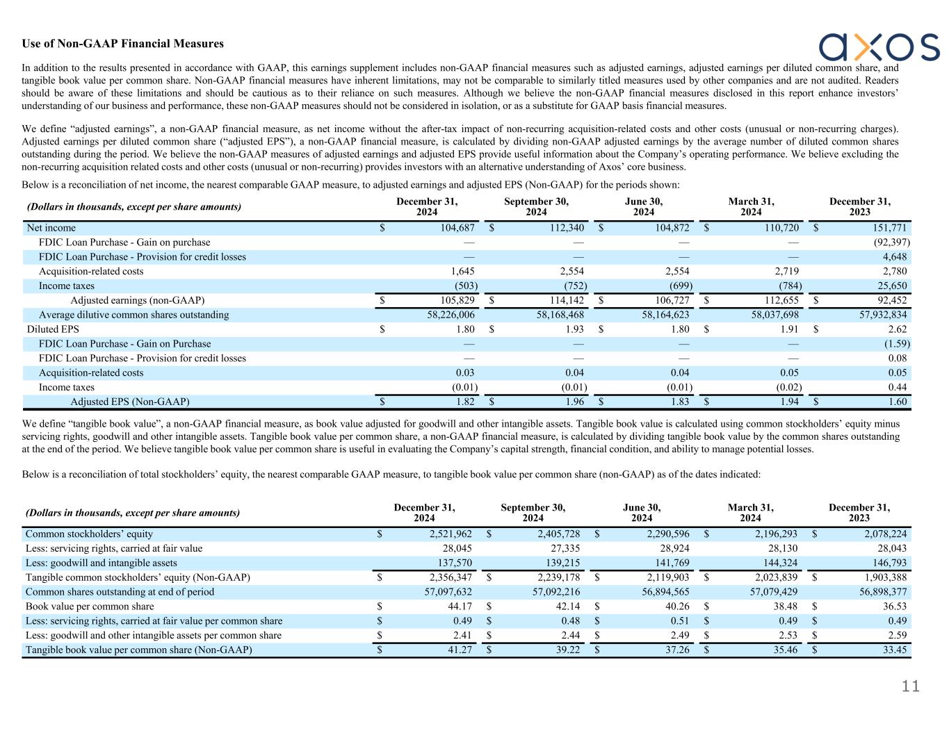 11 December 31, 2023 March 31, 2024 June 30, 2024 September 30, 2024 December 31, 2024(Dollars in thousands, except per share amounts) $ 151,771$ 110,720$ 104,872$ 112,340$ 104,687Net income (92,397)————FDIC Loan Purchase - Gain on purchase 4,648————FDIC Loan Purchase - Provision for credit losses 2,7802,7192,5542,5541,645Acquisition-related costs 25,650(784)(699)(752)(503)Income taxes $ 92,452$ 112,655$ 106,727$ 114,142$ 105,829Adjusted earnings (non-GAAP) 57,932,83458,037,69858,164,62358,168,46858,226,006Average dilutive common shares outstanding $ 2.62$ 1.91$ 1.80$ 1.93$ 1.80Diluted EPS (1.59)————FDIC Loan Purchase - Gain on Purchase 0.08————FDIC Loan Purchase - Provision for credit losses 0.050.050.040.040.03Acquisition-related costs 0.44(0.02)(0.01)(0.01)(0.01)Income taxes $ 1.60$ 1.94$ 1.83$ 1.96$ 1.82Adjusted EPS (Non-GAAP) We define “tangible book value”, a non-GAAP financial measure, as book value adjusted for goodwill and other intangible assets. Tangible book value is calculated using common stockholders’ equity minus servicing rights, goodwill and other intangible assets. Tangible book value per common share, a non-GAAP financial measure, is calculated by dividing tangible book value by the common shares outstanding at the end of the period. We believe tangible book value per common share is useful in evaluating the Company’s capital strength, financial condition, and ability to manage potential losses. Below is a reconciliation of total stockholders’ equity, the nearest comparable GAAP measure, to tangible book value per common share (non-GAAP) as of the dates indicated: December 31, 2023 March 31, 2024 June 30, 2024 September 30, 2024 December 31, 2024(Dollars in thousands, except per share amounts) $ 2,078,224$ 2,196,293$ 2,290,596$ 2,405,728$ 2,521,962Common stockholders’ equity 28,04328,13028,92427,33528,045Less: servicing rights, carried at fair value 146,793144,324141,769139,215137,570Less: goodwill and intangible assets $ 1,903,388$ 2,023,839$ 2,119,903$ 2,239,178$ 2,356,347Tangible common stockholders’ equity (Non-GAAP) 56,898,37757,079,42956,894,56557,092,21657,097,632Common shares outstanding at end of period $ 36.53$ 38.48$ 40.26$ 42.14$ 44.17Book value per common share $ 0.49$ 0.49$ 0.51$ 0.48$ 0.49Less: servicing rights, carried at fair value per common share $ 2.59$ 2.53$ 2.49$ 2.44$ 2.41Less: goodwill and other intangible assets per common share $ 33.45$ 35.46$ 37.26$ 39.22$ 41.27Tangible book value per common share (Non-GAAP) Use of Non-GAAP Financial Measures In addition to the results presented in accordance with GAAP, this earnings supplement includes non-GAAP financial measures such as adjusted earnings, adjusted earnings per diluted common share, and tangible book value per common share. Non-GAAP financial measures have inherent limitations, may not be comparable to similarly titled measures used by other companies and are not audited. Readers should be aware of these limitations and should be cautious as to their reliance on such measures. Although we believe the non-GAAP financial measures disclosed in this report enhance investors’ understanding of our business and performance, these non-GAAP measures should not be considered in isolation, or as a substitute for GAAP basis financial measures. We define “adjusted earnings”, a non-GAAP financial measure, as net income without the after-tax impact of non-recurring acquisition-related costs and other costs (unusual or non-recurring charges). Adjusted earnings per diluted common share (“adjusted EPS”), a non-GAAP financial measure, is calculated by dividing non-GAAP adjusted earnings by the average number of diluted common shares outstanding during the period. We believe the non-GAAP measures of adjusted earnings and adjusted EPS provide useful information about the Company’s operating performance. We believe excluding the non-recurring acquisition related costs and other costs (unusual or non-recurring) provides investors with an alternative understanding of Axos’ core business. Below is a reconciliation of net income, the nearest comparable GAAP measure, to adjusted earnings and adjusted EPS (Non-GAAP) for the periods shown: