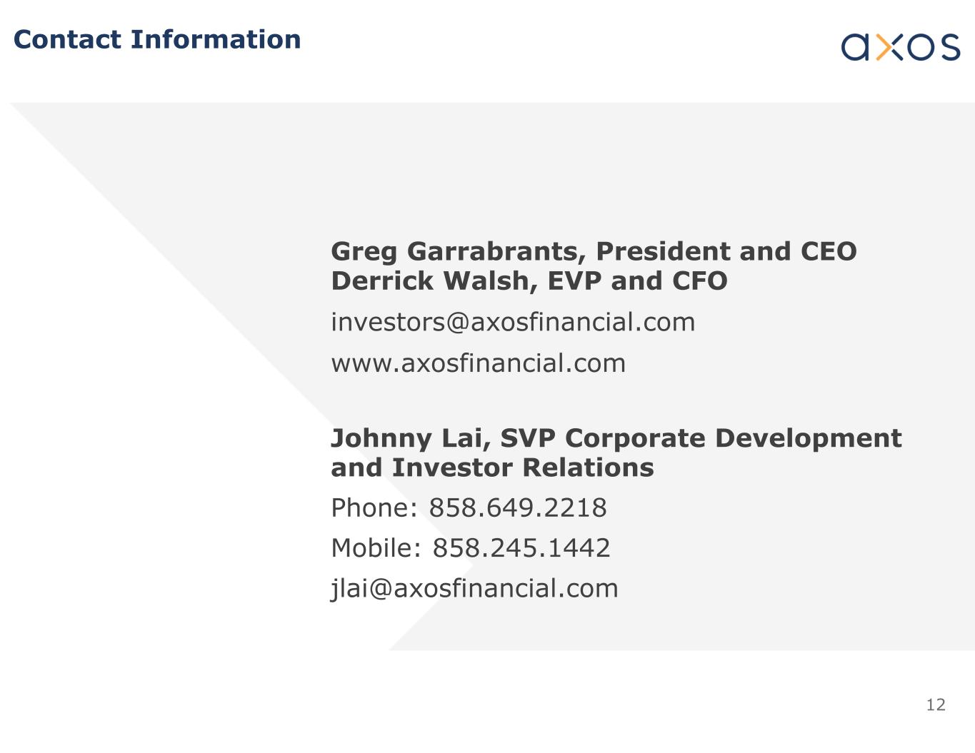 12 Greg Garrabrants, President and CEO Derrick Walsh, EVP and CFO investors@axosfinancial.com www.axosfinancial.com Johnny Lai, SVP Corporate Development and Investor Relations Phone: 858.649.2218 Mobile: 858.245.1442 jlai@axosfinancial.com Contact Information