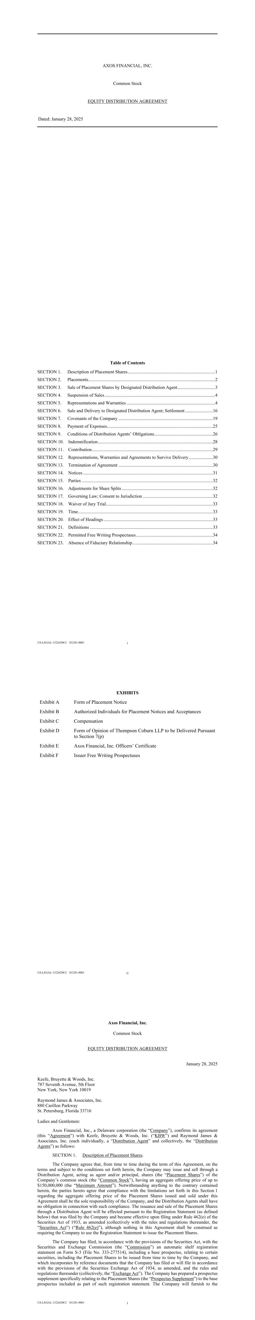 AXOS FINANCIAL, INC. Common Stock EQUITY DISTRIBUTION AGREEMENT Dated: January 28, 2025 US-LEGAL-13226288/2 181281-0001 i Table of Contents SECTION 1.  Description of Placement Shares ............................................................................ 1  SECTION 2.  Placements .............................................................................................................. 2  SECTION 3.  Sale of Placement Shares by Designated Distribution Agent ................................. 3  SECTION 4.  Suspension of Sales ................................................................................................ 4  SECTION 5.  Representations and Warranties ............................................................................. 4  SECTION 6.  Sale and Delivery to Designated Distribution Agent; Settlement ........................ 16  SECTION 7.  Covenants of the Company .................................................................................. 19  SECTION 8.  Payment of Expenses ............................................................................................ 25  SECTION 9.  Conditions of Distribution Agents’ Obligations ................................................... 26  SECTION 10.  Indemnification .................................................................................................... 28  SECTION 11.  Contribution ......................................................................................................... 29  SECTION 12.  Representations, Warranties and Agreements to Survive Delivery ..................... 30  SECTION 13.  Termination of Agreement .................................................................................. 30  SECTION 14.  Notices ................................................................................................................. 31  SECTION 15.  Parties .................................................................................................................. 32  SECTION 16.  Adjustments for Share Splits ............................................................................... 32  SECTION 17.  Governing Law; Consent to Jurisdiction ............................................................. 32  SECTION 18.  Waiver of Jury Trial............................................................................................. 33  SECTION 19.  Time ..................................................................................................................... 33  SECTION 20.  Effect of Headings ............................................................................................... 33  SECTION 21.  Definitions ........................................................................................................... 33  SECTION 22.  Permitted Free Writing Prospectuses ................................................................... 34  SECTION 23.  Absence of Fiduciary Relationship ...................................................................... 34  US-LEGAL-13226288/2 181281-0001 ii EXHIBITS Exhibit A Form of Placement Notice Exhibit B Authorized Individuals for Placement Notices and Acceptances Exhibit C Compensation Exhibit D Form of Opinion of Thompson Coburn LLP to be Delivered Pursuant to Section 7(p) Exhibit E Axos Financial, Inc. Officers’ Certificate Exhibit F Issuer Free Writing Prospectuses US-LEGAL-13226288/2 181281-0001 1 Axos Financial, Inc. Common Stock EQUITY DISTRIBUTION AGREEMENT January 28, 2025 Keefe, Bruyette & Woods, Inc. 787 Seventh Avenue, 5th Floor New York, New York 10019 Raymond James & Associates, Inc. 880 Carillon Parkway St. Petersburg, Florida 33716 Ladies and Gentlemen: Axos Financial, Inc., a Delaware corporation (the “Company”), confirms its agreement (this “Agreement”) with Keefe, Bruyette & Woods, Inc. (“KBW”) and Raymond James & Associates, Inc. (each individually, a “Distribution Agent” and collectively, the “Distribution Agents”) as follows: SECTION 1. Description of Placement Shares. The Company agrees that, from time to time during the term of this Agreement, on the terms and subject to the conditions set forth herein, the Company may issue and sell through a Distribution Agent, acting as agent and/or principal, shares (the “Placement Shares”) of the Company’s common stock (the “Common Stock”), having an aggregate offering price of up to $150,000,000 (the “Maximum Amount”). Notwithstanding anything to the contrary contained herein, the parties hereto agree that compliance with the limitations set forth in this Section 1 regarding the aggregate offering price of the Placement Shares issued and sold under this Agreement shall be the sole responsibility of the Company, and the Distribution Agents shall have no obligation in connection with such compliance. The issuance and sale of the Placement Shares through a Distribution Agent will be effected pursuant to the Registration Statement (as defined below) that was filed by the Company and became effective upon filing under Rule 462(e) of the Securities Act of 1933, as amended (collectively with the rules and regulations thereunder, the “Securities Act”) (“Rule 462(e)”), although nothing in this Agreement shall be construed as requiring the Company to use the Registration Statement to issue the Placement Shares. The Company has filed, in accordance with the provisions of the Securities Act, with the Securities and Exchange Commission (the “Commission”) an automatic shelf registration statement on Form S-3 (File No. 333-277514), including a base prospectus, relating to certain securities, including the Placement Shares to be issued from time to time by the Company, and which incorporates by reference documents that the Company has filed or will file in accordance with the provisions of the Securities Exchange Act of 1934, as amended, and the rules and regulations thereunder (
