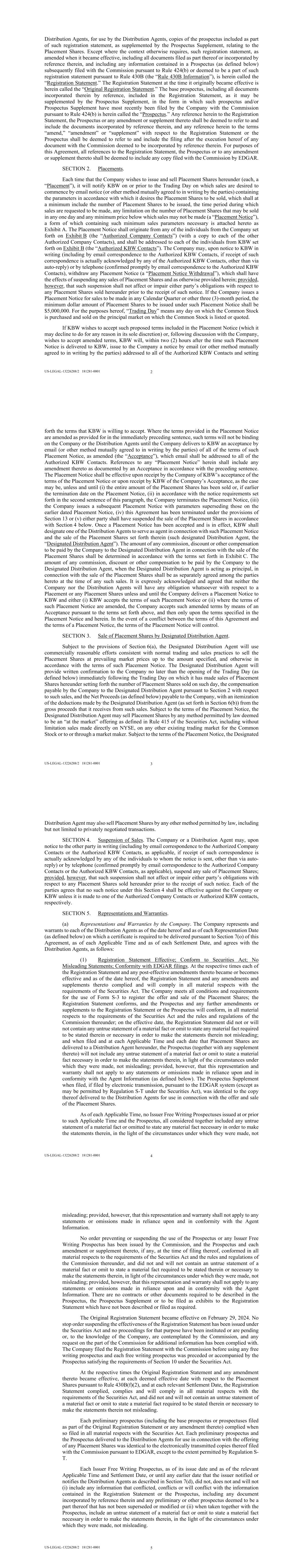 US-LEGAL-13226288/2 181281-0001 2 Distribution Agents, for use by the Distribution Agents, copies of the prospectus included as part of such registration statement, as supplemented by the Prospectus Supplement, relating to the Placement Shares. Except where the context otherwise requires, such registration statement, as amended when it became effective, including all documents filed as part thereof or incorporated by reference therein, and including any information contained in a Prospectus (as defined below) subsequently filed with the Commission pursuant to Rule 424(b) or deemed to be a part of such registration statement pursuant to Rule 430B (the “Rule 430B Information”), is herein called the “Registration Statement.” The Registration Statement at the time it originally became effective is herein called the “Original Registration Statement.” The base prospectus, including all documents incorporated therein by reference, included in the Registration Statement, as it may be supplemented by the Prospectus Supplement, in the form in which such prospectus and/or Prospectus Supplement have most recently been filed by the Company with the Commission pursuant to Rule 424(b) is herein called the “Prospectus.” Any reference herein to the Registration Statement, the Prospectus or any amendment or supplement thereto shall be deemed to refer to and include the documents incorporated by reference therein, and any reference herein to the terms “amend,” “amendment” or “supplement” with respect to the Registration Statement or the Prospectus shall be deemed to refer to and include the filing after the execution hereof of any document with the Commission deemed to be incorporated by reference therein. For purposes of this Agreement, all references to the Registration Statement, the Prospectus or to any amendment or supplement thereto shall be deemed to include any copy filed with the Commission by EDGAR. SECTION 2. Placements. Each time that the Company wishes to issue and sell Placement Shares hereunder (each, a “Placement”), it will notify KBW on or prior to the Trading Day on which sales are desired to commence by email notice (or other method mutually agreed to in writing by the parties) containing the parameters in accordance with which it desires the Placement Shares to be sold, which shall at a minimum include the number of Placement Shares to be issued, the time period during which sales are requested to be made, any limitation on the number of Placement Shares that may be sold in any one day and any minimum price below which sales may not be made (a “Placement Notice”), a form of which containing such minimum sales parameters necessary is attached hereto as Exhibit A. The Placement Notice shall originate from any of the individuals from the Company set forth on Exhibit B (the “Authorized Company Contacts”) (with a copy to each of the other Authorized Company Contacts), and shall be addressed to each of the individuals from KBW set forth on Exhibit B (the “Authorized KBW Contacts”). The Company may, upon notice to KBW in writing (including by email correspondence to the Authorized KBW Contacts, if receipt of such correspondence is actually acknowledged by any of the Authorized KBW Contacts, other than via auto-reply) or by telephone (confirmed promptly by email correspondence to the Authorized KBW Contacts), withdraw any Placement Notice (a “Placement Notice Withdrawal”), which shall have the effects of suspending any sales of Placement Shares and as otherwise provided herein; provided, however, that such suspension shall not affect or impair either party’s obligations with respect to any Placement Shares sold hereunder prior to the receipt of such notice. If the Company issues a Placement Notice for sales to be made in any Calendar Quarter or other three (3)-month period, the minimum dollar amount of Placement Shares to be issued under such Placement Notice shall be $5,000,000. For the purposes hereof, “Trading Day” means any day on which the Common Stock is purchased and sold on the principal market on which the Common Stock is listed or quoted. If KBW wishes to accept such proposed terms included in the Placement Notice (which it may decline to do for any reason in its sole discretion) or, following discussion with the Company, wishes to accept amended terms, KBW will, within two (2) hours after the time such Placement Notice is delivered to KBW, issue to the Company a notice by email (or other method mutually agreed to in writing by the parties) addressed to all of the Authorized KBW Contacts and setting US-LEGAL-13226288/2 181281-0001 3 forth the terms that KBW is willing to accept. Where the terms provided in the Placement Notice are amended as provided for in the immediately preceding sentence, such terms will not be binding on the Company or the Distribution Agents until the Company delivers to KBW an acceptance by email (or other method mutually agreed to in writing by the parties) of all of the terms of such Placement Notice, as amended (the “Acceptance”), which email shall be addressed to all of the Authorized KBW Contacts. References to any “Placement Notice” herein shall include any amendment thereto as documented by an Acceptance in accordance with the preceding sentence. The Placement Notice shall be effective upon receipt by the Company of KBW’s acceptance of the terms of the Placement Notice or upon receipt by KBW of the Company’s Acceptance, as the case may be, unless and until (i) the entire amount of the Placement Shares has been sold or, if earlier the termination date on the Placement Notice, (ii) in accordance with the notice requirements set forth in the second sentence of this paragraph, the Company terminates the Placement Notice, (iii) the Company issues a subsequent Placement Notice with parameters superseding those on the earlier dated Placement Notice, (iv) this Agreement has been terminated under t
