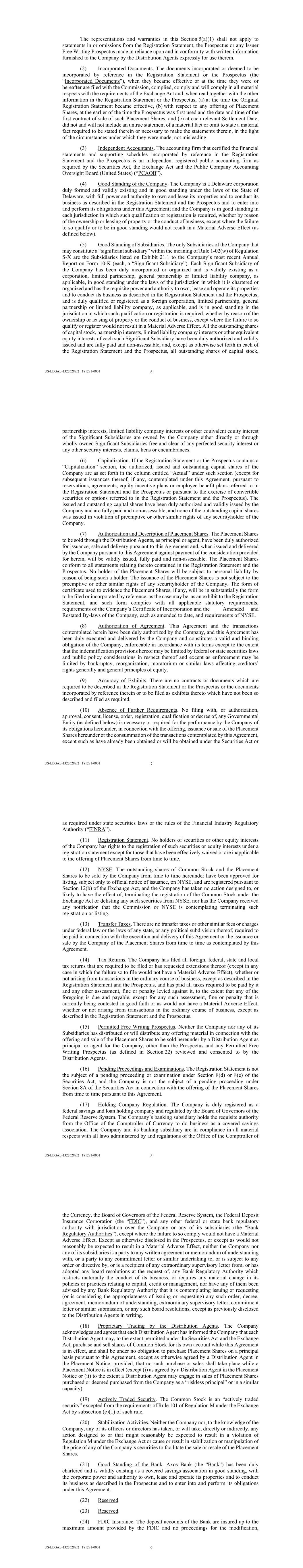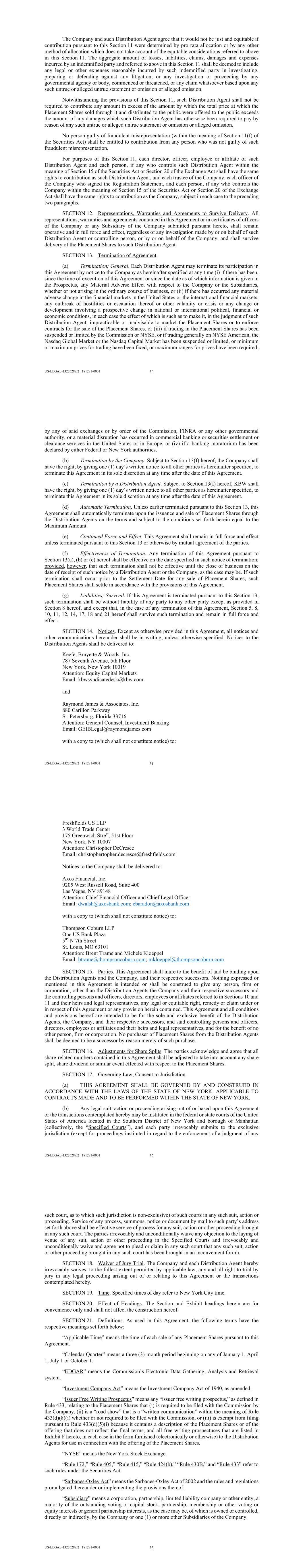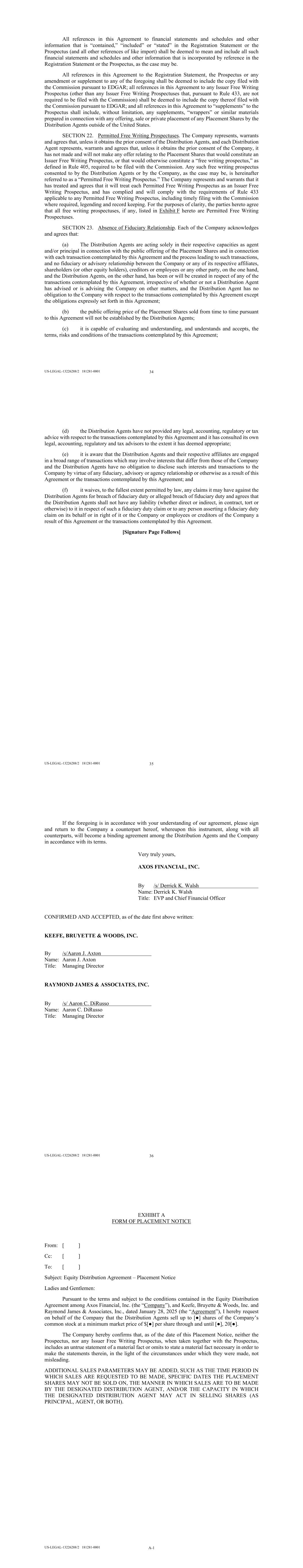 US-LEGAL-13226288/2 181281-0001 34 All references in this Agreement to financial statements and schedules and other information that is “contained,” “included” or “stated” in the Registration Statement or the Prospectus (and all other references of like import) shall be deemed to mean and include all such financial statements and schedules and other information that is incorporated by reference in the Registration Statement or the Prospectus, as the case may be. All references in this Agreement to the Registration Statement, the Prospectus or any amendment or supplement to any of the foregoing shall be deemed to include the copy filed with the Commission pursuant to EDGAR; all references in this Agreement to any Issuer Free Writing Prospectus (other than any Issuer Free Writing Prospectuses that, pursuant to Rule 433, are not required to be filed with the Commission) shall be deemed to include the copy thereof filed with the Commission pursuant to EDGAR; and all references in this Agreement to “supplements” to the Prospectus shall include, without limitation, any supplements, “wrappers” or similar materials prepared in connection with any offering, sale or private placement of any Placement Shares by the Distribution Agents outside of the United States. SECTION 22. Permitted Free Writing Prospectuses. The Company represents, warrants and agrees that, unless it obtains the prior consent of the Distribution Agents, and each Distribution Agent represents, warrants and agrees that, unless it obtains the prior consent of the Company, it has not made and will not make any offer relating to the Placement Shares that would constitute an Issuer Free Writing Prospectus, or that would otherwise constitute a “free writing prospectus,” as defined in Rule 405, required to be filed with the Commission. Any such free writing prospectus consented to by the Distribution Agents or by the Company, as the case may be, is hereinafter referred to as a “Permitted Free Writing Prospectus.” The Company represents and warrants that it has treated and agrees that it will treat each Permitted Free Writing Prospectus as an Issuer Free Writing Prospectus, and has complied and will comply with the requirements of Rule 433 applicable to any Permitted Free Writing Prospectus, including timely filing with the Commission where required, legending and record keeping. For the purposes of clarity, the parties hereto agree that all free writing prospectuses, if any, listed in Exhibit F hereto are Permitted Free Writing Prospectuses. SECTION 23. Absence of Fiduciary Relationship. Each of the Company acknowledges and agrees that: (a) The Distribution Agents are acting solely in their respective capacities as agent and/or principal in connection with the public offering of the Placement Shares and in connection with each transaction contemplated by this Agreement and the process leading to such transactions, and no fiduciary or advisory relationship between the Company or any of its respective affiliates, shareholders (or other equity holders), creditors or employees or any other party, on the one hand, and the Distribution Agents, on the other hand, has been or will be created in respect of any of the transactions contemplated by this Agreement, irrespective of whether or not a Distribution Agent has advised or is advising the Company on other matters, and the Distribution Agent has no obligation to the Company with respect to the transactions contemplated by this Agreement except the obligations expressly set forth in this Agreement; (b) the public offering price of the Placement Shares sold from time to time pursuant to this Agreement will not be established by the Distribution Agents; (c) it is capable of evaluating and understanding, and understands and accepts, the terms, risks and conditions of the transactions contemplated by this Agreement; US-LEGAL-13226288/2 181281-0001 35 (d) the Distribution Agents have not provided any legal, accounting, regulatory or tax advice with respect to the transactions contemplated by this Agreement and it has consulted its own legal, accounting, regulatory and tax advisors to the extent it has deemed appropriate; (e) it is aware that the Distribution Agents and their respective affiliates are engaged in a broad range of transactions which may involve interests that differ from those of the Company and the Distribution Agents have no obligation to disclose such interests and transactions to the Company by virtue of any fiduciary, advisory or agency relationship or otherwise as a result of this Agreement or the transactions contemplated by this Agreement; and (f) it waives, to the fullest extent permitted by law, any claims it may have against the Distribution Agents for breach of fiduciary duty or alleged breach of fiduciary duty and agrees that the Distribution Agents shall not have any liability (whether direct or indirect, in contract, tort or otherwise) to it in respect of such a fiduciary duty claim or to any person asserting a fiduciary duty claim on its behalf or in right of it or the Company or employees or creditors of the Company a result of this Agreement or the transactions contemplated by this Agreement. [Signature Page Follows] US-LEGAL-13226288/2 181281-0001 36 If the foregoing is in accordance with your understanding of our agreement, please sign and return to the Company a counterpart hereof, whereupon this instrument, along with all counterparts, will become a binding agreement among the Distribution Agents and the Company in accordance with its terms. Very truly yours, AXOS FINANCIAL, INC. By /s/ Derrick K. Walsh Name: Derrick K. Walsh Title: EVP and Chief Financial Officer CONFIRMED AND ACCEPTED, as of the date first above written: KEEFE, BRUYETTE & WOODS, INC. By /s/Aaron J. Axton Name: Aaron J. Axton Title: Managing Director RAYMOND JAMES & ASSOCIATES, INC. By /s/ Aaron C. DiRusso Name: Aaron C. DiRusso Title: Managing Director US-LEGAL-1322