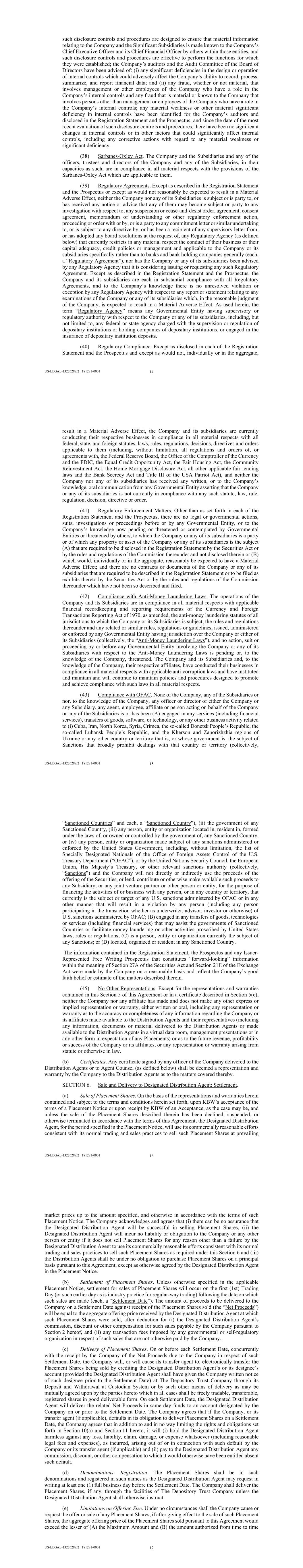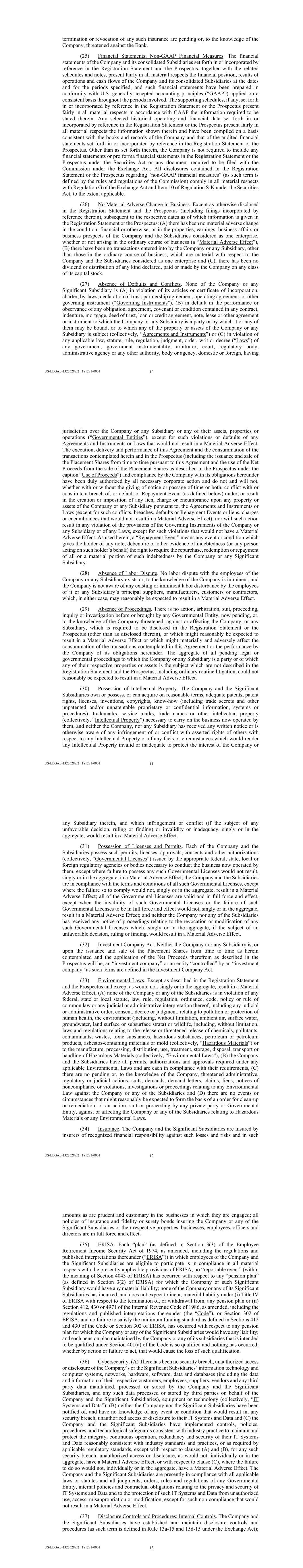 US-LEGAL-13226288/2 181281-0001 10 termination or revocation of any such insurance are pending or, to the knowledge of the Company, threatened against the Bank. (25) Financial Statements; Non-GAAP Financial Measures. The financial statements of the Company and its consolidated Subsidiaries set forth in or incorporated by reference in the Registration Statement and the Prospectus, together with the related schedules and notes, present fairly in all material respects the financial position, results of operations and cash flows of the Company and its consolidated Subsidiaries at the dates and for the periods specified, and such financial statements have been prepared in conformity with U.S. generally accepted accounting principles (“GAAP”) applied on a consistent basis throughout the periods involved. The supporting schedules, if any, set forth in or incorporated by reference in the Registration Statement or the Prospectus present fairly in all material respects in accordance with GAAP the information required to be stated therein. Any selected historical operating and financial data set forth in or incorporated by reference in the Registration Statement or the Prospectus present fairly in all material respects the information shown therein and have been compiled on a basis consistent with the books and records of the Company and that of the audited financial statements set forth in or incorporated by reference in the Registration Statement or the Prospectus. Other than as set forth therein, the Company is not required to include any financial statements or pro forma financial statements in the Registration Statement or the Prospectus under the Securities Act or any document required to be filed with the Commission under the Exchange Act. All disclosures contained in the Registration Statement or the Prospectus regarding “non-GAAP financial measures” (as such term is defined by the rules and regulations of the Commission) comply in all material respects with Regulation G of the Exchange Act and Item 10 of Regulation S-K under the Securities Act, to the extent applicable. (26) No Material Adverse Change in Business. Except as otherwise disclosed in the Registration Statement and the Prospectus (including filings incorporated by reference therein), subsequent to the respective dates as of which information is given in the Registration Statement or the Prospectus: (A) there has been no material adverse change in the condition, financial or otherwise, or in the properties, earnings, business affairs or business prospects of the Company and the Subsidiaries considered as one enterprise, whether or not arising in the ordinary course of business (a “Material Adverse Effect”), (B) there have been no transactions entered into by the Company or any Subsidiary, other than those in the ordinary course of business, which are material with respect to the Company and the Subsidiaries considered as one enterprise and (C), there has been no dividend or distribution of any kind declared, paid or made by the Company on any class of its capital stock. (27) Absence of Defaults and Conflicts. None of the Company or any Significant Subsidiary is (A) in violation of its articles or certificate of incorporation, charter, by-laws, declaration of trust, partnership agreement, operating agreement, or other governing instrument (“Governing Instruments”), (B) in default in the performance or observance of any obligation, agreement, covenant or condition contained in any contract, indenture, mortgage, deed of trust, loan or credit agreement, note, lease or other agreement or instrument to which the Company or any Subsidiary is a party or by which it or any of them may be bound, or to which any of the property or assets of the Company or any Subsidiary is subject (collectively, “Agreements and Instruments”) or (C) in violation of any applicable law, statute, rule, regulation, judgment, order, writ or decree (“Laws”) of any government, government instrumentality, arbitrator, court, regulatory body, administrative agency or any other authority, body or agency, domestic or foreign, having US-LEGAL-13226288/2 181281-0001 11 jurisdiction over the Company or any Subsidiary or any of their assets, properties or operations (“Governmental Entities”), except for such violations or defaults of any Agreements and Instruments or Laws that would not result in a Material Adverse Effect. The execution, delivery and performance of this Agreement and the consummation of the transactions contemplated herein and in the Prospectus (including the issuance and sale of the Placement Shares from time to time pursuant to this Agreement and the use of the Net Proceeds from the sale of the Placement Shares as described in the Prospectus under the caption “Use of Proceeds”) and compliance by the Company with its obligations hereunder have been duly authorized by all necessary corporate action and do not and will not, whether with or without the giving of notice or passage of time or both, conflict with or constitute a breach of, or default or Repayment Event (as defined below) under, or result in the creation or imposition of any lien, charge or encumbrance upon any property or assets of the Company or any Subsidiary pursuant to, the Agreements and Instruments or Laws (except for such conflicts, breaches, defaults or Repayment Events or liens, charges or encumbrances that would not result in a Material Adverse Effect), nor will such action result in any violation of the provisions of the Governing Instruments of the Company or any Subsidiary or of any Laws, except for such violations that would not have a Material Adverse Effect. As used herein, a “Repayment Event” means any event or condition which gives the holder of any note, debenture or other evidence of indebtedness (or any person acting on such holder’s behalf) the right to require the repurchase, redemption or repayment of all or a material portion of suc