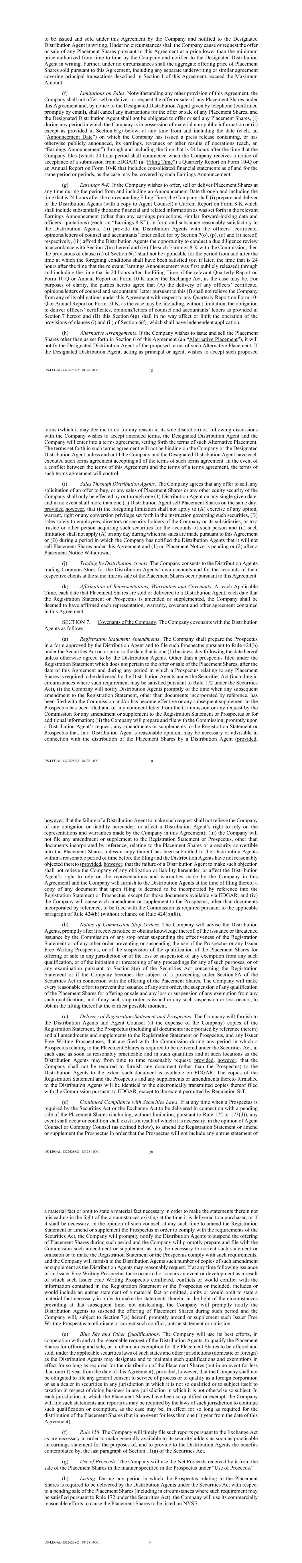 US-LEGAL-13226288/2 181281-0001 18 to be issued and sold under this Agreement by the Company and notified to the Designated Distribution Agent in writing. Under no circumstances shall the Company cause or request the offer or sale of any Placement Shares pursuant to this Agreement at a price lower than the minimum price authorized from time to time by the Company and notified to the Designated Distribution Agent in writing. Further, under no circumstances shall the aggregate offering price of Placement Shares sold pursuant to this Agreement, including any separate underwriting or similar agreement covering principal transactions described in Section 1 of this Agreement, exceed the Maximum Amount. (f) Limitations on Sales. Notwithstanding any other provision of this Agreement, the Company shall not offer, sell or deliver, or request the offer or sale of, any Placement Shares under this Agreement and, by notice to the Designated Distribution Agent given by telephone (confirmed promptly by email), shall cancel any instructions for the offer or sale of any Placement Shares, and the Designated Distribution Agent shall not be obligated to offer or sell any Placement Shares, (i) during any period in which the Company is in possession of material non-public information or (ii) except as provided in Section 6(g) below, at any time from and including the date (each, an “Announcement Date”) on which the Company has issued a press release containing, or has otherwise publicly announced, its earnings, revenues or other results of operations (each, an “Earnings Announcement”) through and including the time that is 24 hours after the time that the Company files (which 24-hour period shall commence when the Company receives a notice of acceptance of a submission from EDGAR) (a “Filing Time”) a Quarterly Report on Form 10-Q or an Annual Report on Form 10-K that includes consolidated financial statements as of and for the same period or periods, as the case may be, covered by such Earnings Announcement. (g) Earnings 8-K. If the Company wishes to offer, sell or deliver Placement Shares at any time during the period from and including an Announcement Date through and including the time that is 24 hours after the corresponding Filing Time, the Company shall (i) prepare and deliver to the Distribution Agents (with a copy to Agent Counsel) a Current Report on Form 8-K which shall include substantially the same financial and related information as was set forth in the relevant Earnings Announcement (other than any earnings projections, similar forward-looking data and officers’ quotations) (each, an “Earnings 8-K”), in form and substance reasonably satisfactory to the Distribution Agents, (ii) provide the Distribution Agents with the officers’ certificate, opinions/letters of counsel and accountants’ letter called for by Section 7(o), (p), (q) and (r) hereof; respectively, (iii) afford the Distribution Agents the opportunity to conduct a due diligence review in accordance with Section 7(m) hereof and (iv) file such Earnings 8-K with the Commission, then the provisions of clause (ii) of Section 6(f) shall not be applicable for the period from and after the time at which the foregoing conditions shall have been satisfied (or, if later, the time that is 24 hours after the time that the relevant Earnings Announcement was first publicly released) through and including the time that is 24 hours after the Filing Time of the relevant Quarterly Report on Form 10-Q or Annual Report on Form 10-K under the Exchange Act, as the case may be. For purposes of clarity, the parties hereto agree that (A) the delivery of any officers’ certificate, opinions/letters of counsel and accountants’ letter pursuant to this (f) shall not relieve the Company from any of its obligations under this Agreement with respect to any Quarterly Report on Form 10- Q or Annual Report on Form 10-K, as the case may be, including, without limitation, the obligation to deliver officers’ certificates, opinions/letters of counsel and accountants’ letters as provided in Section 7 hereof and (B) this Section 6(g) shall in no way affect or limit the operation of the provisions of clauses (i) and (ii) of Section 6(f), which shall have independent application. (h) Alternative Arrangements. If the Company wishes to issue and sell the Placement Shares other than as set forth in Section 6 of this Agreement (an “Alternative Placement”), it will notify the Designated Distribution Agent of the proposed terms of such Alternative Placement. If the Designated Distribution Agent, acting as principal or agent, wishes to accept such proposed US-LEGAL-13226288/2 181281-0001 19 terms (which it may decline to do for any reason in its sole discretion) or, following discussions with the Company wishes to accept amended terms, the Designated Distribution Agent and the Company will enter into a terms agreement, setting forth the terms of such Alternative Placement. The terms set forth in such terms agreement will not be binding on the Company or the Designated Distribution Agent unless and until the Company and the Designated Distribution Agent have each executed such terms agreement accepting all of the terms of such terms agreement. In the event of a conflict between the terms of this Agreement and the terms of a terms agreement, the terms of such terms agreement will control. (i) Sales Through Distribution Agents. The Company agrees that any offer to sell, any solicitation of an offer to buy, or any sales of Placement Shares or any other equity security of the Company shall only be effected by or through one (1) Distribution Agent on any single given date, and in no event shall more than one (1) Distribution Agent sell Placement Shares on the same day; provided however, that (i) the foregoing limitation shall not apply to (A) exercise of any option, warrant, right or any conversion privilege set forth in the instruction governing such securitie