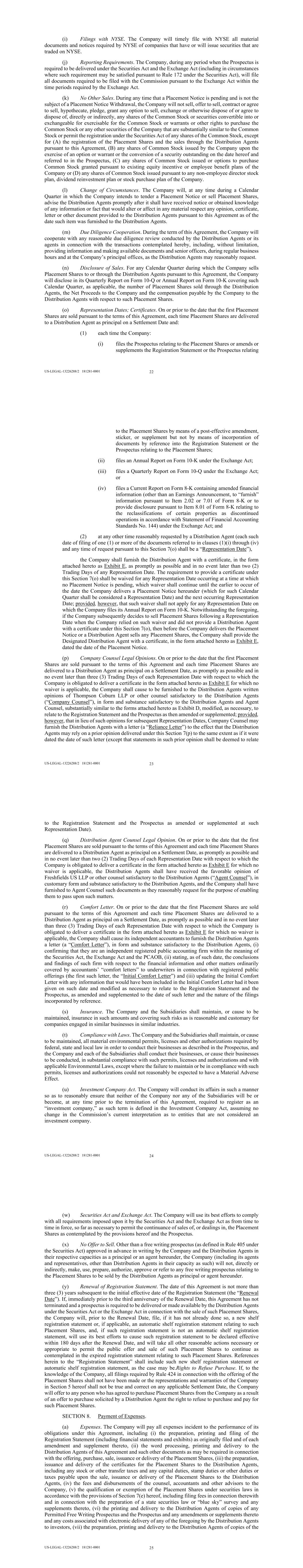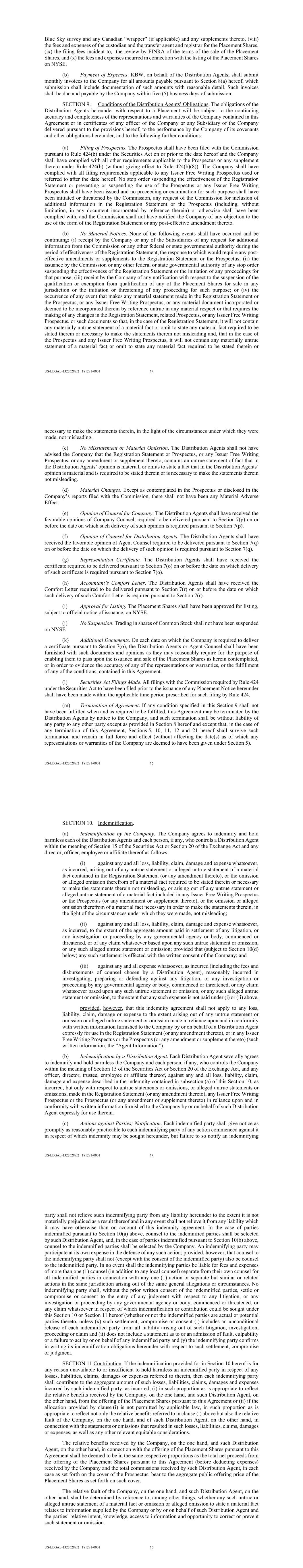 US-LEGAL-13226288/2 181281-0001 26 Blue Sky survey and any Canadian “wrapper” (if applicable) and any supplements thereto, (viii) the fees and expenses of the custodian and the transfer agent and registrar for the Placement Shares, (ix) the filing fees incident to, the review by FINRA of the terms of the sale of the Placement Shares, and (x) the fees and expenses incurred in connection with the listing of the Placement Shares on NYSE. (b) Payment of Expenses. KBW, on behalf of the Distribution Agents, shall submit monthly invoices to the Company for all amounts payable pursuant to Section 8(a) hereof, which submission shall include documentation of such amounts with reasonable detail. Such invoices shall be due and payable by the Company within five (5) business days of submission. SECTION 9. Conditions of the Distribution Agents’ Obligations. The obligations of the Distribution Agents hereunder with respect to a Placement will be subject to the continuing accuracy and completeness of the representations and warranties of the Company contained in this Agreement or in certificates of any officer of the Company or any Subsidiary of the Company delivered pursuant to the provisions hereof, to the performance by the Company of its covenants and other obligations hereunder, and to the following further conditions: (a) Filing of Prospectus. The Prospectus shall have been filed with the Commission pursuant to Rule 424(b) under the Securities Act on or prior to the date hereof and the Company shall have complied with all other requirements applicable to the Prospectus or any supplement thereto under Rule 424(b) (without giving effect to Rule 424(b)(8)). The Company shall have complied with all filing requirements applicable to any Issuer Free Writing Prospectus used or referred to after the date hereof. No stop order suspending the effectiveness of the Registration Statement or preventing or suspending the use of the Prospectus or any Issuer Free Writing Prospectus shall have been issued and no proceeding or examination for such purpose shall have been initiated or threatened by the Commission, any request of the Commission for inclusion of additional information in the Registration Statement or the Prospectus (including, without limitation, in any document incorporated by reference therein) or otherwise shall have been complied with, and the Commission shall not have notified the Company of any objection to the use of the form of the Registration Statement or any post-effective amendment thereto. (b) No Material Notices. None of the following events shall have occurred and be continuing: (i) receipt by the Company or any of the Subsidiaries of any request for additional information from the Commission or any other federal or state governmental authority during the period of effectiveness of the Registration Statement, the response to which would require any post- effective amendments or supplements to the Registration Statement or the Prospectus; (ii) the issuance by the Commission or any other federal or state governmental authority of any stop order suspending the effectiveness of the Registration Statement or the initiation of any proceedings for that purpose; (iii) receipt by the Company of any notification with respect to the suspension of the qualification or exemption from qualification of any of the Placement Shares for sale in any jurisdiction or the initiation or threatening of any proceeding for such purpose; or (iv) the occurrence of any event that makes any material statement made in the Registration Statement or the Prospectus, or any Issuer Free Writing Prospectus, or any material document incorporated or deemed to be incorporated therein by reference untrue in any material respect or that requires the making of any changes in the Registration Statement, related Prospectus, or any Issuer Free Writing Prospectus, or such documents so that, in the case of the Registration Statement, it will not contain any materially untrue statement of a material fact or omit to state any material fact required to be stated therein or necessary to make the statements therein not misleading and, that in the case of the Prospectus and any Issuer Free Writing Prospectus, it will not contain any materially untrue statement of a material fact or omit to state any material fact required to be stated therein or US-LEGAL-13226288/2 181281-0001 27 necessary to make the statements therein, in the light of the circumstances under which they were made, not misleading. (c) No Misstatement or Material Omission. The Distribution Agents shall not have advised the Company that the Registration Statement or Prospectus, or any Issuer Free Writing Prospectus, or any amendment or supplement thereto, contains an untrue statement of fact that in the Distribution Agents’ opinion is material, or omits to state a fact that in the Distribution Agents’ opinion is material and is required to be stated therein or is necessary to make the statements therein not misleading. (d) Material Changes. Except as contemplated in the Prospectus or disclosed in the Company’s reports filed with the Commission, there shall not have been any Material Adverse Effect. (e) Opinion of Counsel for Company. The Distribution Agents shall have received the favorable opinions of Company Counsel, required to be delivered pursuant to Section 7(p) on or before the date on which such delivery of such opinion is required pursuant to Section 7(p). (f) Opinion of Counsel for Distribution Agents. The Distribution Agents shall have received the favorable opinion of Agent Counsel required to be delivered pursuant to Section 7(q) on or before the date on which the delivery of such opinion is required pursuant to Section 7(q). (g) Representation Certificate. The Distribution Agents shall have received the certificate required to be delivered pursuant to Section 7(o) on or before the date on which delivery of such certificate is required pursuant to Se