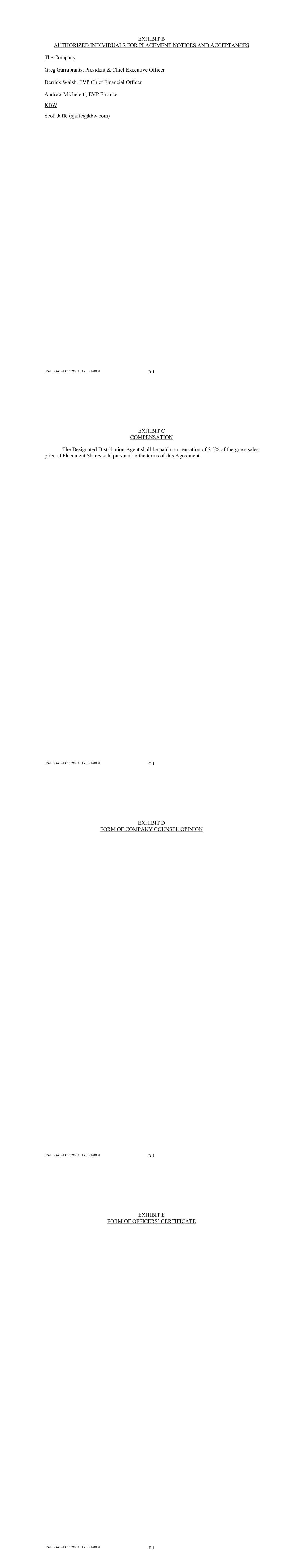 US-LEGAL-13226288/2 181281-0001 B-1 EXHIBIT B AUTHORIZED INDIVIDUALS FOR PLACEMENT NOTICES AND ACCEPTANCES The Company Greg Garrabrants, President & Chief Executive Officer Derrick Walsh, EVP Chief Financial Officer Andrew Micheletti, EVP Finance KBW Scott Jaffe (sjaffe@kbw.com) US-LEGAL-13226288/2 181281-0001 C-1 EXHIBIT C COMPENSATION The Designated Distribution Agent shall be paid compensation of 2.5% of the gross sales price of Placement Shares sold pursuant to the terms of this Agreement. US-LEGAL-13226288/2 181281-0001 D-1 EXHIBIT D FORM OF COMPANY COUNSEL OPINION US-LEGAL-13226288/2 181281-0001 E-1 EXHIBIT E FORM OF OFFICERS’ CERTIFICATE