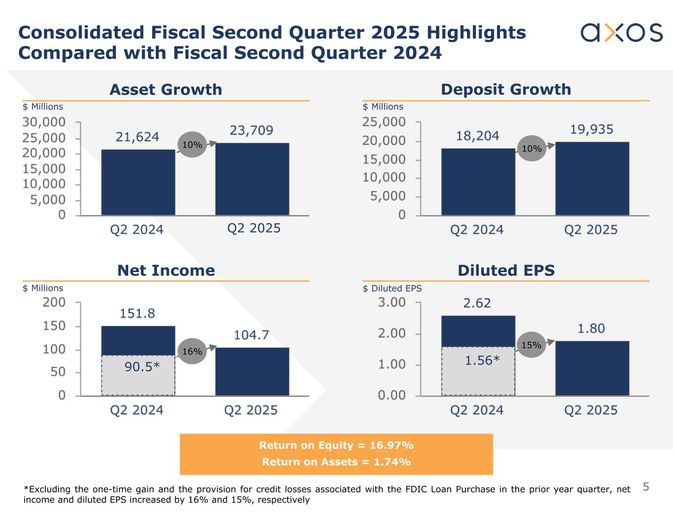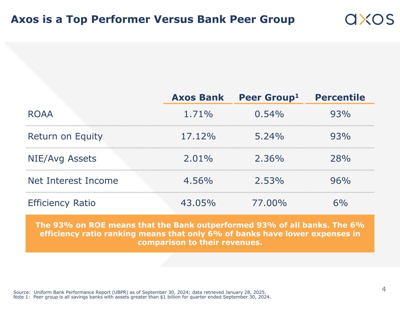 4 PercentilePeer Group1Axos Bank 93%0.54%1.71%ROAA 93%5.24%17.12%Return on Equity 28%2.36%2.01%NIE/Avg Assets 96%2.53%4.56%Net Interest Income 6%77.00%43.05%Efficiency Ratio Source: Uniform Bank Performance Report (UBPR) as of September 30, 2024; data retrieved January 28, 2025. Note 1: Peer group is all savings banks with assets greater than $1 billion for quarter ended September 30, 2024. Axos is a Top Performer Versus Bank Peer Group The 93% on ROE means that the Bank outperformed 93% of all banks. The 6% efficiency ratio ranking means that only 6% of banks have lower expenses in comparison to their revenues.