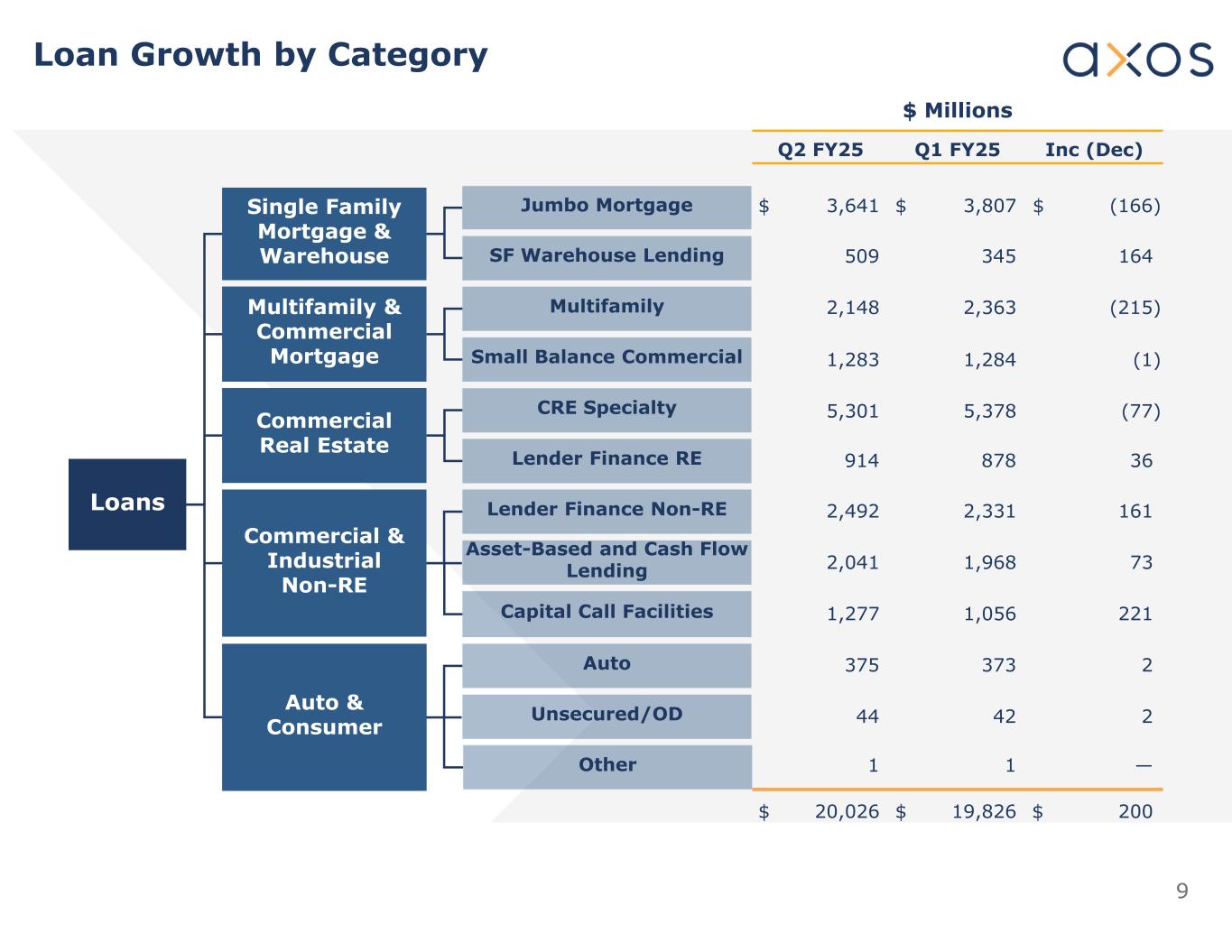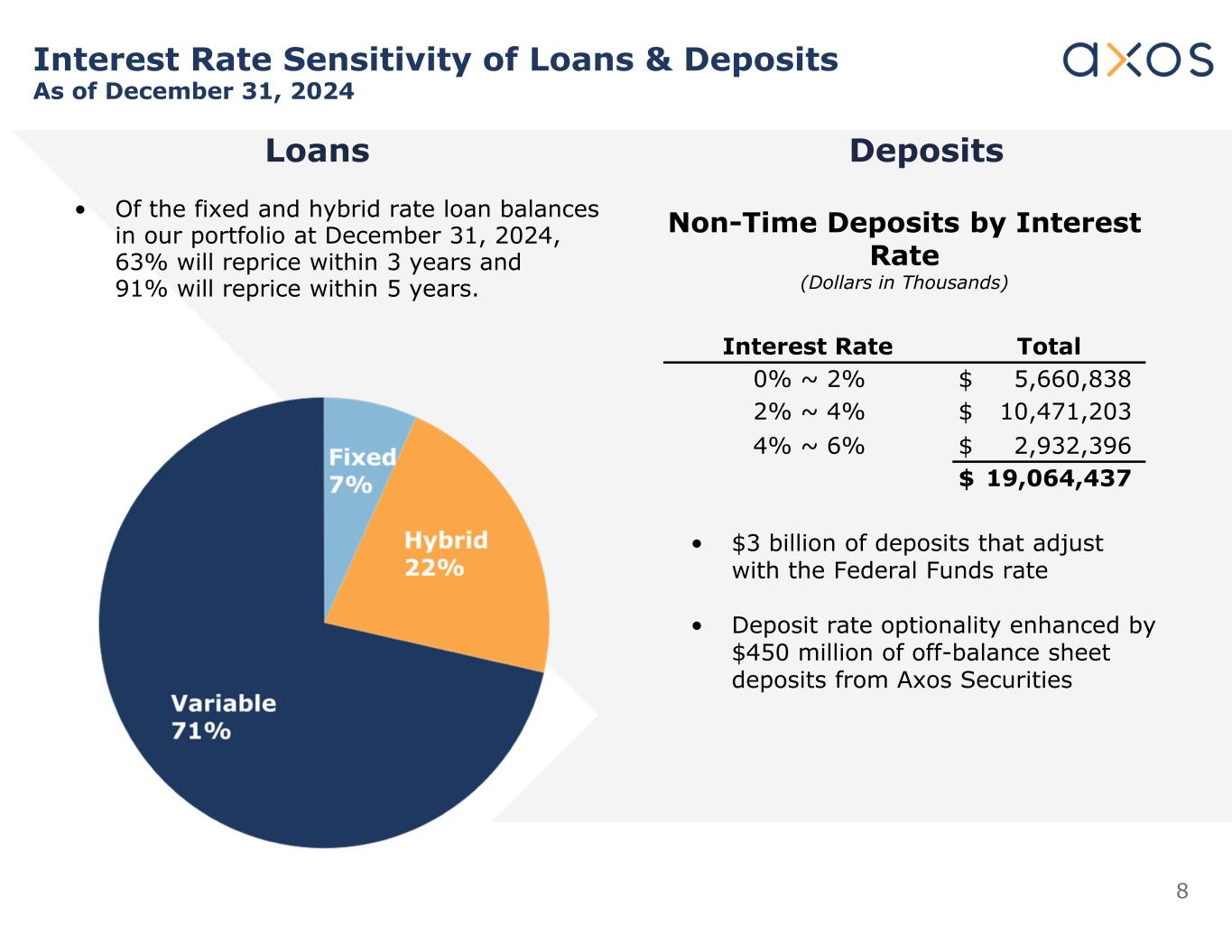 8 DepositsLoans Interest Rate Sensitivity of Loans & Deposits As of December 31, 2024 TotalInterest Rate $ 5,660,8380% ~ 2% $ 10,471,2032% ~ 4% $ 2,932,3964% ~ 6% $ 19,064,437 Non-Time Deposits by Interest Rate (Dollars in Thousands) • $3 billion of deposits that adjust with the Federal Funds rate • Deposit rate optionality enhanced by $450 million of off-balance sheet deposits from Axos Securities • Of the fixed and hybrid rate loan balances in our portfolio at December 31, 2024, 63% will reprice within 3 years and 91% will reprice within 5 years.