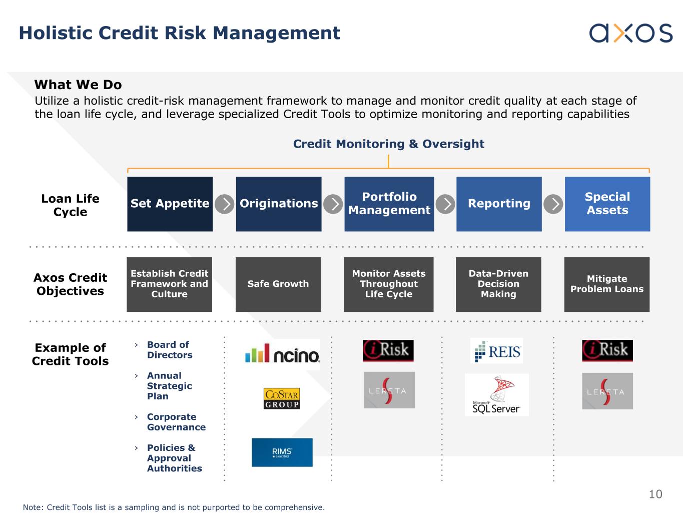 10 Holistic Credit Risk Management What We Do Loan Life Cycle Utilize a holistic credit-risk management framework to manage and monitor credit quality at each stage of the loan life cycle, and leverage specialized Credit Tools to optimize monitoring and reporting capabilities Set Appetite Originations Portfolio Management Reporting Special Assets Credit Monitoring & Oversight Axos Credit Objectives Example of Credit Tools › Board of Directors › Annual Strategic Plan › Corporate Governance › Policies & Approval Authorities Note: Credit Tools list is a sampling and is not purported to be comprehensive.     Establish Credit Framework and Culture Safe Growth Monitor Assets Throughout Life Cycle Data-Driven Decision Making Mitigate Problem Loans