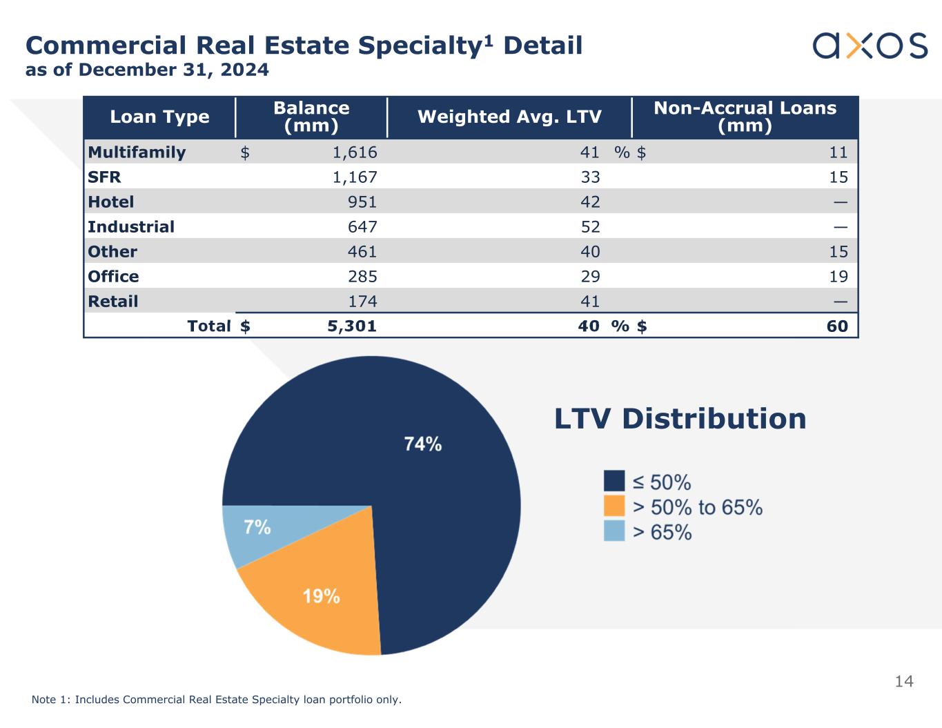 13 Allowance for Credit Losses (ACL) by Loan Category as of December 31, 2024 $ Millions ACL %1ACL $Loan Balance 0.4 %16$ 4,150 1.6 %563,431 1.6 %1026,215 1.4 %845,810 2.9 %12420 1.3 %270$ 20,026 Single Family Mortgage & Warehouse Multifamily & Commercial Mortgage Commercial Real Estate Commercial & Industrial Non-RE Auto & Consumer Loans Note 1: ACL % is based on gross unpaid principal balance