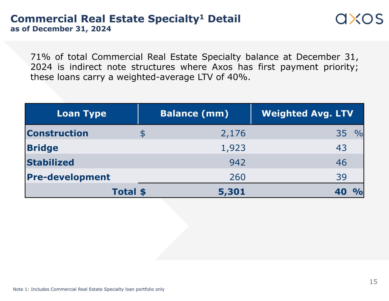 14 Commercial Real Estate Specialty1 Detail as of December 31, 2024 Non-Accrual Loans (mm)Weighted Avg. LTVBalance (mm)Loan Type $ 1141 %$ 1,616Multifamily 15331,167SFR —42951Hotel —52647Industrial 1540461Other 1929285Office —41174Retail $ 6040 %$ 5,301Total LTV Distribution Note 1: Includes Commercial Real Estate Specialty loan portfolio only.