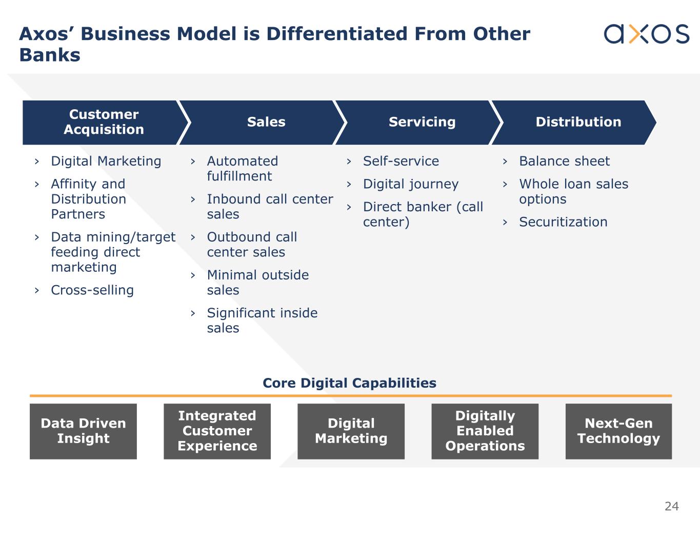 23 Axos Clearing Long-Term Revenue and Expense Synergies Revenue Synergies Cost Synergies Axos Securities: › Margin Loans › Securities Lending › Fixed Income Trading › Order Flow › White-label Robo-Advisor Axos Consumer Banking: › White-label Banking › Auto Lending › Mortgage Lending › Unsecured Lending › Marine Lending Axos Business Banking: › Small Business Banking › RIA Lending Axos Securities: › Self-Clearing › Regulatory/Compliance › Client Acquisition Costs › Customer Service › IT Infrastructure/Dev Axos Consumer Banking: › Deposit Servicing Costs › Client Acquisition Costs Axos Business Banking: › Client Acquisition Costs Axos Custody Axos Clearing Axos Invest