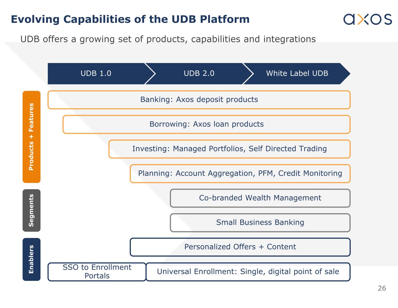 25 Key Goals of Universal Digital Bank Personalization Self-Service Facilitate Partnerships Customizable Experience Cross-Sell › Customized product recommendations based upon analytical determination of need › Streamlined account opening reduces abandonment rates and increases pull-through on new products › Provide holistic, interactive and intuitive design experience › Integrate online experience with other channels › Enable clients to see their entire relationship with Axos › Easy integration of third-party features (e.g., biometrics) › Access to value added tools (e.g., robo-advisory, automated savings features) either proprietary or third party › Enable creative customer acquisition partners › Automation tools assist customer support and sale of banking products such as deposits, loans, and managed investment portfolios › Products optimized by channel, recipient and journey › Self-service saves time and cost (e.g., activate and deactivate debit-card in platform, send wires via self-service) › Increase chances of offering right product at the right time and place › Personalization is the right antidote for too much choice, too much content, and not enough time