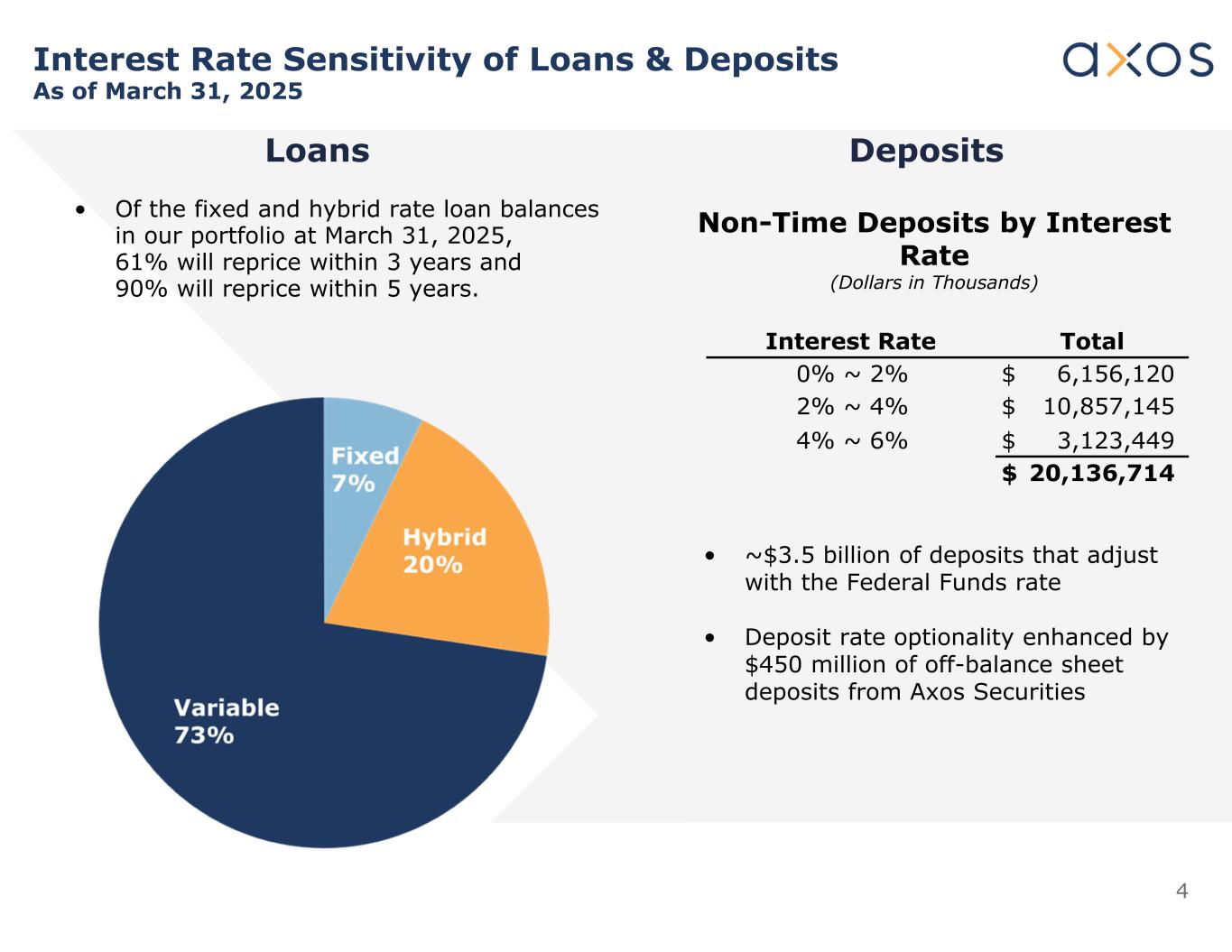 4 DepositsLoans Interest Rate Sensitivity of Loans & Deposits As of March 31, 2025 TotalInterest Rate $ 6,156,1200% ~ 2% $ 10,857,1452% ~ 4% $ 3,123,4494% ~ 6% $ 20,136,714 Non-Time Deposits by Interest Rate (Dollars in Thousands) • ~$3.5 billion of deposits that adjust with the Federal Funds rate • Deposit rate optionality enhanced by $450 million of off-balance sheet deposits from Axos Securities • Of the fixed and hybrid rate loan balances in our portfolio at March 31, 2025, 61% will reprice within 3 years and 90% will reprice within 5 years.