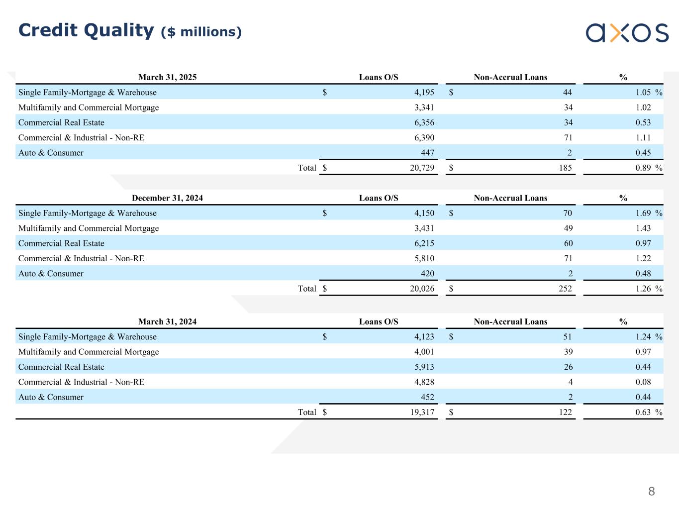 7 Allowance for Credit Losses (ACL) by Loan Category as of March 31, 2025 $ Millions ACL %1ACLLoan Balance 0.4 %$ 15$ 4,195 1.4 %483,341 1.4 %906,356 1.8 %1146,390 2.9 %13447 1.4 %$ 280$ 20,729 Single Family Mortgage & Warehouse Multifamily & Commercial Mortgage Commercial Real Estate Commercial & Industrial Non-RE Auto & Consumer Loans Note 1: ACL % is based on gross unpaid principal balance