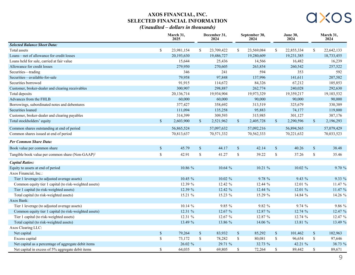 9 March 31, 2024 June 30, 2024 September 30, 2024 December 31, 2024 March 31, 2025 Selected Balance Sheet Data: $ 22,642,133$ 22,855,334$ 23,569,084$ 23,709,422$ 23,981,154Total assets 18,733,45519,231,38519,280,60919,486,72720,193,630Loans—net of allowance for credit losses 16,23916,48214,56625,43615,644Loans held for sale, carried at fair value 257,522260,542263,854270,605279,950Allowance for credit losses 592353594241346Securities—trading 207,582141,611137,99697,84879,958Securities—available-for-sale 105,85367,21284,326114,67291,915Securities borrowed 292,630240,028262,774298,887300,907Customer, broker-dealer and clearing receivables 19,103,53219,359,21719,973,32919,934,90420,136,714Total deposits 90,00090,00090,00060,00060,000Advances from the FHLB 330,389325,679313,519358,692377,427Borrowings, subordinated notes and debentures 119,80074,17795,883135,258111,094Securities loaned 387,176301,127315,985309,593314,399Customer, broker-dealer and clearing payables $ 2,196,293$ 2,290,596$ 2,405,728$ 2,521,962$ 2,603,900Total stockholders’ equity 57,079,42956,894,56557,092,21657,097,63256,865,524Common shares outstanding at end of period 70,033,52370,221,63270,562,33370,571,33270,813,637Common shares issued at end of period Per Common Share Data: $ 38.48$ 40.26$ 42.14$ 44.17$ 45.79Book value per common share $ 35.46$ 37.26$ 39.22$ 41.27$ 42.91Tangible book value per common share (Non-GAAP)1 Capital Ratios: 9.70 %10.02 %10.21 %10.64 %10.86 %Equity to assets at end of period Axos Financial, Inc.: 9.33 %9.43 %9.78 %10.02 %10.45 %Tier 1 leverage (to adjusted average assets) 11.47 %12.01 %12.44 %12.42 %12.39 %Common equity tier 1 capital (to risk-weighted assets) 11.47 %12.01 %12.44 %12.42 %12.39 %Tier 1 capital (to risk-weighted assets) 14.26 %14.84 %15.29 %15.23 %15.21 %Total capital (to risk-weighted assets) Axos Bank: 9.86 %9.74 %9.82 %9.85 %10.14 %Tier 1 leverage (to adjusted average assets) 12.47 %12.74 %12.87 %12.67 %12.31 %Common equity tier 1 capital (to risk-weighted assets) 12.47 %12.74 %12.87 %12.67 %12.31 %Tier 1 capital (to risk-weighted assets) 13.49 %13.81 %14.06 %13.86 %13.49 %Total capital (to risk-weighted assets) Axos Clearing LLC: $ 102,963$ 101,462$ 85,292$ 83,932$ 79,264Net capital $ 97,646$ 96,654$ 80,081$ 78,282$ 73,172Excess capital 38.73 %42.21 %32.73 %29.71 %26.02 %Net capital as a percentage of aggregate debit items $ 89,671$ 89,442$ 72,264$ 69,805$ 64,035Net capital in excess of 5% aggregate debit items AXOS FINANCIAL, INC. SELECTED FINANCIAL INFORMATION (Unaudited – dollars in thousands)