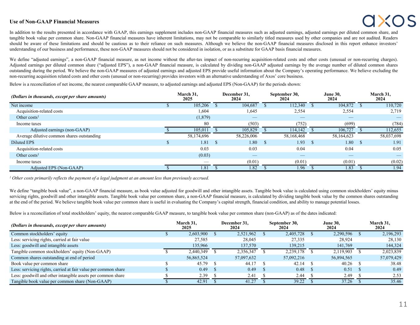 11 March 31, 2024 June 30, 2024 September 30, 2024 December 31, 2024 March 31, 2025(Dollars in thousands, except per share amounts) $ 110,720$ 104,872$ 112,340$ 104,687$ 105,206Net income 2,7192,5542,5541,6451,604Acquisition-related costs ————(1,879)Other costs1 (784)(699)(752)(503)80Income taxes $ 112,655$ 106,727$ 114,142$ 105,829$ 105,011Adjusted earnings (non-GAAP) 58,037,69858,164,62358,168,46858,226,00658,174,696Average dilutive common shares outstanding $ 1.91$ 1.80$ 1.93$ 1.80$ 1.81Diluted EPS 0.050.040.040.030.03Acquisition-related costs ————(0.03)Other costs1 (0.02)(0.01)(0.01)(0.01)—Income taxes $ 1.94$ 1.83$ 1.96$ 1.82$ 1.81Adjusted EPS (Non-GAAP) 1 Other costs primarily reflects the payment of a legal judgment at an amount less than previously accrued. We define “tangible book value”, a non-GAAP financial measure, as book value adjusted for goodwill and other intangible assets. Tangible book value is calculated using common stockholders’ equity minus servicing rights, goodwill and other intangible assets. Tangible book value per common share, a non-GAAP financial measure, is calculated by dividing tangible book value by the common shares outstanding at the end of the period. We believe tangible book value per common share is useful in evaluating the Company’s capital strength, financial condition, and ability to manage potential losses. Below is a reconciliation of total stockholders’ equity, the nearest comparable GAAP measure, to tangible book value per common share (non-GAAP) as of the dates indicated: March 31, 2024 June 30, 2024 September 30, 2024 December 31, 2024 March 31, 2025(Dollars in thousands, except per share amounts) $ 2,196,293$ 2,290,596$ 2,405,728$ 2,521,962$ 2,603,900Common stockholders’ equity 28,13028,92427,33528,04527,585Less: servicing rights, carried at fair value 144,324141,769139,215137,570135,966Less: goodwill and intangible assets $ 2,023,839$ 2,119,903$ 2,239,178$ 2,356,347$ 2,440,349Tangible common stockholders’ equity (Non-GAAP) 57,079,42956,894,56557,092,21657,097,63256,865,524Common shares outstanding at end of period $ 38.48$ 40.26$ 42.14$ 44.17$ 45.79Book value per common share $ 0.49$ 0.51$ 0.48$ 0.49$ 0.49Less: servicing rights, carried at fair value per common share $ 2.53$ 2.49$ 2.44$ 2.41$ 2.39Less: goodwill and other intangible assets per common share $ 35.46$ 37.26$ 39.22$ 41.27$ 42.91Tangible book value per common share (Non-GAAP) Use of Non-GAAP Financial Measures In addition to the results presented in accordance with GAAP, this earnings supplement includes non-GAAP financial measures such as adjusted earnings, adjusted earnings per diluted common share, and tangible book value per common share. Non-GAAP financial measures have inherent limitations, may not be comparable to similarly titled measures used by other companies and are not audited. Readers should be aware of these limitations and should be cautious as to their reliance on such measures. Although we believe the non-GAAP financial measures disclosed in this report enhance investors’ understanding of our business and performance, these non-GAAP measures should not be considered in isolation, or as a substitute for GAAP basis financial measures. We define “adjusted earnings”, a non-GAAP financial measure, as net income without the after-tax impact of non-recurring acquisition-related costs and other costs (unusual or non-recurring charges). Adjusted earnings per diluted common share (“adjusted EPS”), a non-GAAP financial measure, is calculated by dividing non-GAAP adjusted earnings by the average number of diluted common shares outstanding during the period. We believe the non-GAAP measures of adjusted earnings and adjusted EPS provide useful information about the Company’s operating performance. We believe excluding the non-recurring acquisition related costs and other costs (unusual or non-recurring) provides investors with an alternative understanding of Axos’ core business. Below is a reconciliation of net income, the nearest comparable GAAP measure, to adjusted earnings and adjusted EPS (Non-GAAP) for the periods shown: