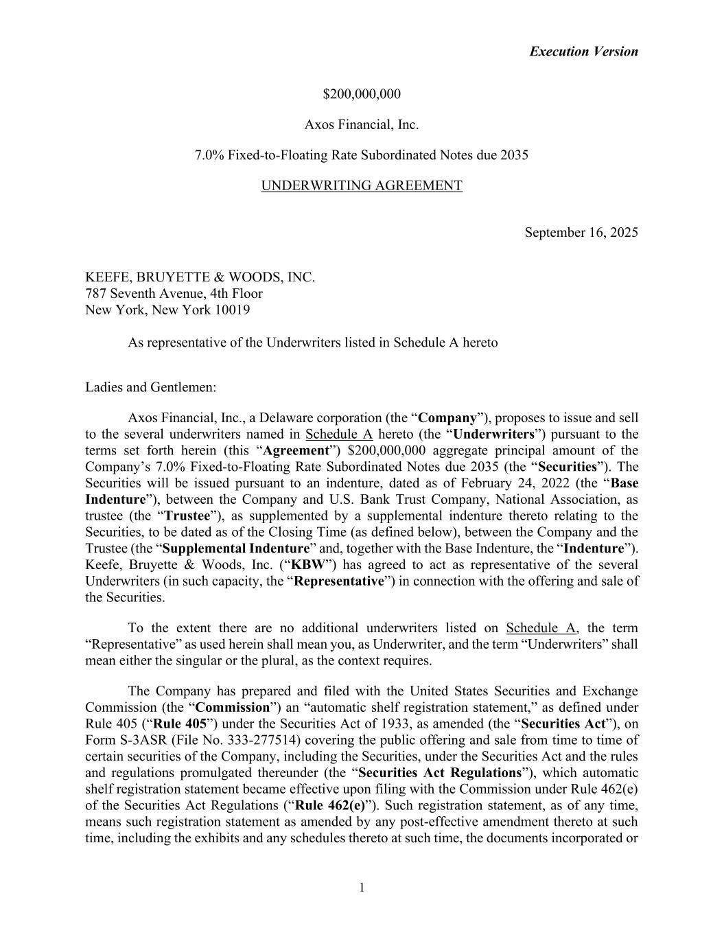 Execution Version 1 $200,000,000 Axos Financial, Inc. 7.0% Fixed-to-Floating Rate Subordinated Notes due 2035 UNDERWRITING AGREEMENT September 16, 2025 KEEFE, BRUYETTE & WOODS, INC. 787 Seventh Avenue, 4th Floor New York, New York 10019 As representative of the Underwriters listed in Schedule A hereto Ladies and Gentlemen: Axos Financial, Inc., a Delaware corporation (the “Company”), proposes to issue and sell to the several underwriters named in Schedule A hereto (the “Underwriters”) pursuant to the terms set forth herein (this “Agreement”) $200,000,000 aggregate principal amount of the Company’s 7.0% Fixed-to-Floating Rate Subordinated Notes due 2035 (the “Securities”). The Securities will be issued pursuant to an indenture, dated as of February 24, 2022 (the “Base Indenture”), between the Company and U.S. Bank Trust Company, National Association, as trustee (the “Trustee”), as supplemented by a supplemental indenture thereto relating to the Securities, to be dated as of the Closing Time (as defined below), between the Company and the Trustee (the “Supplemental Indenture” and, together with the Base Indenture, the “Indenture”). Keefe, Bruyette & Woods, Inc. (“KBW”) has agreed to act as representative of the several Underwriters (in such capacity, the “Representative”) in connection with the offering and sale of the Securities. To the extent there are no additional underwriters listed on Schedule A, the term “Representative” as used herein shall mean you, as Underwriter, and the term “Underwriters” shall mean either the singular or the plural, as the context requires. The Company has prepared and filed with the United States Securities and Exchange Commission (the “Commission”) an “automatic shelf registration statement,” as defined under Rule 405 (“Rule 405”) under the Securities Act of 1933, as amended (the “Securities Act”), on Form S-3ASR (File No. 333-277514) covering the public offering and sale from time to time of certain securities of the Company, including the Securities, under the Securities Act and the rules and regulations promulgated thereunder (the “Securities Act Regulations”), which automatic shelf registration statement became effective upon filing with the Commission under Rule 462(e) of the Securities Act Regulations (“Rule 462(e)”). Such registration statement, as of any time, means such registration statement as amended by any post-effective amendment thereto at such time, including the exhibits and any schedules thereto at such time, the documents incorporated or