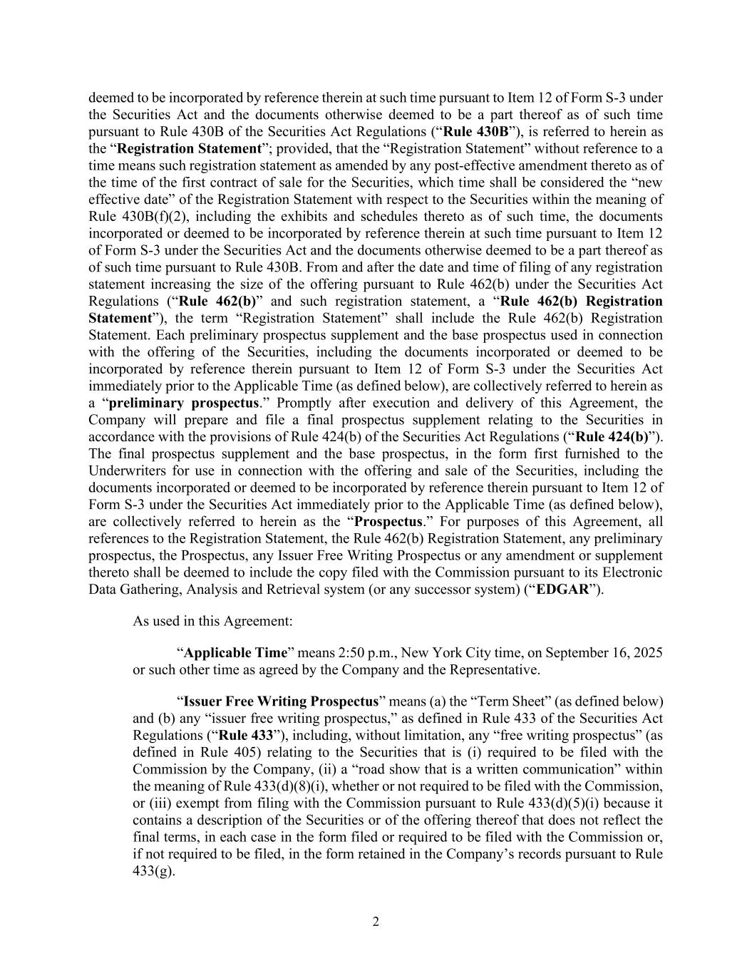 2 deemed to be incorporated by reference therein at such time pursuant to Item 12 of Form S-3 under the Securities Act and the documents otherwise deemed to be a part thereof as of such time pursuant to Rule 430B of the Securities Act Regulations (“Rule 430B”), is referred to herein as the “Registration Statement”; provided, that the “Registration Statement” without reference to a time means such registration statement as amended by any post-effective amendment thereto as of the time of the first contract of sale for the Securities, which time shall be considered the “new effective date” of the Registration Statement with respect to the Securities within the meaning of Rule 430B(f)(2), including the exhibits and schedules thereto as of such time, the documents incorporated or deemed to be incorporated by reference therein at such time pursuant to Item 12 of Form S-3 under the Securities Act and the documents otherwise deemed to be a part thereof as of such time pursuant to Rule 430B. From and after the date and time of filing of any registration statement increasing the size of the offering pursuant to Rule 462(b) under the Securities Act Regulations (“Rule 462(b)” and such registration statement, a “Rule 462(b) Registration Statement”), the term “Registration Statement” shall include the Rule 462(b) Registration Statement. Each preliminary prospectus supplement and the base prospectus used in connection with the offering of the Securities, including the documents incorporated or deemed to be incorporated by reference therein pursuant to Item 12 of Form S-3 under the Securities Act immediately prior to the Applicable Time (as defined below), are collectively referred to herein as a “preliminary prospectus.” Promptly after execution and delivery of this Agreement, the Company will prepare and file a final prospectus supplement relating to the Securities in accordance with the provisions of Rule 424(b) of the Securities Act Regulations (“Rule 424(b)”). The final prospectus supplement and the base prospectus, in the form first furnished to the Underwriters for use in connection with the offering and sale of the Securities, including the documents incorporated or deemed to be incorporated by reference therein pursuant to Item 12 of Form S-3 under the Securities Act immediately prior to the Applicable Time (as defined below), are collectively referred to herein as the “Prospectus.” For purposes of this Agreement, all references to the Registration Statement, the Rule 462(b) Registration Statement, any preliminary prospectus, the Prospectus, any Issuer Free Writing Prospectus or any amendment or supplement thereto shall be deemed to include the copy filed with the Commission pursuant to its Electronic Data Gathering, Analysis and Retrieval system (or any successor system) (“EDGAR”). As used in this Agreement: “Applicable Time” means 2:50 p.m., New York City time, on September 16, 2025 or such other time as agreed by the Company and the Representative. “Issuer Free Writing Prospectus” means (a) the “Term Sheet” (as defined below) and (b) any “issuer free writing prospectus,” as defined in Rule 433 of the Securities Act Regulations (“Rule 433”), including, without limitation, any “free writing prospectus” (as defined in Rule 405) relating to the Securities that is (i) required to be filed with the Commission by the Company, (ii) a “road show that is a written communication” within the meaning of Rule 433(d)(8)(i), whether or not required to be filed with the Commission, or (iii) exempt from filing with the Commission pursuant to Rule 433(d)(5)(i) because it contains a description of the Securities or of the offering thereof that does not reflect the final terms, in each case in the form filed or required to be filed with the Commission or, if not required to be filed, in the form retained in the Company’s records pursuant to Rule 433(g).