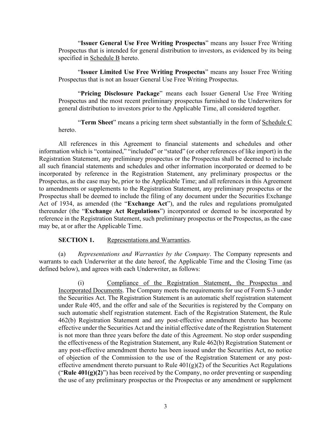 3 “Issuer General Use Free Writing Prospectus” means any Issuer Free Writing Prospectus that is intended for general distribution to investors, as evidenced by its being specified in Schedule B hereto. “Issuer Limited Use Free Writing Prospectus” means any Issuer Free Writing Prospectus that is not an Issuer General Use Free Writing Prospectus. “Pricing Disclosure Package” means each Issuer General Use Free Writing Prospectus and the most recent preliminary prospectus furnished to the Underwriters for general distribution to investors prior to the Applicable Time, all considered together. “Term Sheet” means a pricing term sheet substantially in the form of Schedule C hereto. All references in this Agreement to financial statements and schedules and other information which is “contained,” “included” or “stated” (or other references of like import) in the Registration Statement, any preliminary prospectus or the Prospectus shall be deemed to include all such financial statements and schedules and other information incorporated or deemed to be incorporated by reference in the Registration Statement, any preliminary prospectus or the Prospectus, as the case may be, prior to the Applicable Time; and all references in this Agreement to amendments or supplements to the Registration Statement, any preliminary prospectus or the Prospectus shall be deemed to include the filing of any document under the Securities Exchange Act of 1934, as amended (the “Exchange Act”), and the rules and regulations promulgated thereunder (the “Exchange Act Regulations”) incorporated or deemed to be incorporated by reference in the Registration Statement, such preliminary prospectus or the Prospectus, as the case may be, at or after the Applicable Time. SECTION 1. Representations and Warranties. (a) Representations and Warranties by the Company. The Company represents and warrants to each Underwriter at the date hereof, the Applicable Time and the Closing Time (as defined below), and agrees with each Underwriter, as follows: (i) Compliance of the Registration Statement, the Prospectus and Incorporated Documents. The Company meets the requirements for use of Form S-3 under the Securities Act. The Registration Statement is an automatic shelf registration statement under Rule 405, and the offer and sale of the Securities is registered by the Company on such automatic shelf registration statement. Each of the Registration Statement, the Rule 462(b) Registration Statement and any post-effective amendment thereto has become effective under the Securities Act and the initial effective date of the Registration Statement is not more than three years before the date of this Agreement. No stop order suspending the effectiveness of the Registration Statement, any Rule 462(b) Registration Statement or any post-effective amendment thereto has been issued under the Securities Act, no notice of objection of the Commission to the use of the Registration Statement or any post- effective amendment thereto pursuant to Rule 401(g)(2) of the Securities Act Regulations (“Rule 401(g)(2)”) has been received by the Company, no order preventing or suspending the use of any preliminary prospectus or the Prospectus or any amendment or supplement