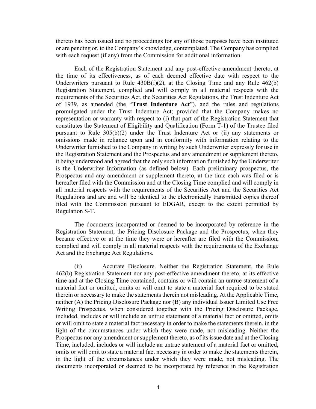 4 thereto has been issued and no proceedings for any of those purposes have been instituted or are pending or, to the Company’s knowledge, contemplated. The Company has complied with each request (if any) from the Commission for additional information. Each of the Registration Statement and any post-effective amendment thereto, at the time of its effectiveness, as of each deemed effective date with respect to the Underwriters pursuant to Rule 430B(f)(2), at the Closing Time and any Rule 462(b) Registration Statement, complied and will comply in all material respects with the requirements of the Securities Act, the Securities Act Regulations, the Trust Indenture Act of 1939, as amended (the “Trust Indenture Act”), and the rules and regulations promulgated under the Trust Indenture Act; provided that the Company makes no representation or warranty with respect to (i) that part of the Registration Statement that constitutes the Statement of Eligibility and Qualification (Form T-1) of the Trustee filed pursuant to Rule 305(b)(2) under the Trust Indenture Act or (ii) any statements or omissions made in reliance upon and in conformity with information relating to the Underwriter furnished to the Company in writing by such Underwriter expressly for use in the Registration Statement and the Prospectus and any amendment or supplement thereto, it being understood and agreed that the only such information furnished by the Underwriter is the Underwriter Information (as defined below). Each preliminary prospectus, the Prospectus and any amendment or supplement thereto, at the time each was filed or is hereafter filed with the Commission and at the Closing Time complied and will comply in all material respects with the requirements of the Securities Act and the Securities Act Regulations and are and will be identical to the electronically transmitted copies thereof filed with the Commission pursuant to EDGAR, except to the extent permitted by Regulation S-T. The documents incorporated or deemed to be incorporated by reference in the Registration Statement, the Pricing Disclosure Package and the Prospectus, when they became effective or at the time they were or hereafter are filed with the Commission, complied and will comply in all material respects with the requirements of the Exchange Act and the Exchange Act Regulations. (ii) Accurate Disclosure. Neither the Registration Statement, the Rule 462(b) Registration Statement nor any post-effective amendment thereto, at its effective time and at the Closing Time contained, contains or will contain an untrue statement of a material fact or omitted, omits or will omit to state a material fact required to be stated therein or necessary to make the statements therein not misleading. At the Applicable Time, neither (A) the Pricing Disclosure Package nor (B) any individual Issuer Limited Use Free Writing Prospectus, when considered together with the Pricing Disclosure Package, included, includes or will include an untrue statement of a material fact or omitted, omits or will omit to state a material fact necessary in order to make the statements therein, in the light of the circumstances under which they were made, not misleading. Neither the Prospectus nor any amendment or supplement thereto, as of its issue date and at the Closing Time, included, includes or will include an untrue statement of a material fact or omitted, omits or will omit to state a material fact necessary in order to make the statements therein, in the light of the circumstances under which they were made, not misleading. The documents incorporated or deemed to be incorporated by reference in the Registration