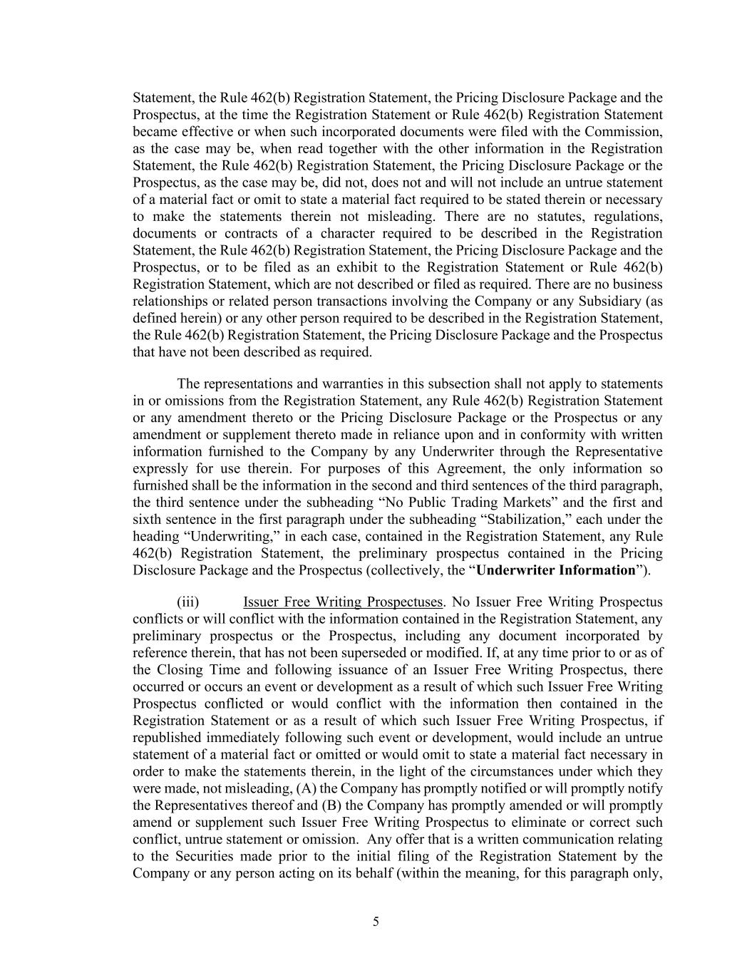 5 Statement, the Rule 462(b) Registration Statement, the Pricing Disclosure Package and the Prospectus, at the time the Registration Statement or Rule 462(b) Registration Statement became effective or when such incorporated documents were filed with the Commission, as the case may be, when read together with the other information in the Registration Statement, the Rule 462(b) Registration Statement, the Pricing Disclosure Package or the Prospectus, as the case may be, did not, does not and will not include an untrue statement of a material fact or omit to state a material fact required to be stated therein or necessary to make the statements therein not misleading. There are no statutes, regulations, documents or contracts of a character required to be described in the Registration Statement, the Rule 462(b) Registration Statement, the Pricing Disclosure Package and the Prospectus, or to be filed as an exhibit to the Registration Statement or Rule 462(b) Registration Statement, which are not described or filed as required. There are no business relationships or related person transactions involving the Company or any Subsidiary (as defined herein) or any other person required to be described in the Registration Statement, the Rule 462(b) Registration Statement, the Pricing Disclosure Package and the Prospectus that have not been described as required. The representations and warranties in this subsection shall not apply to statements in or omissions from the Registration Statement, any Rule 462(b) Registration Statement or any amendment thereto or the Pricing Disclosure Package or the Prospectus or any amendment or supplement thereto made in reliance upon and in conformity with written information furnished to the Company by any Underwriter through the Representative expressly for use therein. For purposes of this Agreement, the only information so furnished shall be the information in the second and third sentences of the third paragraph, the third sentence under the subheading “No Public Trading Markets” and the first and sixth sentence in the first paragraph under the subheading “Stabilization,” each under the heading “Underwriting,” in each case, contained in the Registration Statement, any Rule 462(b) Registration Statement, the preliminary prospectus contained in the Pricing Disclosure Package and the Prospectus (collectively, the “Underwriter Information”). (iii) Issuer Free Writing Prospectuses. No Issuer Free Writing Prospectus conflicts or will conflict with the information contained in the Registration Statement, any preliminary prospectus or the Prospectus, including any document incorporated by reference therein, that has not been superseded or modified. If, at any time prior to or as of the Closing Time and following issuance of an Issuer Free Writing Prospectus, there occurred or occurs an event or development as a result of which such Issuer Free Writing Prospectus conflicted or would conflict with the information then contained in the Registration Statement or as a result of which such Issuer Free Writing Prospectus, if republished immediately following such event or development, would include an untrue statement of a material fact or omitted or would omit to state a material fact necessary in order to make the statements therein, in the light of the circumstances under which they were made, not misleading, (A) the Company has promptly notified or will promptly notify the Representatives thereof and (B) the Company has promptly amended or will promptly amend or supplement such Issuer Free Writing Prospectus to eliminate or correct such conflict, untrue statement or omission. Any offer that is a written communication relating to the Securities made prior to the initial filing of the Registration Statement by the Company or any person acting on its behalf (within the meaning, for this paragraph only,