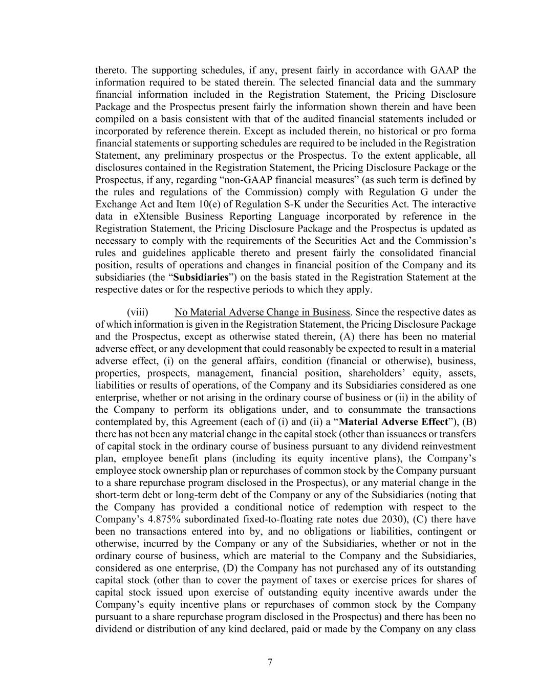 7 thereto. The supporting schedules, if any, present fairly in accordance with GAAP the information required to be stated therein. The selected financial data and the summary financial information included in the Registration Statement, the Pricing Disclosure Package and the Prospectus present fairly the information shown therein and have been compiled on a basis consistent with that of the audited financial statements included or incorporated by reference therein. Except as included therein, no historical or pro forma financial statements or supporting schedules are required to be included in the Registration Statement, any preliminary prospectus or the Prospectus. To the extent applicable, all disclosures contained in the Registration Statement, the Pricing Disclosure Package or the Prospectus, if any, regarding “non-GAAP financial measures” (as such term is defined by the rules and regulations of the Commission) comply with Regulation G under the Exchange Act and Item 10(e) of Regulation S-K under the Securities Act. The interactive data in eXtensible Business Reporting Language incorporated by reference in the Registration Statement, the Pricing Disclosure Package and the Prospectus is updated as necessary to comply with the requirements of the Securities Act and the Commission’s rules and guidelines applicable thereto and present fairly the consolidated financial position, results of operations and changes in financial position of the Company and its subsidiaries (the “Subsidiaries”) on the basis stated in the Registration Statement at the respective dates or for the respective periods to which they apply. (viii) No Material Adverse Change in Business. Since the respective dates as of which information is given in the Registration Statement, the Pricing Disclosure Package and the Prospectus, except as otherwise stated therein, (A) there has been no material adverse effect, or any development that could reasonably be expected to result in a material adverse effect, (i) on the general affairs, condition (financial or otherwise), business, properties, prospects, management, financial position, shareholders’ equity, assets, liabilities or results of operations, of the Company and its Subsidiaries considered as one enterprise, whether or not arising in the ordinary course of business or (ii) in the ability of the Company to perform its obligations under, and to consummate the transactions contemplated by, this Agreement (each of (i) and (ii) a “Material Adverse Effect”), (B) there has not been any material change in the capital stock (other than issuances or transfers of capital stock in the ordinary course of business pursuant to any dividend reinvestment plan, employee benefit plans (including its equity incentive plans), the Company’s employee stock ownership plan or repurchases of common stock by the Company pursuant to a share repurchase program disclosed in the Prospectus), or any material change in the short-term debt or long-term debt of the Company or any of the Subsidiaries (noting that the Company has provided a conditional notice of redemption with respect to the Company’s 4.875% subordinated fixed-to-floating rate notes due 2030), (C) there have been no transactions entered into by, and no obligations or liabilities, contingent or otherwise, incurred by the Company or any of the Subsidiaries, whether or not in the ordinary course of business, which are material to the Company and the Subsidiaries, considered as one enterprise, (D) the Company has not purchased any of its outstanding capital stock (other than to cover the payment of taxes or exercise prices for shares of capital stock issued upon exercise of outstanding equity incentive awards under the Company’s equity incentive plans or repurchases of common stock by the Company pursuant to a share repurchase program disclosed in the Prospectus) and there has been no dividend or distribution of any kind declared, paid or made by the Company on any class