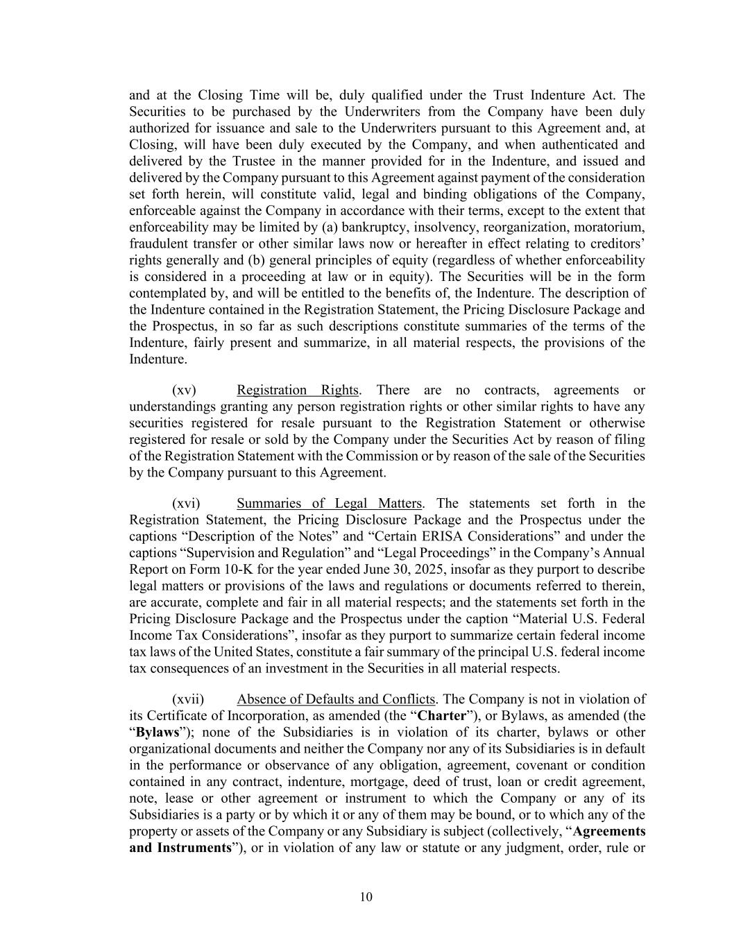 10 and at the Closing Time will be, duly qualified under the Trust Indenture Act. The Securities to be purchased by the Underwriters from the Company have been duly authorized for issuance and sale to the Underwriters pursuant to this Agreement and, at Closing, will have been duly executed by the Company, and when authenticated and delivered by the Trustee in the manner provided for in the Indenture, and issued and delivered by the Company pursuant to this Agreement against payment of the consideration set forth herein, will constitute valid, legal and binding obligations of the Company, enforceable against the Company in accordance with their terms, except to the extent that enforceability may be limited by (a) bankruptcy, insolvency, reorganization, moratorium, fraudulent transfer or other similar laws now or hereafter in effect relating to creditors’ rights generally and (b) general principles of equity (regardless of whether enforceability is considered in a proceeding at law or in equity). The Securities will be in the form contemplated by, and will be entitled to the benefits of, the Indenture. The description of the Indenture contained in the Registration Statement, the Pricing Disclosure Package and the Prospectus, in so far as such descriptions constitute summaries of the terms of the Indenture, fairly present and summarize, in all material respects, the provisions of the Indenture. (xv) Registration Rights. There are no contracts, agreements or understandings granting any person registration rights or other similar rights to have any securities registered for resale pursuant to the Registration Statement or otherwise registered for resale or sold by the Company under the Securities Act by reason of filing of the Registration Statement with the Commission or by reason of the sale of the Securities by the Company pursuant to this Agreement. (xvi) Summaries of Legal Matters. The statements set forth in the Registration Statement, the Pricing Disclosure Package and the Prospectus under the captions “Description of the Notes” and “Certain ERISA Considerations” and under the captions “Supervision and Regulation” and “Legal Proceedings” in the Company’s Annual Report on Form 10-K for the year ended June 30, 2025, insofar as they purport to describe legal matters or provisions of the laws and regulations or documents referred to therein, are accurate, complete and fair in all material respects; and the statements set forth in the Pricing Disclosure Package and the Prospectus under the caption “Material U.S. Federal Income Tax Considerations”, insofar as they purport to summarize certain federal income tax laws of the United States, constitute a fair summary of the principal U.S. federal income tax consequences of an investment in the Securities in all material respects. (xvii) Absence of Defaults and Conflicts. The Company is not in violation of its Certificate of Incorporation, as amended (the “Charter”), or Bylaws, as amended (the “Bylaws”); none of the Subsidiaries is in violation of its charter, bylaws or other organizational documents and neither the Company nor any of its Subsidiaries is in default in the performance or observance of any obligation, agreement, covenant or condition contained in any contract, indenture, mortgage, deed of trust, loan or credit agreement, note, lease or other agreement or instrument to which the Company or any of its Subsidiaries is a party or by which it or any of them may be bound, or to which any of the property or assets of the Company or any Subsidiary is subject (collectively, “Agreements and Instruments”), or in violation of any law or statute or any judgment, order, rule or