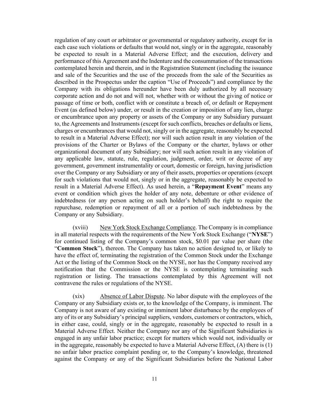 11 regulation of any court or arbitrator or governmental or regulatory authority, except for in each case such violations or defaults that would not, singly or in the aggregate, reasonably be expected to result in a Material Adverse Effect; and the execution, delivery and performance of this Agreement and the Indenture and the consummation of the transactions contemplated herein and therein, and in the Registration Statement (including the issuance and sale of the Securities and the use of the proceeds from the sale of the Securities as described in the Prospectus under the caption “Use of Proceeds”) and compliance by the Company with its obligations hereunder have been duly authorized by all necessary corporate action and do not and will not, whether with or without the giving of notice or passage of time or both, conflict with or constitute a breach of, or default or Repayment Event (as defined below) under, or result in the creation or imposition of any lien, charge or encumbrance upon any property or assets of the Company or any Subsidiary pursuant to, the Agreements and Instruments (except for such conflicts, breaches or defaults or liens, charges or encumbrances that would not, singly or in the aggregate, reasonably be expected to result in a Material Adverse Effect); nor will such action result in any violation of the provisions of the Charter or Bylaws of the Company or the charter, bylaws or other organizational document of any Subsidiary; nor will such action result in any violation of any applicable law, statute, rule, regulation, judgment, order, writ or decree of any government, government instrumentality or court, domestic or foreign, having jurisdiction over the Company or any Subsidiary or any of their assets, properties or operations (except for such violations that would not, singly or in the aggregate, reasonably be expected to result in a Material Adverse Effect). As used herein, a “Repayment Event” means any event or condition which gives the holder of any note, debenture or other evidence of indebtedness (or any person acting on such holder’s behalf) the right to require the repurchase, redemption or repayment of all or a portion of such indebtedness by the Company or any Subsidiary. (xviii) New York Stock Exchange Compliance. The Company is in compliance in all material respects with the requirements of the New York Stock Exchange (“NYSE”) for continued listing of the Company’s common stock, $0.01 par value per share (the “Common Stock”), thereon. The Company has taken no action designed to, or likely to have the effect of, terminating the registration of the Common Stock under the Exchange Act or the listing of the Common Stock on the NYSE, nor has the Company received any notification that the Commission or the NYSE is contemplating terminating such registration or listing. The transactions contemplated by this Agreement will not contravene the rules or regulations of the NYSE. (xix) Absence of Labor Dispute. No labor dispute with the employees of the Company or any Subsidiary exists or, to the knowledge of the Company, is imminent. The Company is not aware of any existing or imminent labor disturbance by the employees of any of its or any Subsidiary’s principal suppliers, vendors, customers or contractors, which, in either case, could, singly or in the aggregate, reasonably be expected to result in a Material Adverse Effect. Neither the Company nor any of the Significant Subsidiaries is engaged in any unfair labor practice; except for matters which would not, individually or in the aggregate, reasonably be expected to have a Material Adverse Effect, (A) there is (1) no unfair labor practice complaint pending or, to the Company’s knowledge, threatened against the Company or any of the Significant Subsidiaries before the National Labor