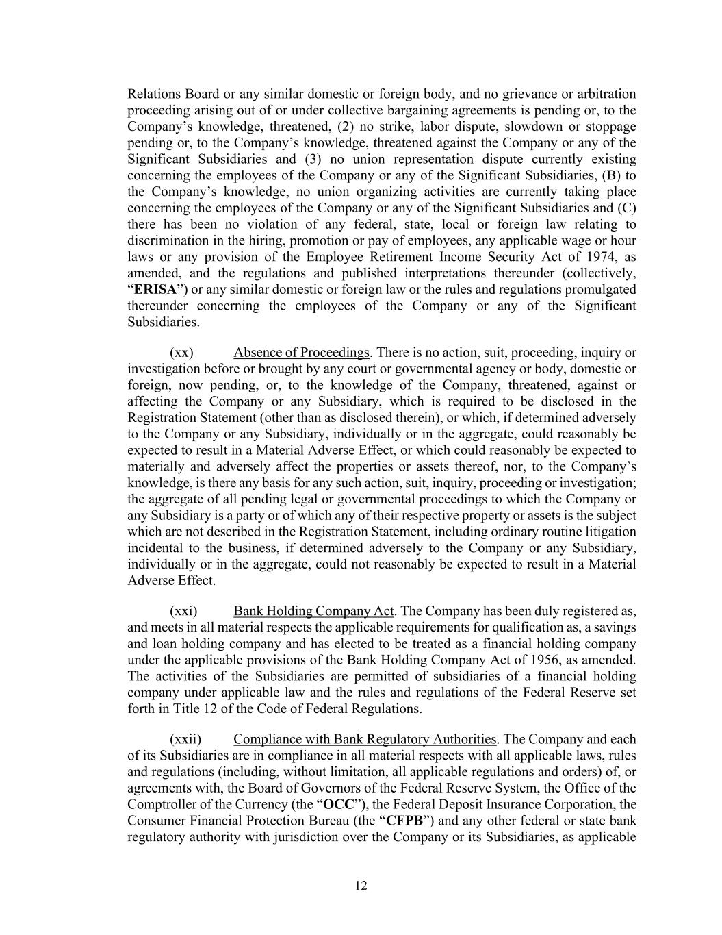 12 Relations Board or any similar domestic or foreign body, and no grievance or arbitration proceeding arising out of or under collective bargaining agreements is pending or, to the Company’s knowledge, threatened, (2) no strike, labor dispute, slowdown or stoppage pending or, to the Company’s knowledge, threatened against the Company or any of the Significant Subsidiaries and (3) no union representation dispute currently existing concerning the employees of the Company or any of the Significant Subsidiaries, (B) to the Company’s knowledge, no union organizing activities are currently taking place concerning the employees of the Company or any of the Significant Subsidiaries and (C) there has been no violation of any federal, state, local or foreign law relating to discrimination in the hiring, promotion or pay of employees, any applicable wage or hour laws or any provision of the Employee Retirement Income Security Act of 1974, as amended, and the regulations and published interpretations thereunder (collectively, “ERISA”) or any similar domestic or foreign law or the rules and regulations promulgated thereunder concerning the employees of the Company or any of the Significant Subsidiaries. (xx) Absence of Proceedings. There is no action, suit, proceeding, inquiry or investigation before or brought by any court or governmental agency or body, domestic or foreign, now pending, or, to the knowledge of the Company, threatened, against or affecting the Company or any Subsidiary, which is required to be disclosed in the Registration Statement (other than as disclosed therein), or which, if determined adversely to the Company or any Subsidiary, individually or in the aggregate, could reasonably be expected to result in a Material Adverse Effect, or which could reasonably be expected to materially and adversely affect the properties or assets thereof, nor, to the Company’s knowledge, is there any basis for any such action, suit, inquiry, proceeding or investigation; the aggregate of all pending legal or governmental proceedings to which the Company or any Subsidiary is a party or of which any of their respective property or assets is the subject which are not described in the Registration Statement, including ordinary routine litigation incidental to the business, if determined adversely to the Company or any Subsidiary, individually or in the aggregate, could not reasonably be expected to result in a Material Adverse Effect. (xxi) Bank Holding Company Act. The Company has been duly registered as, and meets in all material respects the applicable requirements for qualification as, a savings and loan holding company and has elected to be treated as a financial holding company under the applicable provisions of the Bank Holding Company Act of 1956, as amended. The activities of the Subsidiaries are permitted of subsidiaries of a financial holding company under applicable law and the rules and regulations of the Federal Reserve set forth in Title 12 of the Code of Federal Regulations. (xxii) Compliance with Bank Regulatory Authorities. The Company and each of its Subsidiaries are in compliance in all material respects with all applicable laws, rules and regulations (including, without limitation, all applicable regulations and orders) of, or agreements with, the Board of Governors of the Federal Reserve System, the Office of the Comptroller of the Currency (the “OCC”), the Federal Deposit Insurance Corporation, the Consumer Financial Protection Bureau (the “CFPB”) and any other federal or state bank regulatory authority with jurisdiction over the Company or its Subsidiaries, as applicable