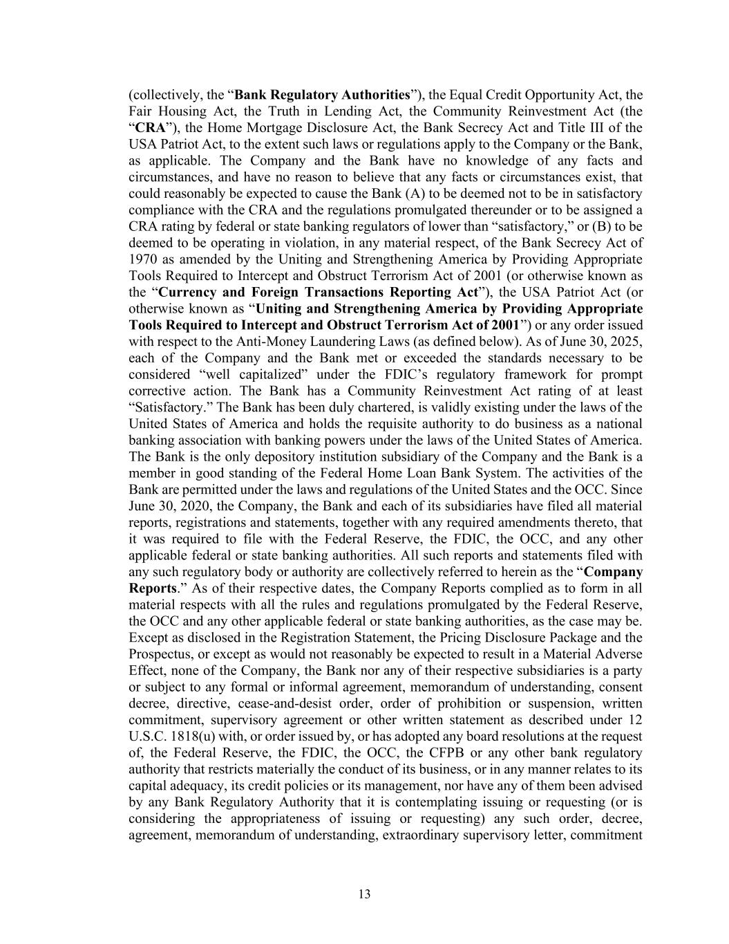 13 (collectively, the “Bank Regulatory Authorities”), the Equal Credit Opportunity Act, the Fair Housing Act, the Truth in Lending Act, the Community Reinvestment Act (the “CRA”), the Home Mortgage Disclosure Act, the Bank Secrecy Act and Title III of the USA Patriot Act, to the extent such laws or regulations apply to the Company or the Bank, as applicable. The Company and the Bank have no knowledge of any facts and circumstances, and have no reason to believe that any facts or circumstances exist, that could reasonably be expected to cause the Bank (A) to be deemed not to be in satisfactory compliance with the CRA and the regulations promulgated thereunder or to be assigned a CRA rating by federal or state banking regulators of lower than “satisfactory,” or (B) to be deemed to be operating in violation, in any material respect, of the Bank Secrecy Act of 1970 as amended by the Uniting and Strengthening America by Providing Appropriate Tools Required to Intercept and Obstruct Terrorism Act of 2001 (or otherwise known as the “Currency and Foreign Transactions Reporting Act”), the USA Patriot Act (or otherwise known as “Uniting and Strengthening America by Providing Appropriate Tools Required to Intercept and Obstruct Terrorism Act of 2001”) or any order issued with respect to the Anti-Money Laundering Laws (as defined below). As of June 30, 2025, each of the Company and the Bank met or exceeded the standards necessary to be considered “well capitalized” under the FDIC’s regulatory framework for prompt corrective action. The Bank has a Community Reinvestment Act rating of at least “Satisfactory.” The Bank has been duly chartered, is validly existing under the laws of the United States of America and holds the requisite authority to do business as a national banking association with banking powers under the laws of the United States of America. The Bank is the only depository institution subsidiary of the Company and the Bank is a member in good standing of the Federal Home Loan Bank System. The activities of the Bank are permitted under the laws and regulations of the United States and the OCC. Since June 30, 2020, the Company, the Bank and each of its subsidiaries have filed all material reports, registrations and statements, together with any required amendments thereto, that it was required to file with the Federal Reserve, the FDIC, the OCC, and any other applicable federal or state banking authorities. All such reports and statements filed with any such regulatory body or authority are collectively referred to herein as the “Company Reports.” As of their respective dates, the Company Reports complied as to form in all material respects with all the rules and regulations promulgated by the Federal Reserve, the OCC and any other applicable federal or state banking authorities, as the case may be. Except as disclosed in the Registration Statement, the Pricing Disclosure Package and the Prospectus, or except as would not reasonably be expected to result in a Material Adverse Effect, none of the Company, the Bank nor any of their respective subsidiaries is a party or subject to any formal or informal agreement, memorandum of understanding, consent decree, directive, cease-and-desist order, order of prohibition or suspension, written commitment, supervisory agreement or other written statement as described under 12 U.S.C. 1818(u) with, or order issued by, or has adopted any board resolutions at the request of, the Federal Reserve, the FDIC, the OCC, the CFPB or any other bank regulatory authority that restricts materially the conduct of its business, or in any manner relates to its capital adequacy, its credit policies or its management, nor have any of them been advised by any Bank Regulatory Authority that it is contemplating issuing or requesting (or is considering the appropriateness of issuing or requesting) any such order, decree, agreement, memorandum of understanding, extraordinary supervisory letter, commitment