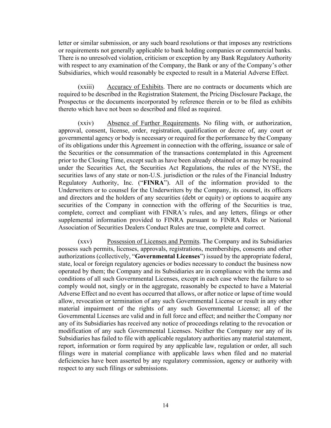 14 letter or similar submission, or any such board resolutions or that imposes any restrictions or requirements not generally applicable to bank holding companies or commercial banks. There is no unresolved violation, criticism or exception by any Bank Regulatory Authority with respect to any examination of the Company, the Bank or any of the Company’s other Subsidiaries, which would reasonably be expected to result in a Material Adverse Effect. (xxiii) Accuracy of Exhibits. There are no contracts or documents which are required to be described in the Registration Statement, the Pricing Disclosure Package, the Prospectus or the documents incorporated by reference therein or to be filed as exhibits thereto which have not been so described and filed as required. (xxiv) Absence of Further Requirements. No filing with, or authorization, approval, consent, license, order, registration, qualification or decree of, any court or governmental agency or body is necessary or required for the performance by the Company of its obligations under this Agreement in connection with the offering, issuance or sale of the Securities or the consummation of the transactions contemplated in this Agreement prior to the Closing Time, except such as have been already obtained or as may be required under the Securities Act, the Securities Act Regulations, the rules of the NYSE, the securities laws of any state or non-U.S. jurisdiction or the rules of the Financial Industry Regulatory Authority, Inc. (“FINRA”). All of the information provided to the Underwriters or to counsel for the Underwriters by the Company, its counsel, its officers and directors and the holders of any securities (debt or equity) or options to acquire any securities of the Company in connection with the offering of the Securities is true, complete, correct and compliant with FINRA’s rules, and any letters, filings or other supplemental information provided to FINRA pursuant to FINRA Rules or National Association of Securities Dealers Conduct Rules are true, complete and correct. (xxv) Possession of Licenses and Permits. The Company and its Subsidiaries possess such permits, licenses, approvals, registrations, memberships, consents and other authorizations (collectively, “Governmental Licenses”) issued by the appropriate federal, state, local or foreign regulatory agencies or bodies necessary to conduct the business now operated by them; the Company and its Subsidiaries are in compliance with the terms and conditions of all such Governmental Licenses, except in each case where the failure to so comply would not, singly or in the aggregate, reasonably be expected to have a Material Adverse Effect and no event has occurred that allows, or after notice or lapse of time would allow, revocation or termination of any such Governmental License or result in any other material impairment of the rights of any such Governmental License; all of the Governmental Licenses are valid and in full force and effect; and neither the Company nor any of its Subsidiaries has received any notice of proceedings relating to the revocation or modification of any such Governmental Licenses. Neither the Company nor any of its Subsidiaries has failed to file with applicable regulatory authorities any material statement, report, information or form required by any applicable law, regulation or order, all such filings were in material compliance with applicable laws when filed and no material deficiencies have been asserted by any regulatory commission, agency or authority with respect to any such filings or submissions.