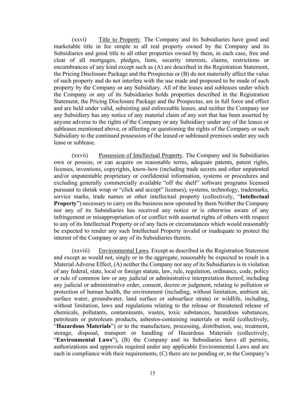 15 (xxvi) Title to Property. The Company and its Subsidiaries have good and marketable title in fee simple to all real property owned by the Company and its Subsidiaries and good title to all other properties owned by them, in each case, free and clear of all mortgages, pledges, liens, security interests, claims, restrictions or encumbrances of any kind except such as (A) are described in the Registration Statement, the Pricing Disclosure Package and the Prospectus or (B) do not materially affect the value of such property and do not interfere with the use made and proposed to be made of such property by the Company or any Subsidiary. All of the leases and subleases under which the Company or any of its Subsidiaries holds properties described in the Registration Statement, the Pricing Disclosure Package and the Prospectus, are in full force and effect and are held under valid, subsisting and enforceable leases, and neither the Company nor any Subsidiary has any notice of any material claim of any sort that has been asserted by anyone adverse to the rights of the Company or any Subsidiary under any of the leases or subleases mentioned above, or affecting or questioning the rights of the Company or such Subsidiary to the continued possession of the leased or subleased premises under any such lease or sublease. (xxvii) Possession of Intellectual Property. The Company and its Subsidiaries own or possess, or can acquire on reasonable terms, adequate patents, patent rights, licenses, inventions, copyrights, know-how (including trade secrets and other unpatented and/or unpatentable proprietary or confidential information, systems or procedures and excluding generally commercially available “off the shelf” software programs licensed pursuant to shrink wrap or “click and accept” licenses), systems, technology, trademarks, service marks, trade names or other intellectual property (collectively, “Intellectual Property”) necessary to carry on the business now operated by them Neither the Company nor any of its Subsidiaries has received any notice or is otherwise aware of any infringement or misappropriation of or conflict with asserted rights of others with respect to any of its Intellectual Property or of any facts or circumstances which would reasonably be expected to render any such Intellectual Property invalid or inadequate to protect the interest of the Company or any of its Subsidiaries therein. (xxviii) Environmental Laws. Except as described in the Registration Statement and except as would not, singly or in the aggregate, reasonably be expected to result in a Material Adverse Effect, (A) neither the Company nor any of its Subsidiaries is in violation of any federal, state, local or foreign statute, law, rule, regulation, ordinance, code, policy or rule of common law or any judicial or administrative interpretation thereof, including any judicial or administrative order, consent, decree or judgment, relating to pollution or protection of human health, the environment (including, without limitation, ambient air, surface water, groundwater, land surface or subsurface strata) or wildlife, including, without limitation, laws and regulations relating to the release or threatened release of chemicals, pollutants, contaminants, wastes, toxic substances, hazardous substances, petroleum or petroleum products, asbestos-containing materials or mold (collectively, “Hazardous Materials”) or to the manufacture, processing, distribution, use, treatment, storage, disposal, transport or handling of Hazardous Materials (collectively, “Environmental Laws”), (B) the Company and its Subsidiaries have all permits, authorizations and approvals required under any applicable Environmental Laws and are each in compliance with their requirements, (C) there are no pending or, to the Company’s