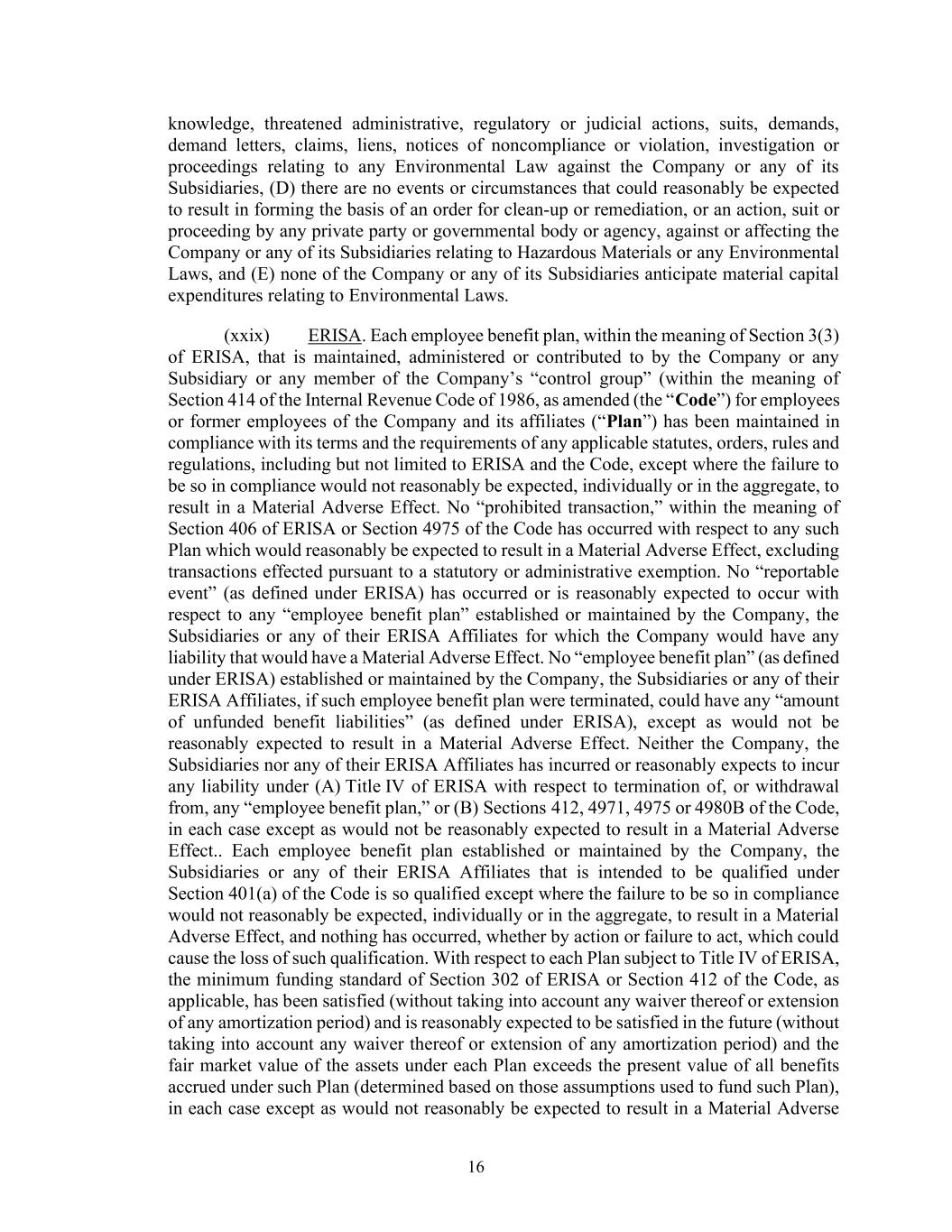16 knowledge, threatened administrative, regulatory or judicial actions, suits, demands, demand letters, claims, liens, notices of noncompliance or violation, investigation or proceedings relating to any Environmental Law against the Company or any of its Subsidiaries, (D) there are no events or circumstances that could reasonably be expected to result in forming the basis of an order for clean-up or remediation, or an action, suit or proceeding by any private party or governmental body or agency, against or affecting the Company or any of its Subsidiaries relating to Hazardous Materials or any Environmental Laws, and (E) none of the Company or any of its Subsidiaries anticipate material capital expenditures relating to Environmental Laws. (xxix) ERISA. Each employee benefit plan, within the meaning of Section 3(3) of ERISA, that is maintained, administered or contributed to by the Company or any Subsidiary or any member of the Company’s “control group” (within the meaning of Section 414 of the Internal Revenue Code of 1986, as amended (the “Code”) for employees or former employees of the Company and its affiliates (“Plan”) has been maintained in compliance with its terms and the requirements of any applicable statutes, orders, rules and regulations, including but not limited to ERISA and the Code, except where the failure to be so in compliance would not reasonably be expected, individually or in the aggregate, to result in a Material Adverse Effect. No “prohibited transaction,” within the meaning of Section 406 of ERISA or Section 4975 of the Code has occurred with respect to any such Plan which would reasonably be expected to result in a Material Adverse Effect, excluding transactions effected pursuant to a statutory or administrative exemption. No “reportable event” (as defined under ERISA) has occurred or is reasonably expected to occur with respect to any “employee benefit plan” established or maintained by the Company, the Subsidiaries or any of their ERISA Affiliates for which the Company would have any liability that would have a Material Adverse Effect. No “employee benefit plan” (as defined under ERISA) established or maintained by the Company, the Subsidiaries or any of their ERISA Affiliates, if such employee benefit plan were terminated, could have any “amount of unfunded benefit liabilities” (as defined under ERISA), except as would not be reasonably expected to result in a Material Adverse Effect. Neither the Company, the Subsidiaries nor any of their ERISA Affiliates has incurred or reasonably expects to incur any liability under (A) Title IV of ERISA with respect to termination of, or withdrawal from, any “employee benefit plan,” or (B) Sections 412, 4971, 4975 or 4980B of the Code, in each case except as would not be reasonably expected to result in a Material Adverse Effect.. Each employee benefit plan established or maintained by the Company, the Subsidiaries or any of their ERISA Affiliates that is intended to be qualified under Section 401(a) of the Code is so qualified except where the failure to be so in compliance would not reasonably be expected, individually or in the aggregate, to result in a Material Adverse Effect, and nothing has occurred, whether by action or failure to act, which could cause the loss of such qualification. With respect to each Plan subject to Title IV of ERISA, the minimum funding standard of Section 302 of ERISA or Section 412 of the Code, as applicable, has been satisfied (without taking into account any waiver thereof or extension of any amortization period) and is reasonably expected to be satisfied in the future (without taking into account any waiver thereof or extension of any amortization period) and the fair market value of the assets under each Plan exceeds the present value of all benefits accrued under such Plan (determined based on those assumptions used to fund such Plan), in each case except as would not reasonably be expected to result in a Material Adverse