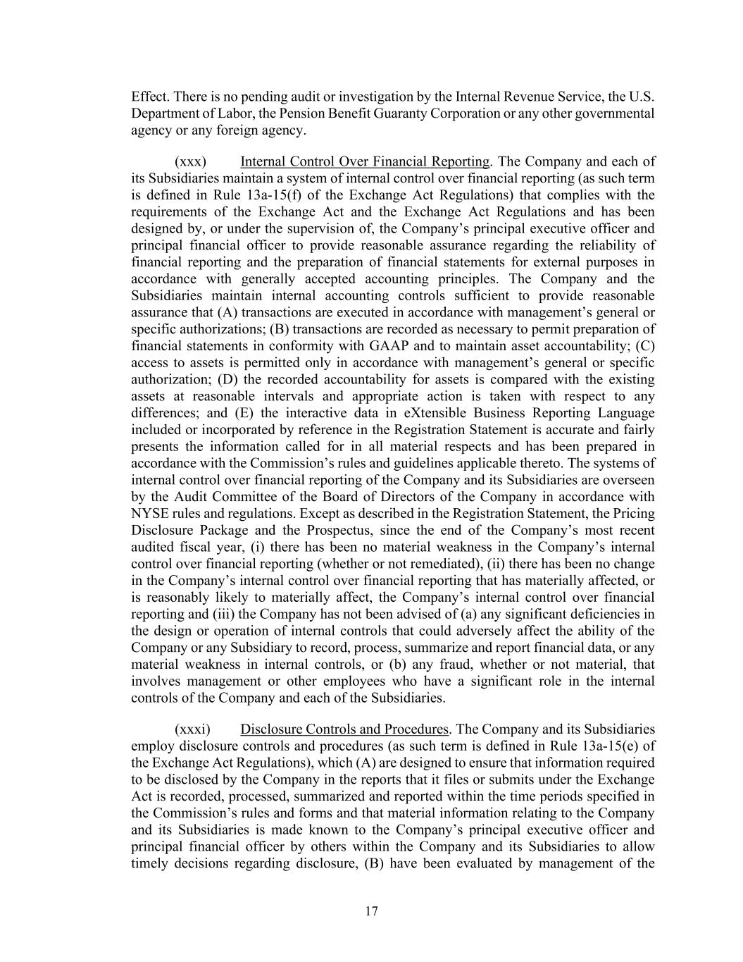 17 Effect. There is no pending audit or investigation by the Internal Revenue Service, the U.S. Department of Labor, the Pension Benefit Guaranty Corporation or any other governmental agency or any foreign agency. (xxx) Internal Control Over Financial Reporting. The Company and each of its Subsidiaries maintain a system of internal control over financial reporting (as such term is defined in Rule 13a-15(f) of the Exchange Act Regulations) that complies with the requirements of the Exchange Act and the Exchange Act Regulations and has been designed by, or under the supervision of, the Company’s principal executive officer and principal financial officer to provide reasonable assurance regarding the reliability of financial reporting and the preparation of financial statements for external purposes in accordance with generally accepted accounting principles. The Company and the Subsidiaries maintain internal accounting controls sufficient to provide reasonable assurance that (A) transactions are executed in accordance with management’s general or specific authorizations; (B) transactions are recorded as necessary to permit preparation of financial statements in conformity with GAAP and to maintain asset accountability; (C) access to assets is permitted only in accordance with management’s general or specific authorization; (D) the recorded accountability for assets is compared with the existing assets at reasonable intervals and appropriate action is taken with respect to any differences; and (E) the interactive data in eXtensible Business Reporting Language included or incorporated by reference in the Registration Statement is accurate and fairly presents the information called for in all material respects and has been prepared in accordance with the Commission’s rules and guidelines applicable thereto. The systems of internal control over financial reporting of the Company and its Subsidiaries are overseen by the Audit Committee of the Board of Directors of the Company in accordance with NYSE rules and regulations. Except as described in the Registration Statement, the Pricing Disclosure Package and the Prospectus, since the end of the Company’s most recent audited fiscal year, (i) there has been no material weakness in the Company’s internal control over financial reporting (whether or not remediated), (ii) there has been no change in the Company’s internal control over financial reporting that has materially affected, or is reasonably likely to materially affect, the Company’s internal control over financial reporting and (iii) the Company has not been advised of (a) any significant deficiencies in the design or operation of internal controls that could adversely affect the ability of the Company or any Subsidiary to record, process, summarize and report financial data, or any material weakness in internal controls, or (b) any fraud, whether or not material, that involves management or other employees who have a significant role in the internal controls of the Company and each of the Subsidiaries. (xxxi) Disclosure Controls and Procedures. The Company and its Subsidiaries employ disclosure controls and procedures (as such term is defined in Rule 13a-15(e) of the Exchange Act Regulations), which (A) are designed to ensure that information required to be disclosed by the Company in the reports that it files or submits under the Exchange Act is recorded, processed, summarized and reported within the time periods specified in the Commission’s rules and forms and that material information relating to the Company and its Subsidiaries is made known to the Company’s principal executive officer and principal financial officer by others within the Company and its Subsidiaries to allow timely decisions regarding disclosure, (B) have been evaluated by management of the