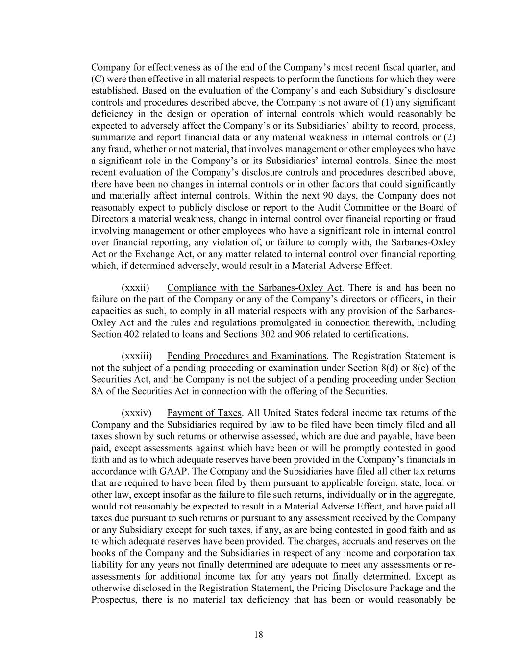 18 Company for effectiveness as of the end of the Company’s most recent fiscal quarter, and (C) were then effective in all material respects to perform the functions for which they were established. Based on the evaluation of the Company’s and each Subsidiary’s disclosure controls and procedures described above, the Company is not aware of (1) any significant deficiency in the design or operation of internal controls which would reasonably be expected to adversely affect the Company’s or its Subsidiaries’ ability to record, process, summarize and report financial data or any material weakness in internal controls or (2) any fraud, whether or not material, that involves management or other employees who have a significant role in the Company’s or its Subsidiaries’ internal controls. Since the most recent evaluation of the Company’s disclosure controls and procedures described above, there have been no changes in internal controls or in other factors that could significantly and materially affect internal controls. Within the next 90 days, the Company does not reasonably expect to publicly disclose or report to the Audit Committee or the Board of Directors a material weakness, change in internal control over financial reporting or fraud involving management or other employees who have a significant role in internal control over financial reporting, any violation of, or failure to comply with, the Sarbanes-Oxley Act or the Exchange Act, or any matter related to internal control over financial reporting which, if determined adversely, would result in a Material Adverse Effect. (xxxii) Compliance with the Sarbanes-Oxley Act. There is and has been no failure on the part of the Company or any of the Company’s directors or officers, in their capacities as such, to comply in all material respects with any provision of the Sarbanes- Oxley Act and the rules and regulations promulgated in connection therewith, including Section 402 related to loans and Sections 302 and 906 related to certifications. (xxxiii) Pending Procedures and Examinations. The Registration Statement is not the subject of a pending proceeding or examination under Section 8(d) or 8(e) of the Securities Act, and the Company is not the subject of a pending proceeding under Section 8A of the Securities Act in connection with the offering of the Securities. (xxxiv) Payment of Taxes. All United States federal income tax returns of the Company and the Subsidiaries required by law to be filed have been timely filed and all taxes shown by such returns or otherwise assessed, which are due and payable, have been paid, except assessments against which have been or will be promptly contested in good faith and as to which adequate reserves have been provided in the Company’s financials in accordance with GAAP. The Company and the Subsidiaries have filed all other tax returns that are required to have been filed by them pursuant to applicable foreign, state, local or other law, except insofar as the failure to file such returns, individually or in the aggregate, would not reasonably be expected to result in a Material Adverse Effect, and have paid all taxes due pursuant to such returns or pursuant to any assessment received by the Company or any Subsidiary except for such taxes, if any, as are being contested in good faith and as to which adequate reserves have been provided. The charges, accruals and reserves on the books of the Company and the Subsidiaries in respect of any income and corporation tax liability for any years not finally determined are adequate to meet any assessments or re- assessments for additional income tax for any years not finally determined. Except as otherwise disclosed in the Registration Statement, the Pricing Disclosure Package and the Prospectus, there is no material tax deficiency that has been or would reasonably be