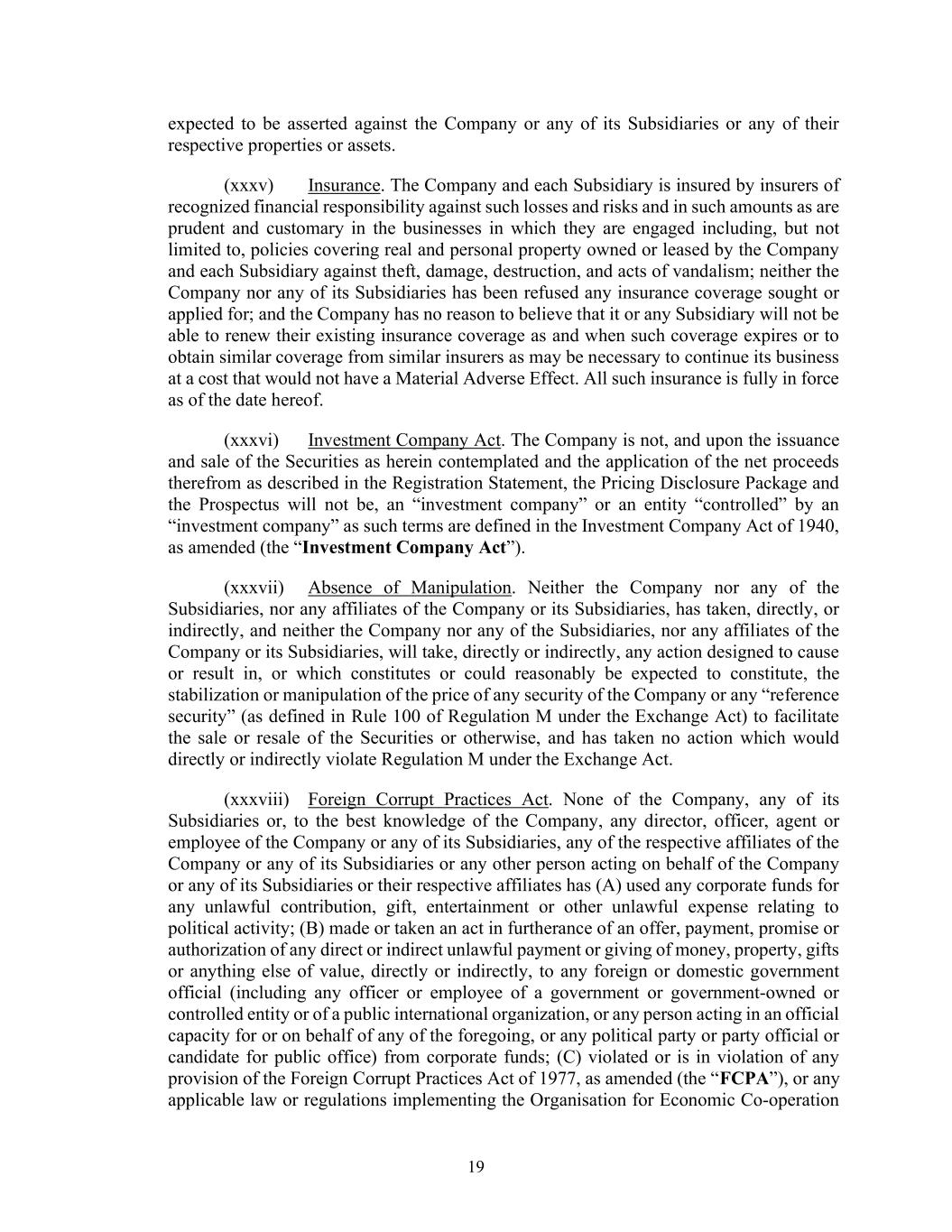 19 expected to be asserted against the Company or any of its Subsidiaries or any of their respective properties or assets. (xxxv) Insurance. The Company and each Subsidiary is insured by insurers of recognized financial responsibility against such losses and risks and in such amounts as are prudent and customary in the businesses in which they are engaged including, but not limited to, policies covering real and personal property owned or leased by the Company and each Subsidiary against theft, damage, destruction, and acts of vandalism; neither the Company nor any of its Subsidiaries has been refused any insurance coverage sought or applied for; and the Company has no reason to believe that it or any Subsidiary will not be able to renew their existing insurance coverage as and when such coverage expires or to obtain similar coverage from similar insurers as may be necessary to continue its business at a cost that would not have a Material Adverse Effect. All such insurance is fully in force as of the date hereof. (xxxvi) Investment Company Act. The Company is not, and upon the issuance and sale of the Securities as herein contemplated and the application of the net proceeds therefrom as described in the Registration Statement, the Pricing Disclosure Package and the Prospectus will not be, an “investment company” or an entity “controlled” by an “investment company” as such terms are defined in the Investment Company Act of 1940, as amended (the “Investment Company Act”). (xxxvii) Absence of Manipulation. Neither the Company nor any of the Subsidiaries, nor any affiliates of the Company or its Subsidiaries, has taken, directly, or indirectly, and neither the Company nor any of the Subsidiaries, nor any affiliates of the Company or its Subsidiaries, will take, directly or indirectly, any action designed to cause or result in, or which constitutes or could reasonably be expected to constitute, the stabilization or manipulation of the price of any security of the Company or any “reference security” (as defined in Rule 100 of Regulation M under the Exchange Act) to facilitate the sale or resale of the Securities or otherwise, and has taken no action which would directly or indirectly violate Regulation M under the Exchange Act. (xxxviii) Foreign Corrupt Practices Act. None of the Company, any of its Subsidiaries or, to the best knowledge of the Company, any director, officer, agent or employee of the Company or any of its Subsidiaries, any of the respective affiliates of the Company or any of its Subsidiaries or any other person acting on behalf of the Company or any of its Subsidiaries or their respective affiliates has (A) used any corporate funds for any unlawful contribution, gift, entertainment or other unlawful expense relating to political activity; (B) made or taken an act in furtherance of an offer, payment, promise or authorization of any direct or indirect unlawful payment or giving of money, property, gifts or anything else of value, directly or indirectly, to any foreign or domestic government official (including any officer or employee of a government or government-owned or controlled entity or of a public international organization, or any person acting in an official capacity for or on behalf of any of the foregoing, or any political party or party official or candidate for public office) from corporate funds; (C) violated or is in violation of any provision of the Foreign Corrupt Practices Act of 1977, as amended (the “FCPA”), or any applicable law or regulations implementing the Organisation for Economic Co-operation