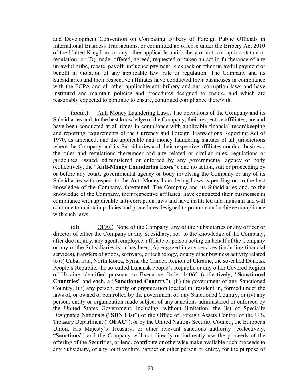 20 and Development Convention on Combating Bribery of Foreign Public Officials in International Business Transactions, or committed an offense under the Bribery Act 2010 of the United Kingdom, or any other applicable anti-bribery or anti-corruption statute or regulation; or (D) made, offered, agreed, requested or taken an act in furtherance of any unlawful bribe, rebate, payoff, influence payment, kickback or other unlawful payment or benefit in violation of any applicable law, rule or regulation. The Company and its Subsidiaries and their respective affiliates have conducted their businesses in compliance with the FCPA and all other applicable anti-bribery and anti-corruption laws and have instituted and maintain policies and procedures designed to ensure, and which are reasonably expected to continue to ensure, continued compliance therewith. (xxxix) Anti-Money Laundering Laws. The operations of the Company and its Subsidiaries and, to the best knowledge of the Company, their respective affiliates, are and have been conducted at all times in compliance with applicable financial recordkeeping and reporting requirements of the Currency and Foreign Transactions Reporting Act of 1970, as amended, and the applicable anti-money laundering statutes of all jurisdictions where the Company and its Subsidiaries and their respective affiliates conduct business, the rules and regulations thereunder and any related or similar rules, regulations or guidelines, issued, administered or enforced by any governmental agency or body (collectively, the “Anti-Money Laundering Laws”); and no action, suit or proceeding by or before any court, governmental agency or body involving the Company or any of its Subsidiaries with respect to the Anti-Money Laundering Laws is pending or, to the best knowledge of the Company, threatened. The Company and its Subsidiaries and, to the knowledge of the Company, their respective affiliates, have conducted their businesses in compliance with applicable anti-corruption laws and have instituted and maintain and will continue to maintain policies and procedures designed to promote and achieve compliance with such laws. (xl) OFAC. None of the Company, any of the Subsidiaries or any officer or director of either the Company or any Subsidiary, nor, to the knowledge of the Company, after due inquiry, any agent, employee, affiliate or person acting on behalf of the Company or any of the Subsidiaries is or has been (A) engaged in any services (including financial services), transfers of goods, software, or technology, or any other business activity related to (i) Cuba, Iran, North Korea, Syria, the Crimea Region of Ukraine, the so-called Donetsk People’s Republic, the so-called Luhansk People’s Republic or any other Covered Region of Ukraine identified pursuant to Executive Order 14065 (collectively, “Sanctioned Countries” and each, a “Sanctioned Country”), (ii) the government of any Sanctioned Country, (iii) any person, entity or organization located in, resident in, formed under the laws of, or owned or controlled by the government of, any Sanctioned Country, or (iv) any person, entity or organization made subject of any sanctions administered or enforced by the United States Government, including, without limitation, the list of Specially Designated Nationals (“SDN List”) of the Office of Foreign Assets Control of the U.S. Treasury Department (“OFAC”), or by the United Nations Security Council, the European Union, His Majesty’s Treasury, or other relevant sanctions authority (collectively, “Sanctions”) and the Company will not directly or indirectly use the proceeds of the offering of the Securities, or lend, contribute or otherwise make available such proceeds to any Subsidiary, or any joint venture partner or other person or entity, for the purpose of