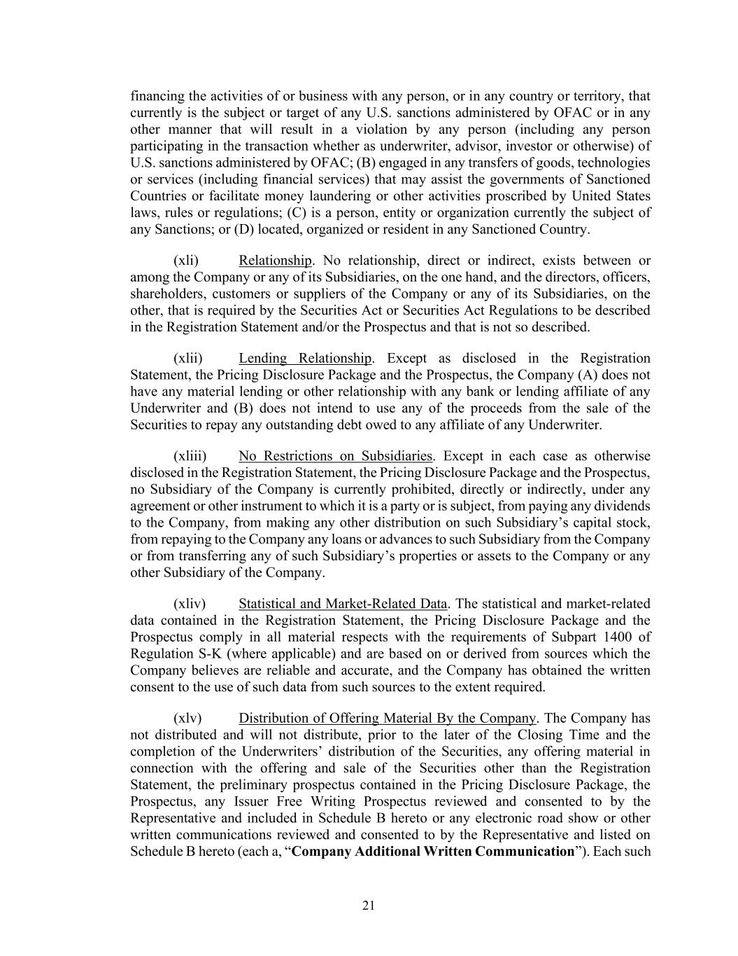 21 financing the activities of or business with any person, or in any country or territory, that currently is the subject or target of any U.S. sanctions administered by OFAC or in any other manner that will result in a violation by any person (including any person participating in the transaction whether as underwriter, advisor, investor or otherwise) of U.S. sanctions administered by OFAC; (B) engaged in any transfers of goods, technologies or services (including financial services) that may assist the governments of Sanctioned Countries or facilitate money laundering or other activities proscribed by United States laws, rules or regulations; (C) is a person, entity or organization currently the subject of any Sanctions; or (D) located, organized or resident in any Sanctioned Country. (xli) Relationship. No relationship, direct or indirect, exists between or among the Company or any of its Subsidiaries, on the one hand, and the directors, officers, shareholders, customers or suppliers of the Company or any of its Subsidiaries, on the other, that is required by the Securities Act or Securities Act Regulations to be described in the Registration Statement and/or the Prospectus and that is not so described. (xlii) Lending Relationship. Except as disclosed in the Registration Statement, the Pricing Disclosure Package and the Prospectus, the Company (A) does not have any material lending or other relationship with any bank or lending affiliate of any Underwriter and (B) does not intend to use any of the proceeds from the sale of the Securities to repay any outstanding debt owed to any affiliate of any Underwriter. (xliii) No Restrictions on Subsidiaries. Except in each case as otherwise disclosed in the Registration Statement, the Pricing Disclosure Package and the Prospectus, no Subsidiary of the Company is currently prohibited, directly or indirectly, under any agreement or other instrument to which it is a party or is subject, from paying any dividends to the Company, from making any other distribution on such Subsidiary’s capital stock, from repaying to the Company any loans or advances to such Subsidiary from the Company or from transferring any of such Subsidiary’s properties or assets to the Company or any other Subsidiary of the Company. (xliv) Statistical and Market-Related Data. The statistical and market-related data contained in the Registration Statement, the Pricing Disclosure Package and the Prospectus comply in all material respects with the requirements of Subpart 1400 of Regulation S-K (where applicable) and are based on or derived from sources which the Company believes are reliable and accurate, and the Company has obtained the written consent to the use of such data from such sources to the extent required. (xlv) Distribution of Offering Material By the Company. The Company has not distributed and will not distribute, prior to the later of the Closing Time and the completion of the Underwriters’ distribution of the Securities, any offering material in connection with the offering and sale of the Securities other than the Registration Statement, the preliminary prospectus contained in the Pricing Disclosure Package, the Prospectus, any Issuer Free Writing Prospectus reviewed and consented to by the Representative and included in Schedule B hereto or any electronic road show or other written communications reviewed and consented to by the Representative and listed on Schedule B hereto (each a, “Company Additional Written Communication”). Each such