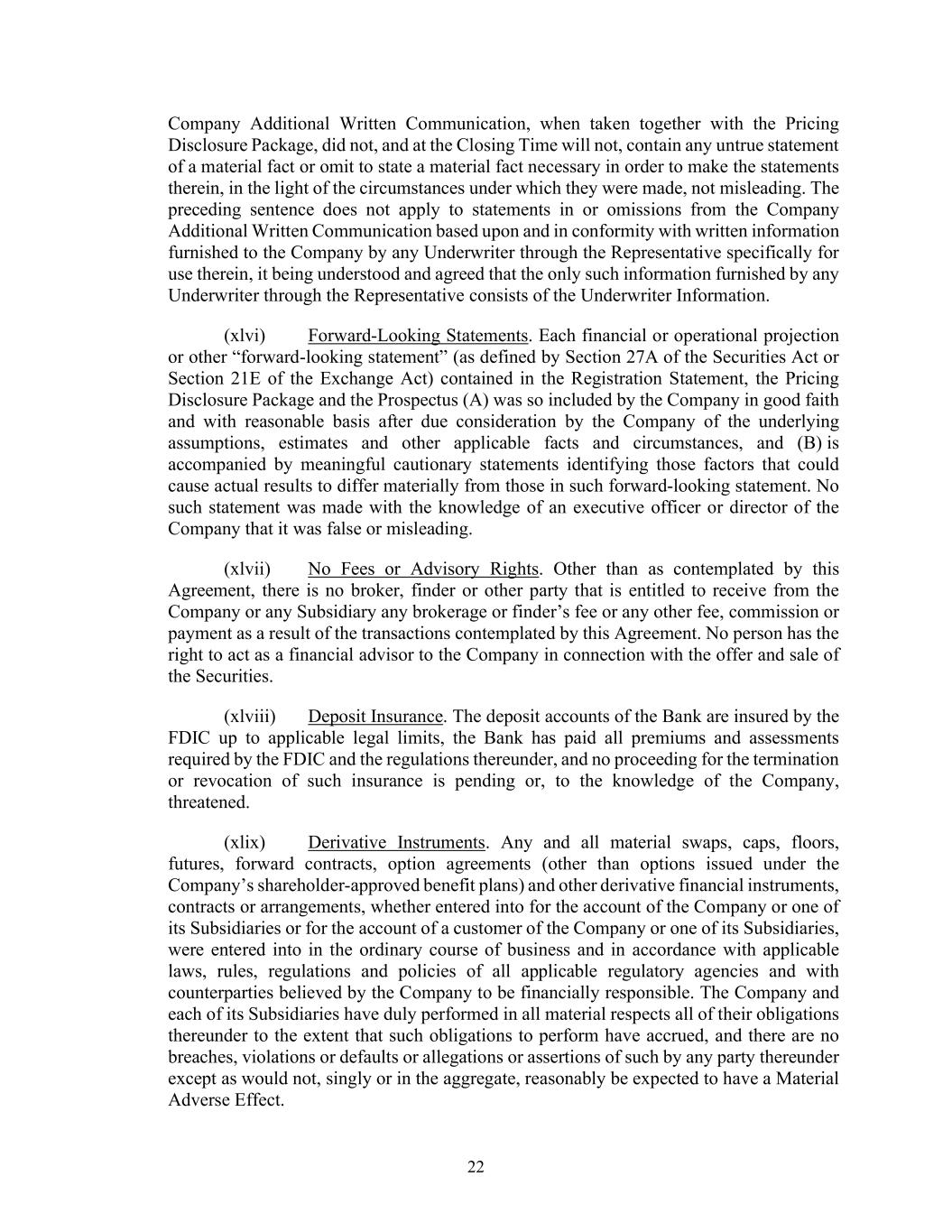 22 Company Additional Written Communication, when taken together with the Pricing Disclosure Package, did not, and at the Closing Time will not, contain any untrue statement of a material fact or omit to state a material fact necessary in order to make the statements therein, in the light of the circumstances under which they were made, not misleading. The preceding sentence does not apply to statements in or omissions from the Company Additional Written Communication based upon and in conformity with written information furnished to the Company by any Underwriter through the Representative specifically for use therein, it being understood and agreed that the only such information furnished by any Underwriter through the Representative consists of the Underwriter Information. (xlvi) Forward-Looking Statements. Each financial or operational projection or other “forward-looking statement” (as defined by Section 27A of the Securities Act or Section 21E of the Exchange Act) contained in the Registration Statement, the Pricing Disclosure Package and the Prospectus (A) was so included by the Company in good faith and with reasonable basis after due consideration by the Company of the underlying assumptions, estimates and other applicable facts and circumstances, and (B) is accompanied by meaningful cautionary statements identifying those factors that could cause actual results to differ materially from those in such forward-looking statement. No such statement was made with the knowledge of an executive officer or director of the Company that it was false or misleading. (xlvii) No Fees or Advisory Rights. Other than as contemplated by this Agreement, there is no broker, finder or other party that is entitled to receive from the Company or any Subsidiary any brokerage or finder’s fee or any other fee, commission or payment as a result of the transactions contemplated by this Agreement. No person has the right to act as a financial advisor to the Company in connection with the offer and sale of the Securities. (xlviii) Deposit Insurance. The deposit accounts of the Bank are insured by the FDIC up to applicable legal limits, the Bank has paid all premiums and assessments required by the FDIC and the regulations thereunder, and no proceeding for the termination or revocation of such insurance is pending or, to the knowledge of the Company, threatened. (xlix) Derivative Instruments. Any and all material swaps, caps, floors, futures, forward contracts, option agreements (other than options issued under the Company’s shareholder-approved benefit plans) and other derivative financial instruments, contracts or arrangements, whether entered into for the account of the Company or one of its Subsidiaries or for the account of a customer of the Company or one of its Subsidiaries, were entered into in the ordinary course of business and in accordance with applicable laws, rules, regulations and policies of all applicable regulatory agencies and with counterparties believed by the Company to be financially responsible. The Company and each of its Subsidiaries have duly performed in all material respects all of their obligations thereunder to the extent that such obligations to perform have accrued, and there are no breaches, violations or defaults or allegations or assertions of such by any party thereunder except as would not, singly or in the aggregate, reasonably be expected to have a Material Adverse Effect.