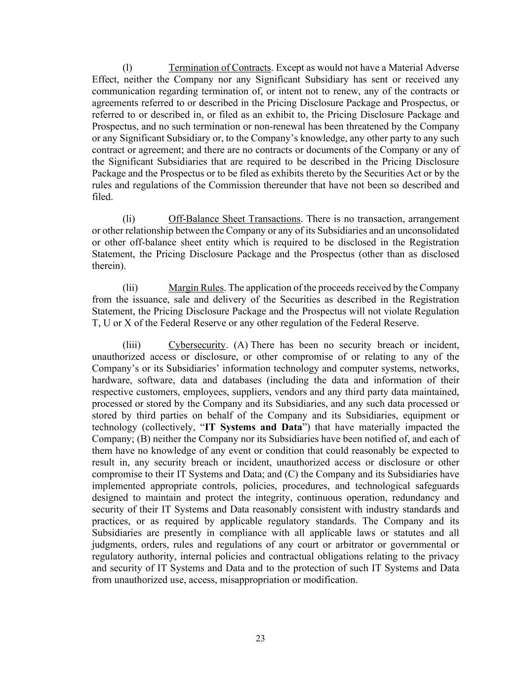 23 (l) Termination of Contracts. Except as would not have a Material Adverse Effect, neither the Company nor any Significant Subsidiary has sent or received any communication regarding termination of, or intent not to renew, any of the contracts or agreements referred to or described in the Pricing Disclosure Package and Prospectus, or referred to or described in, or filed as an exhibit to, the Pricing Disclosure Package and Prospectus, and no such termination or non-renewal has been threatened by the Company or any Significant Subsidiary or, to the Company’s knowledge, any other party to any such contract or agreement; and there are no contracts or documents of the Company or any of the Significant Subsidiaries that are required to be described in the Pricing Disclosure Package and the Prospectus or to be filed as exhibits thereto by the Securities Act or by the rules and regulations of the Commission thereunder that have not been so described and filed. (li) Off-Balance Sheet Transactions. There is no transaction, arrangement or other relationship between the Company or any of its Subsidiaries and an unconsolidated or other off-balance sheet entity which is required to be disclosed in the Registration Statement, the Pricing Disclosure Package and the Prospectus (other than as disclosed therein). (lii) Margin Rules. The application of the proceeds received by the Company from the issuance, sale and delivery of the Securities as described in the Registration Statement, the Pricing Disclosure Package and the Prospectus will not violate Regulation T, U or X of the Federal Reserve or any other regulation of the Federal Reserve. (liii) Cybersecurity. (A) There has been no security breach or incident, unauthorized access or disclosure, or other compromise of or relating to any of the Company’s or its Subsidiaries’ information technology and computer systems, networks, hardware, software, data and databases (including the data and information of their respective customers, employees, suppliers, vendors and any third party data maintained, processed or stored by the Company and its Subsidiaries, and any such data processed or stored by third parties on behalf of the Company and its Subsidiaries, equipment or technology (collectively, “IT Systems and Data”) that have materially impacted the Company; (B) neither the Company nor its Subsidiaries have been notified of, and each of them have no knowledge of any event or condition that could reasonably be expected to result in, any security breach or incident, unauthorized access or disclosure or other compromise to their IT Systems and Data; and (C) the Company and its Subsidiaries have implemented appropriate controls, policies, procedures, and technological safeguards designed to maintain and protect the integrity, continuous operation, redundancy and security of their IT Systems and Data reasonably consistent with industry standards and practices, or as required by applicable regulatory standards. The Company and its Subsidiaries are presently in compliance with all applicable laws or statutes and all judgments, orders, rules and regulations of any court or arbitrator or governmental or regulatory authority, internal policies and contractual obligations relating to the privacy and security of IT Systems and Data and to the protection of such IT Systems and Data from unauthorized use, access, misappropriation or modification.