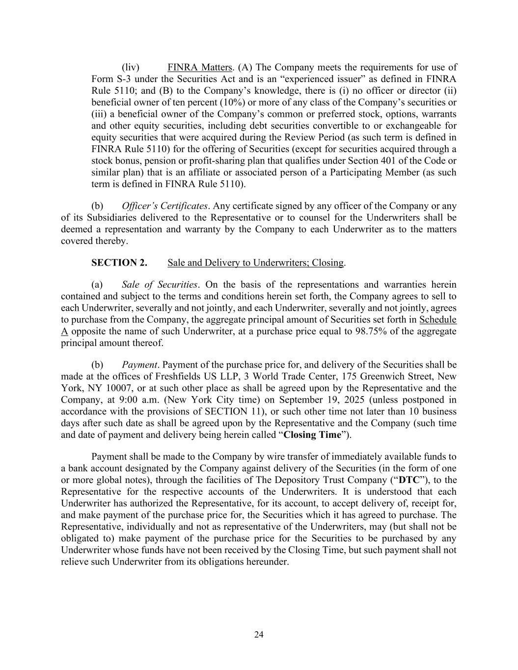 24 (liv) FINRA Matters. (A) The Company meets the requirements for use of Form S-3 under the Securities Act and is an “experienced issuer” as defined in FINRA Rule 5110; and (B) to the Company’s knowledge, there is (i) no officer or director (ii) beneficial owner of ten percent (10%) or more of any class of the Company’s securities or (iii) a beneficial owner of the Company’s common or preferred stock, options, warrants and other equity securities, including debt securities convertible to or exchangeable for equity securities that were acquired during the Review Period (as such term is defined in FINRA Rule 5110) for the offering of Securities (except for securities acquired through a stock bonus, pension or profit-sharing plan that qualifies under Section 401 of the Code or similar plan) that is an affiliate or associated person of a Participating Member (as such term is defined in FINRA Rule 5110). (b) Officer’s Certificates. Any certificate signed by any officer of the Company or any of its Subsidiaries delivered to the Representative or to counsel for the Underwriters shall be deemed a representation and warranty by the Company to each Underwriter as to the matters covered thereby. SECTION 2. Sale and Delivery to Underwriters; Closing. (a) Sale of Securities. On the basis of the representations and warranties herein contained and subject to the terms and conditions herein set forth, the Company agrees to sell to each Underwriter, severally and not jointly, and each Underwriter, severally and not jointly, agrees to purchase from the Company, the aggregate principal amount of Securities set forth in Schedule A opposite the name of such Underwriter, at a purchase price equal to 98.75% of the aggregate principal amount thereof. (b) Payment. Payment of the purchase price for, and delivery of the Securities shall be made at the offices of Freshfields US LLP, 3 World Trade Center, 175 Greenwich Street, New York, NY 10007, or at such other place as shall be agreed upon by the Representative and the Company, at 9:00 a.m. (New York City time) on September 19, 2025 (unless postponed in accordance with the provisions of SECTION 11), or such other time not later than 10 business days after such date as shall be agreed upon by the Representative and the Company (such time and date of payment and delivery being herein called “Closing Time”). Payment shall be made to the Company by wire transfer of immediately available funds to a bank account designated by the Company against delivery of the Securities (in the form of one or more global notes), through the facilities of The Depository Trust Company (“DTC”), to the Representative for the respective accounts of the Underwriters. It is understood that each Underwriter has authorized the Representative, for its account, to accept delivery of, receipt for, and make payment of the purchase price for, the Securities which it has agreed to purchase. The Representative, individually and not as representative of the Underwriters, may (but shall not be obligated to) make payment of the purchase price for the Securities to be purchased by any Underwriter whose funds have not been received by the Closing Time, but such payment shall not relieve such Underwriter from its obligations hereunder.