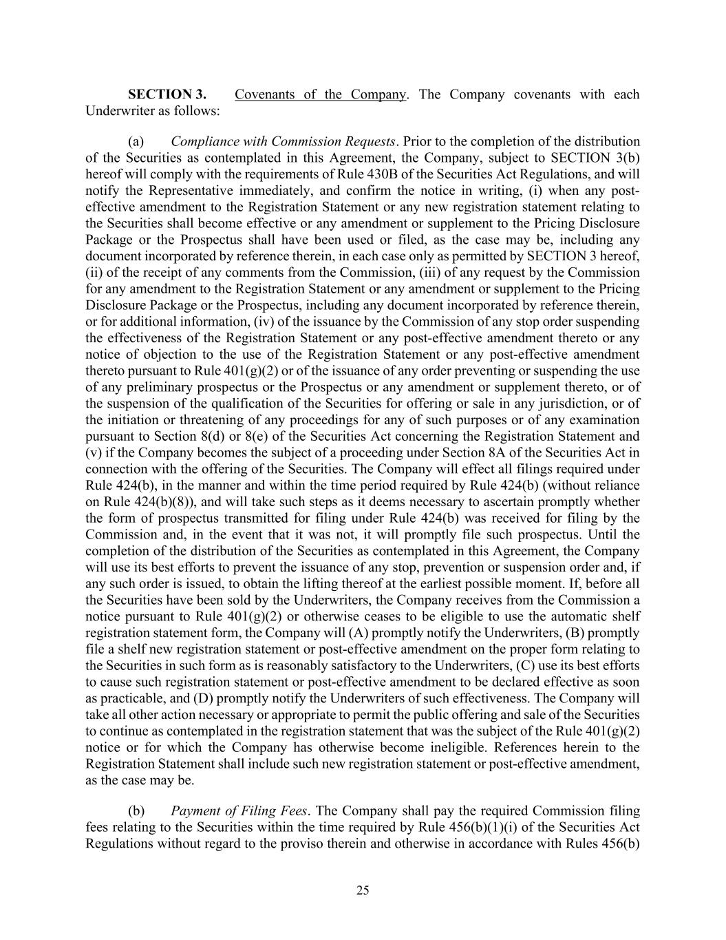 25 SECTION 3. Covenants of the Company. The Company covenants with each Underwriter as follows: (a) Compliance with Commission Requests. Prior to the completion of the distribution of the Securities as contemplated in this Agreement, the Company, subject to SECTION 3(b) hereof will comply with the requirements of Rule 430B of the Securities Act Regulations, and will notify the Representative immediately, and confirm the notice in writing, (i) when any post- effective amendment to the Registration Statement or any new registration statement relating to the Securities shall become effective or any amendment or supplement to the Pricing Disclosure Package or the Prospectus shall have been used or filed, as the case may be, including any document incorporated by reference therein, in each case only as permitted by SECTION 3 hereof, (ii) of the receipt of any comments from the Commission, (iii) of any request by the Commission for any amendment to the Registration Statement or any amendment or supplement to the Pricing Disclosure Package or the Prospectus, including any document incorporated by reference therein, or for additional information, (iv) of the issuance by the Commission of any stop order suspending the effectiveness of the Registration Statement or any post-effective amendment thereto or any notice of objection to the use of the Registration Statement or any post-effective amendment thereto pursuant to Rule 401(g)(2) or of the issuance of any order preventing or suspending the use of any preliminary prospectus or the Prospectus or any amendment or supplement thereto, or of the suspension of the qualification of the Securities for offering or sale in any jurisdiction, or of the initiation or threatening of any proceedings for any of such purposes or of any examination pursuant to Section 8(d) or 8(e) of the Securities Act concerning the Registration Statement and (v) if the Company becomes the subject of a proceeding under Section 8A of the Securities Act in connection with the offering of the Securities. The Company will effect all filings required under Rule 424(b), in the manner and within the time period required by Rule 424(b) (without reliance on Rule 424(b)(8)), and will take such steps as it deems necessary to ascertain promptly whether the form of prospectus transmitted for filing under Rule 424(b) was received for filing by the Commission and, in the event that it was not, it will promptly file such prospectus. Until the completion of the distribution of the Securities as contemplated in this Agreement, the Company will use its best efforts to prevent the issuance of any stop, prevention or suspension order and, if any such order is issued, to obtain the lifting thereof at the earliest possible moment. If, before all the Securities have been sold by the Underwriters, the Company receives from the Commission a notice pursuant to Rule 401(g)(2) or otherwise ceases to be eligible to use the automatic shelf registration statement form, the Company will (A) promptly notify the Underwriters, (B) promptly file a shelf new registration statement or post-effective amendment on the proper form relating to the Securities in such form as is reasonably satisfactory to the Underwriters, (C) use its best efforts to cause such registration statement or post-effective amendment to be declared effective as soon as practicable, and (D) promptly notify the Underwriters of such effectiveness. The Company will take all other action necessary or appropriate to permit the public offering and sale of the Securities to continue as contemplated in the registration statement that was the subject of the Rule 401(g)(2) notice or for which the Company has otherwise become ineligible. References herein to the Registration Statement shall include such new registration statement or post-effective amendment, as the case may be. (b) Payment of Filing Fees. The Company shall pay the required Commission filing fees relating to the Securities within the time required by Rule 456(b)(1)(i) of the Securities Act Regulations without regard to the proviso therein and otherwise in accordance with Rules 456(b)
