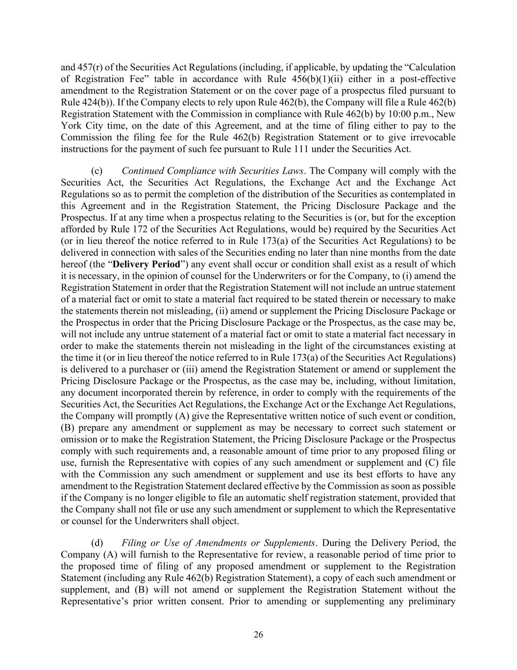 26 and 457(r) of the Securities Act Regulations (including, if applicable, by updating the “Calculation of Registration Fee” table in accordance with Rule 456(b)(1)(ii) either in a post-effective amendment to the Registration Statement or on the cover page of a prospectus filed pursuant to Rule 424(b)). If the Company elects to rely upon Rule 462(b), the Company will file a Rule 462(b) Registration Statement with the Commission in compliance with Rule 462(b) by 10:00 p.m., New York City time, on the date of this Agreement, and at the time of filing either to pay to the Commission the filing fee for the Rule 462(b) Registration Statement or to give irrevocable instructions for the payment of such fee pursuant to Rule 111 under the Securities Act. (c) Continued Compliance with Securities Laws. The Company will comply with the Securities Act, the Securities Act Regulations, the Exchange Act and the Exchange Act Regulations so as to permit the completion of the distribution of the Securities as contemplated in this Agreement and in the Registration Statement, the Pricing Disclosure Package and the Prospectus. If at any time when a prospectus relating to the Securities is (or, but for the exception afforded by Rule 172 of the Securities Act Regulations, would be) required by the Securities Act (or in lieu thereof the notice referred to in Rule 173(a) of the Securities Act Regulations) to be delivered in connection with sales of the Securities ending no later than nine months from the date hereof (the “Delivery Period”) any event shall occur or condition shall exist as a result of which it is necessary, in the opinion of counsel for the Underwriters or for the Company, to (i) amend the Registration Statement in order that the Registration Statement will not include an untrue statement of a material fact or omit to state a material fact required to be stated therein or necessary to make the statements therein not misleading, (ii) amend or supplement the Pricing Disclosure Package or the Prospectus in order that the Pricing Disclosure Package or the Prospectus, as the case may be, will not include any untrue statement of a material fact or omit to state a material fact necessary in order to make the statements therein not misleading in the light of the circumstances existing at the time it (or in lieu thereof the notice referred to in Rule 173(a) of the Securities Act Regulations) is delivered to a purchaser or (iii) amend the Registration Statement or amend or supplement the Pricing Disclosure Package or the Prospectus, as the case may be, including, without limitation, any document incorporated therein by reference, in order to comply with the requirements of the Securities Act, the Securities Act Regulations, the Exchange Act or the Exchange Act Regulations, the Company will promptly (A) give the Representative written notice of such event or condition, (B) prepare any amendment or supplement as may be necessary to correct such statement or omission or to make the Registration Statement, the Pricing Disclosure Package or the Prospectus comply with such requirements and, a reasonable amount of time prior to any proposed filing or use, furnish the Representative with copies of any such amendment or supplement and (C) file with the Commission any such amendment or supplement and use its best efforts to have any amendment to the Registration Statement declared effective by the Commission as soon as possible if the Company is no longer eligible to file an automatic shelf registration statement, provided that the Company shall not file or use any such amendment or supplement to which the Representative or counsel for the Underwriters shall object. (d) Filing or Use of Amendments or Supplements. During the Delivery Period, the Company (A) will furnish to the Representative for review, a reasonable period of time prior to the proposed time of filing of any proposed amendment or supplement to the Registration Statement (including any Rule 462(b) Registration Statement), a copy of each such amendment or supplement, and (B) will not amend or supplement the Registration Statement without the Representative’s prior written consent. Prior to amending or supplementing any preliminary