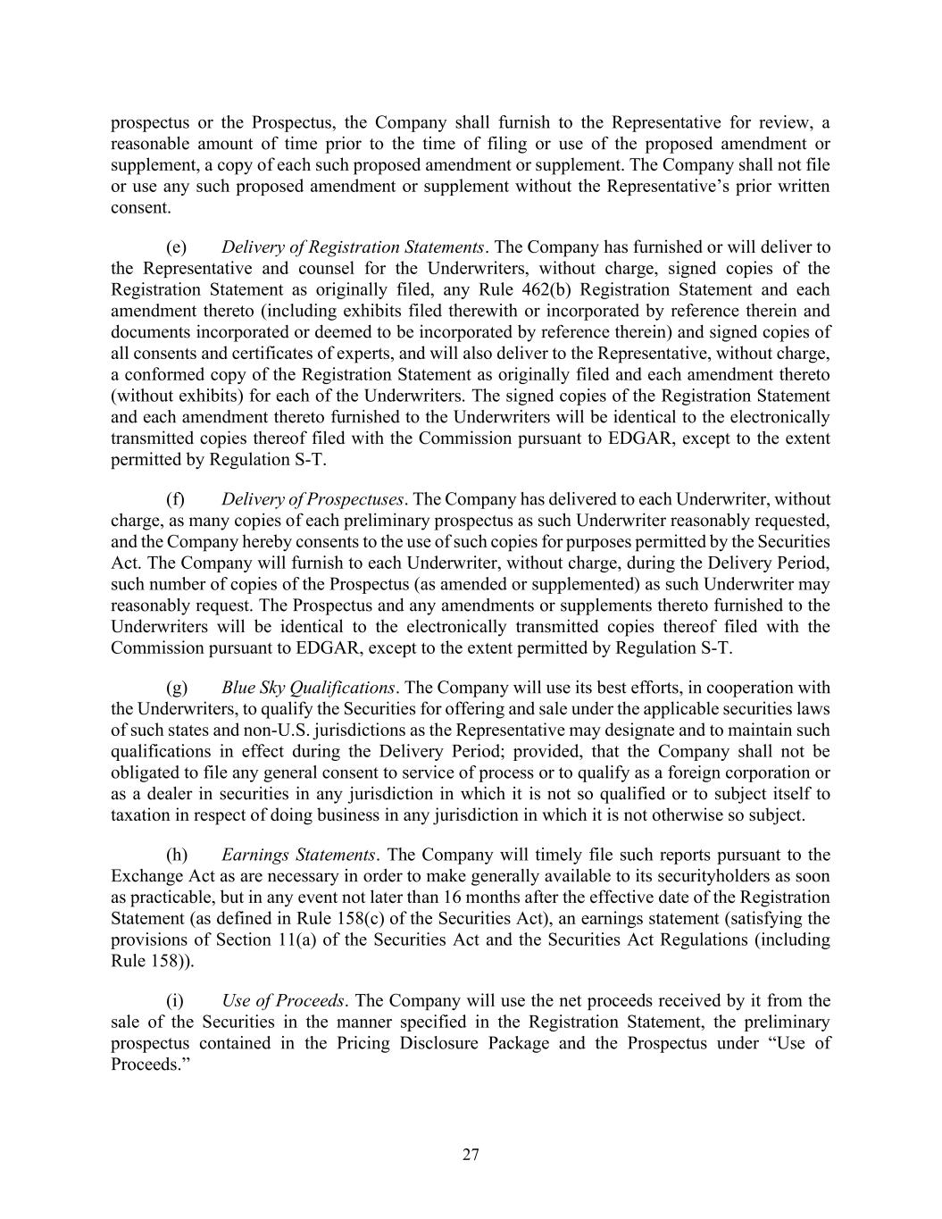 27 prospectus or the Prospectus, the Company shall furnish to the Representative for review, a reasonable amount of time prior to the time of filing or use of the proposed amendment or supplement, a copy of each such proposed amendment or supplement. The Company shall not file or use any such proposed amendment or supplement without the Representative’s prior written consent. (e) Delivery of Registration Statements. The Company has furnished or will deliver to the Representative and counsel for the Underwriters, without charge, signed copies of the Registration Statement as originally filed, any Rule 462(b) Registration Statement and each amendment thereto (including exhibits filed therewith or incorporated by reference therein and documents incorporated or deemed to be incorporated by reference therein) and signed copies of all consents and certificates of experts, and will also deliver to the Representative, without charge, a conformed copy of the Registration Statement as originally filed and each amendment thereto (without exhibits) for each of the Underwriters. The signed copies of the Registration Statement and each amendment thereto furnished to the Underwriters will be identical to the electronically transmitted copies thereof filed with the Commission pursuant to EDGAR, except to the extent permitted by Regulation S-T. (f) Delivery of Prospectuses. The Company has delivered to each Underwriter, without charge, as many copies of each preliminary prospectus as such Underwriter reasonably requested, and the Company hereby consents to the use of such copies for purposes permitted by the Securities Act. The Company will furnish to each Underwriter, without charge, during the Delivery Period, such number of copies of the Prospectus (as amended or supplemented) as such Underwriter may reasonably request. The Prospectus and any amendments or supplements thereto furnished to the Underwriters will be identical to the electronically transmitted copies thereof filed with the Commission pursuant to EDGAR, except to the extent permitted by Regulation S-T. (g) Blue Sky Qualifications. The Company will use its best efforts, in cooperation with the Underwriters, to qualify the Securities for offering and sale under the applicable securities laws of such states and non-U.S. jurisdictions as the Representative may designate and to maintain such qualifications in effect during the Delivery Period; provided, that the Company shall not be obligated to file any general consent to service of process or to qualify as a foreign corporation or as a dealer in securities in any jurisdiction in which it is not so qualified or to subject itself to taxation in respect of doing business in any jurisdiction in which it is not otherwise so subject. (h) Earnings Statements. The Company will timely file such reports pursuant to the Exchange Act as are necessary in order to make generally available to its securityholders as soon as practicable, but in any event not later than 16 months after the effective date of the Registration Statement (as defined in Rule 158(c) of the Securities Act), an earnings statement (satisfying the provisions of Section 11(a) of the Securities Act and the Securities Act Regulations (including Rule 158)). (i) Use of Proceeds. The Company will use the net proceeds received by it from the sale of the Securities in the manner specified in the Registration Statement, the preliminary prospectus contained in the Pricing Disclosure Package and the Prospectus under “Use of Proceeds.”