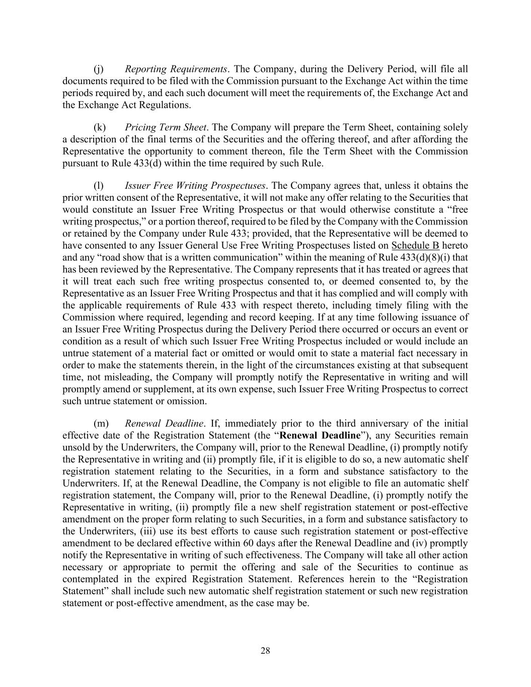 28 (j) Reporting Requirements. The Company, during the Delivery Period, will file all documents required to be filed with the Commission pursuant to the Exchange Act within the time periods required by, and each such document will meet the requirements of, the Exchange Act and the Exchange Act Regulations. (k) Pricing Term Sheet. The Company will prepare the Term Sheet, containing solely a description of the final terms of the Securities and the offering thereof, and after affording the Representative the opportunity to comment thereon, file the Term Sheet with the Commission pursuant to Rule 433(d) within the time required by such Rule. (l) Issuer Free Writing Prospectuses. The Company agrees that, unless it obtains the prior written consent of the Representative, it will not make any offer relating to the Securities that would constitute an Issuer Free Writing Prospectus or that would otherwise constitute a “free writing prospectus,” or a portion thereof, required to be filed by the Company with the Commission or retained by the Company under Rule 433; provided, that the Representative will be deemed to have consented to any Issuer General Use Free Writing Prospectuses listed on Schedule B hereto and any “road show that is a written communication” within the meaning of Rule 433(d)(8)(i) that has been reviewed by the Representative. The Company represents that it has treated or agrees that it will treat each such free writing prospectus consented to, or deemed consented to, by the Representative as an Issuer Free Writing Prospectus and that it has complied and will comply with the applicable requirements of Rule 433 with respect thereto, including timely filing with the Commission where required, legending and record keeping. If at any time following issuance of an Issuer Free Writing Prospectus during the Delivery Period there occurred or occurs an event or condition as a result of which such Issuer Free Writing Prospectus included or would include an untrue statement of a material fact or omitted or would omit to state a material fact necessary in order to make the statements therein, in the light of the circumstances existing at that subsequent time, not misleading, the Company will promptly notify the Representative in writing and will promptly amend or supplement, at its own expense, such Issuer Free Writing Prospectus to correct such untrue statement or omission. (m) Renewal Deadline. If, immediately prior to the third anniversary of the initial effective date of the Registration Statement (the “Renewal Deadline”), any Securities remain unsold by the Underwriters, the Company will, prior to the Renewal Deadline, (i) promptly notify the Representative in writing and (ii) promptly file, if it is eligible to do so, a new automatic shelf registration statement relating to the Securities, in a form and substance satisfactory to the Underwriters. If, at the Renewal Deadline, the Company is not eligible to file an automatic shelf registration statement, the Company will, prior to the Renewal Deadline, (i) promptly notify the Representative in writing, (ii) promptly file a new shelf registration statement or post-effective amendment on the proper form relating to such Securities, in a form and substance satisfactory to the Underwriters, (iii) use its best efforts to cause such registration statement or post-effective amendment to be declared effective within 60 days after the Renewal Deadline and (iv) promptly notify the Representative in writing of such effectiveness. The Company will take all other action necessary or appropriate to permit the offering and sale of the Securities to continue as contemplated in the expired Registration Statement. References herein to the “Registration Statement” shall include such new automatic shelf registration statement or such new registration statement or post-effective amendment, as the case may be.