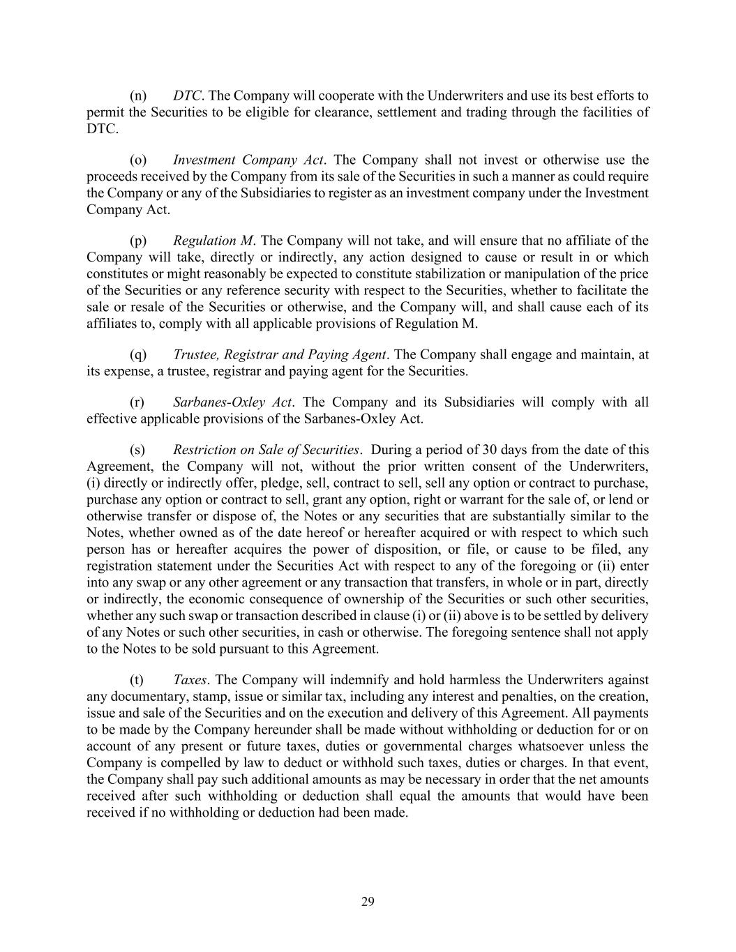 29 (n) DTC. The Company will cooperate with the Underwriters and use its best efforts to permit the Securities to be eligible for clearance, settlement and trading through the facilities of DTC. (o) Investment Company Act. The Company shall not invest or otherwise use the proceeds received by the Company from its sale of the Securities in such a manner as could require the Company or any of the Subsidiaries to register as an investment company under the Investment Company Act. (p) Regulation M. The Company will not take, and will ensure that no affiliate of the Company will take, directly or indirectly, any action designed to cause or result in or which constitutes or might reasonably be expected to constitute stabilization or manipulation of the price of the Securities or any reference security with respect to the Securities, whether to facilitate the sale or resale of the Securities or otherwise, and the Company will, and shall cause each of its affiliates to, comply with all applicable provisions of Regulation M. (q) Trustee, Registrar and Paying Agent. The Company shall engage and maintain, at its expense, a trustee, registrar and paying agent for the Securities. (r) Sarbanes-Oxley Act. The Company and its Subsidiaries will comply with all effective applicable provisions of the Sarbanes-Oxley Act. (s) Restriction on Sale of Securities. During a period of 30 days from the date of this Agreement, the Company will not, without the prior written consent of the Underwriters, (i) directly or indirectly offer, pledge, sell, contract to sell, sell any option or contract to purchase, purchase any option or contract to sell, grant any option, right or warrant for the sale of, or lend or otherwise transfer or dispose of, the Notes or any securities that are substantially similar to the Notes, whether owned as of the date hereof or hereafter acquired or with respect to which such person has or hereafter acquires the power of disposition, or file, or cause to be filed, any registration statement under the Securities Act with respect to any of the foregoing or (ii) enter into any swap or any other agreement or any transaction that transfers, in whole or in part, directly or indirectly, the economic consequence of ownership of the Securities or such other securities, whether any such swap or transaction described in clause (i) or (ii) above is to be settled by delivery of any Notes or such other securities, in cash or otherwise. The foregoing sentence shall not apply to the Notes to be sold pursuant to this Agreement. (t) Taxes. The Company will indemnify and hold harmless the Underwriters against any documentary, stamp, issue or similar tax, including any interest and penalties, on the creation, issue and sale of the Securities and on the execution and delivery of this Agreement. All payments to be made by the Company hereunder shall be made without withholding or deduction for or on account of any present or future taxes, duties or governmental charges whatsoever unless the Company is compelled by law to deduct or withhold such taxes, duties or charges. In that event, the Company shall pay such additional amounts as may be necessary in order that the net amounts received after such withholding or deduction shall equal the amounts that would have been received if no withholding or deduction had been made.