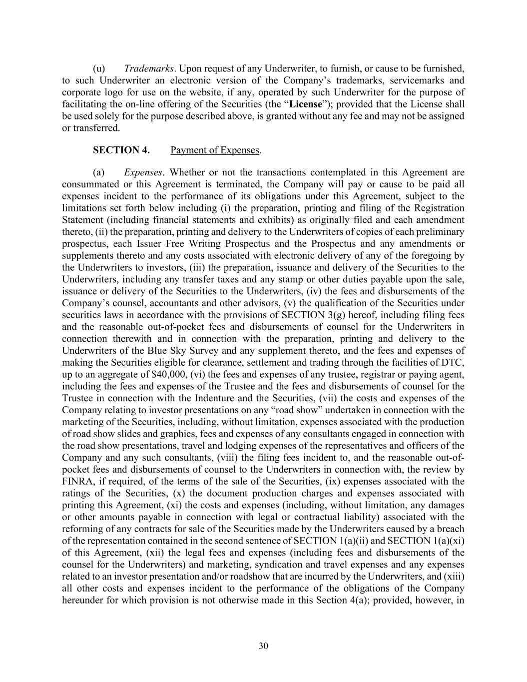 30 (u) Trademarks. Upon request of any Underwriter, to furnish, or cause to be furnished, to such Underwriter an electronic version of the Company’s trademarks, servicemarks and corporate logo for use on the website, if any, operated by such Underwriter for the purpose of facilitating the on-line offering of the Securities (the “License”); provided that the License shall be used solely for the purpose described above, is granted without any fee and may not be assigned or transferred. SECTION 4. Payment of Expenses. (a) Expenses. Whether or not the transactions contemplated in this Agreement are consummated or this Agreement is terminated, the Company will pay or cause to be paid all expenses incident to the performance of its obligations under this Agreement, subject to the limitations set forth below including (i) the preparation, printing and filing of the Registration Statement (including financial statements and exhibits) as originally filed and each amendment thereto, (ii) the preparation, printing and delivery to the Underwriters of copies of each preliminary prospectus, each Issuer Free Writing Prospectus and the Prospectus and any amendments or supplements thereto and any costs associated with electronic delivery of any of the foregoing by the Underwriters to investors, (iii) the preparation, issuance and delivery of the Securities to the Underwriters, including any transfer taxes and any stamp or other duties payable upon the sale, issuance or delivery of the Securities to the Underwriters, (iv) the fees and disbursements of the Company’s counsel, accountants and other advisors, (v) the qualification of the Securities under securities laws in accordance with the provisions of SECTION 3(g) hereof, including filing fees and the reasonable out-of-pocket fees and disbursements of counsel for the Underwriters in connection therewith and in connection with the preparation, printing and delivery to the Underwriters of the Blue Sky Survey and any supplement thereto, and the fees and expenses of making the Securities eligible for clearance, settlement and trading through the facilities of DTC, up to an aggregate of $40,000, (vi) the fees and expenses of any trustee, registrar or paying agent, including the fees and expenses of the Trustee and the fees and disbursements of counsel for the Trustee in connection with the Indenture and the Securities, (vii) the costs and expenses of the Company relating to investor presentations on any “road show” undertaken in connection with the marketing of the Securities, including, without limitation, expenses associated with the production of road show slides and graphics, fees and expenses of any consultants engaged in connection with the road show presentations, travel and lodging expenses of the representatives and officers of the Company and any such consultants, (viii) the filing fees incident to, and the reasonable out-of- pocket fees and disbursements of counsel to the Underwriters in connection with, the review by FINRA, if required, of the terms of the sale of the Securities, (ix) expenses associated with the ratings of the Securities, (x) the document production charges and expenses associated with printing this Agreement, (xi) the costs and expenses (including, without limitation, any damages or other amounts payable in connection with legal or contractual liability) associated with the reforming of any contracts for sale of the Securities made by the Underwriters caused by a breach of the representation contained in the second sentence of SECTION 1(a)(ii) and SECTION 1(a)(xi) of this Agreement, (xii) the legal fees and expenses (including fees and disbursements of the counsel for the Underwriters) and marketing, syndication and travel expenses and any expenses related to an investor presentation and/or roadshow that are incurred by the Underwriters, and (xiii) all other costs and expenses incident to the performance of the obligations of the Company hereunder for which provision is not otherwise made in this Section 4(a); provided, however, in